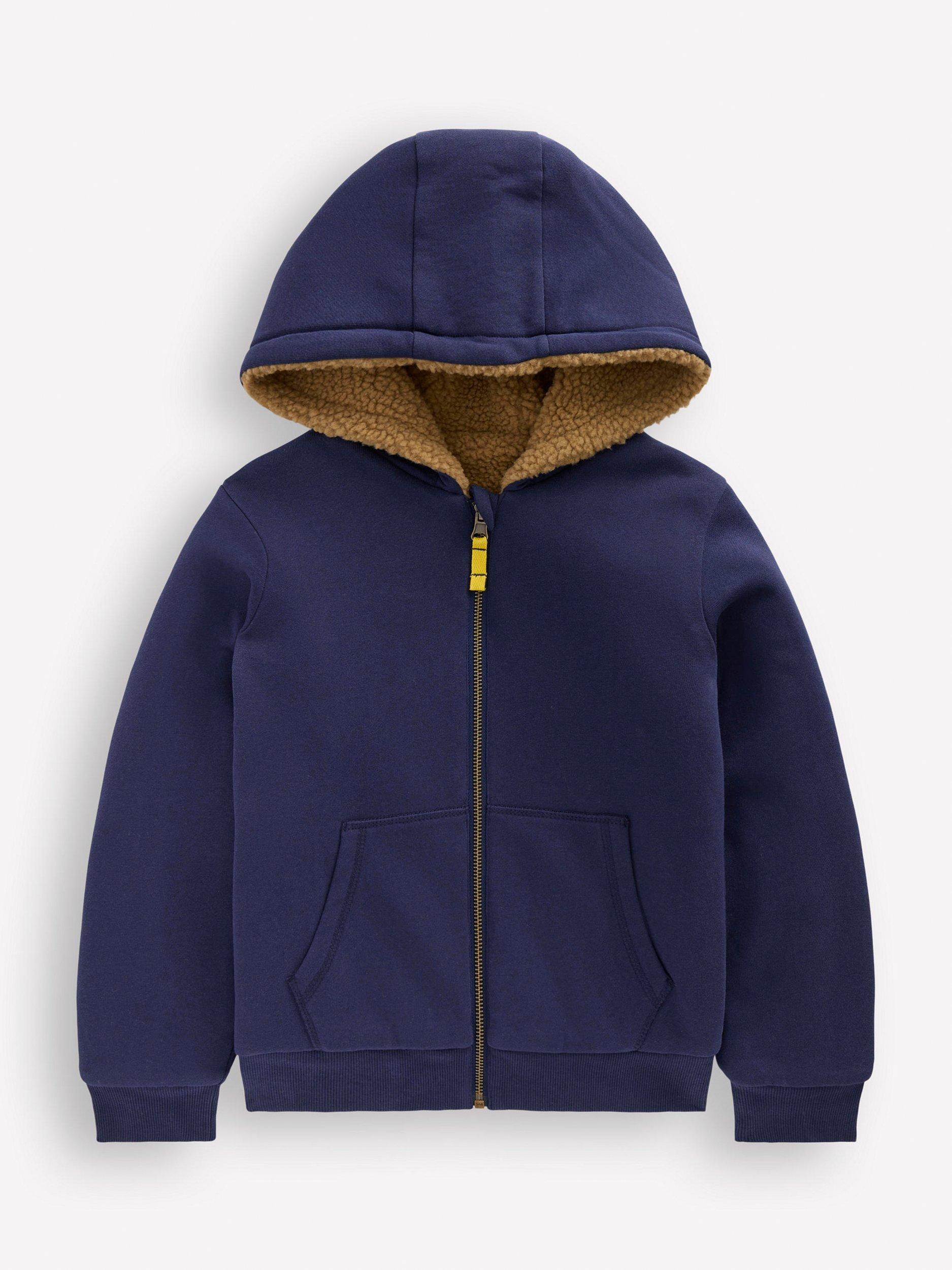 This nifty two-in-one borg jacket from Mini Boden is designed with a fixed hood, zip fastening and patch pockets.