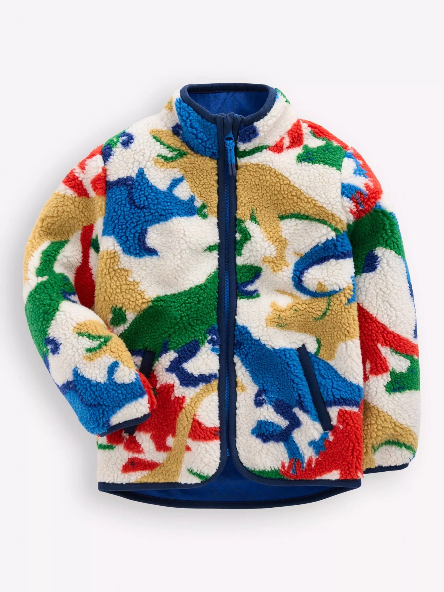 This borg jacket from Mini Boden has everything little ones need to stay warm including a high neck, pockets and a dippy hem at the back. Deigned with an all-over dinosaur pattern.