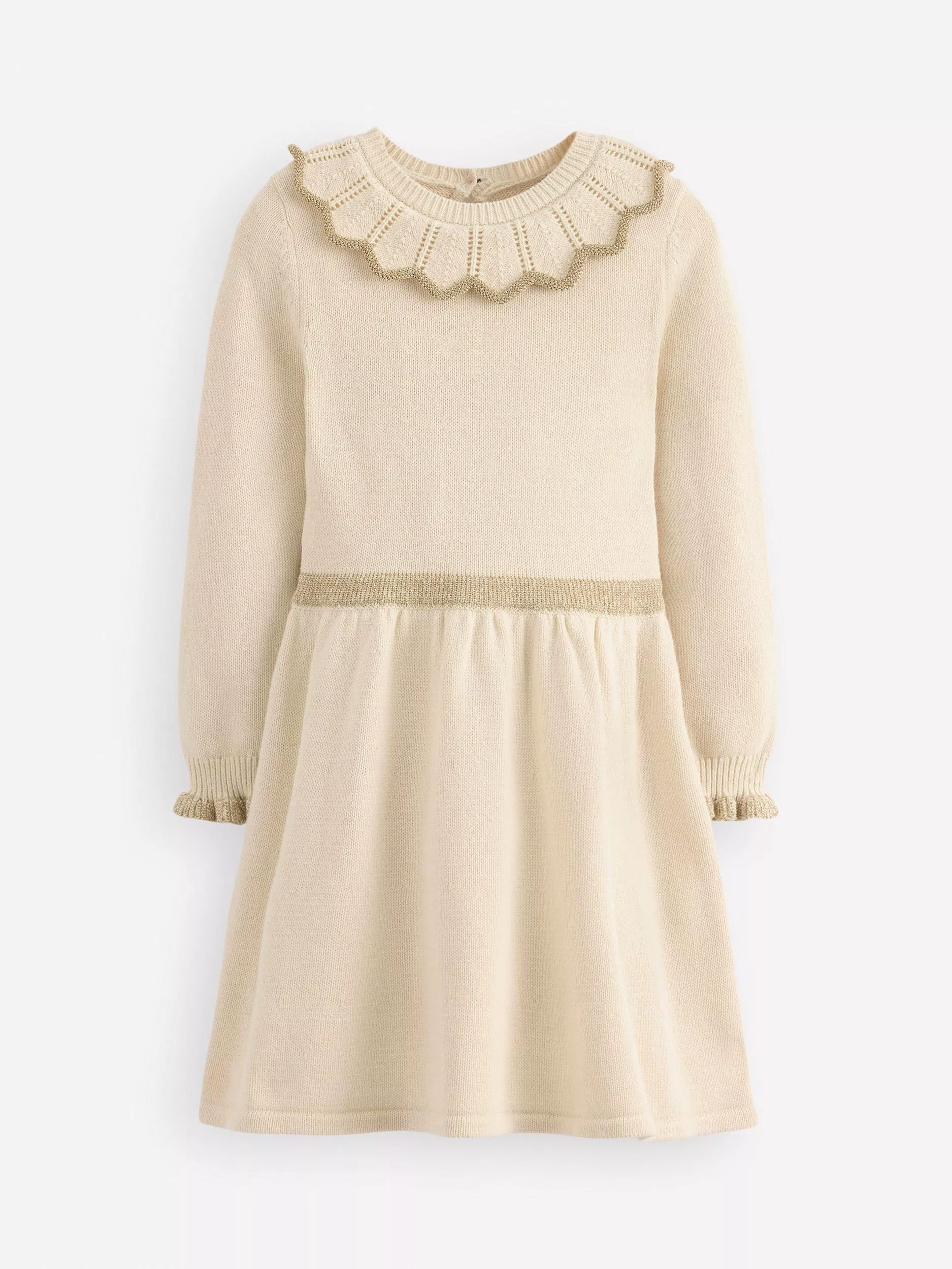 A knitted dress for tiny dancers. It's soft and comfy yet structured with pointelle stitching and a gold waistband. The collar is finished with a sparkly stardust trim.