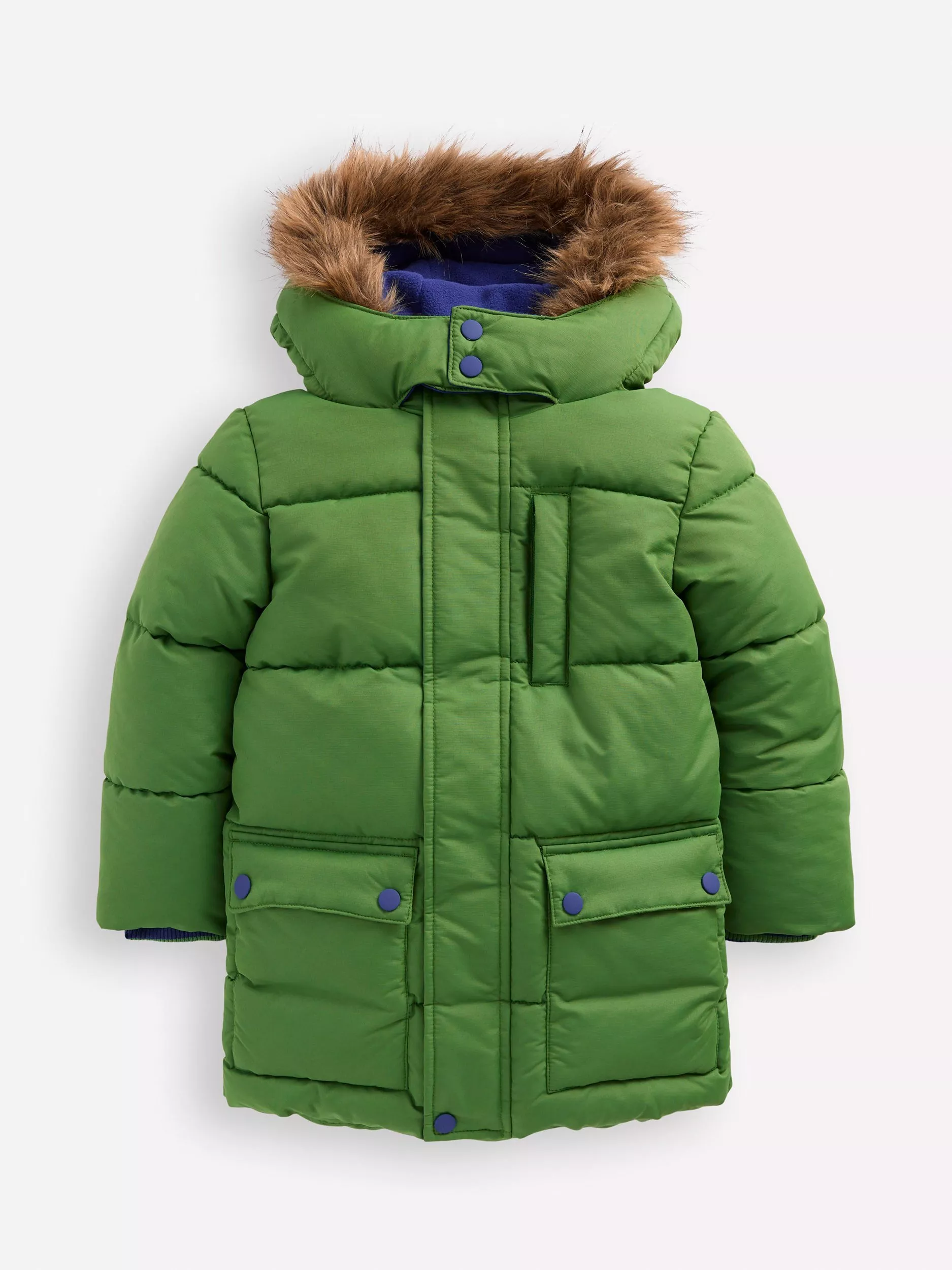 When it comes to staying warm, this hooded padded coat has a few tricks up its sleeves. Designed with a snuggly soft fleece lining, a funnel neck and detachable faux-fur trim, plus roomy pockets fit for plenty of snacks.