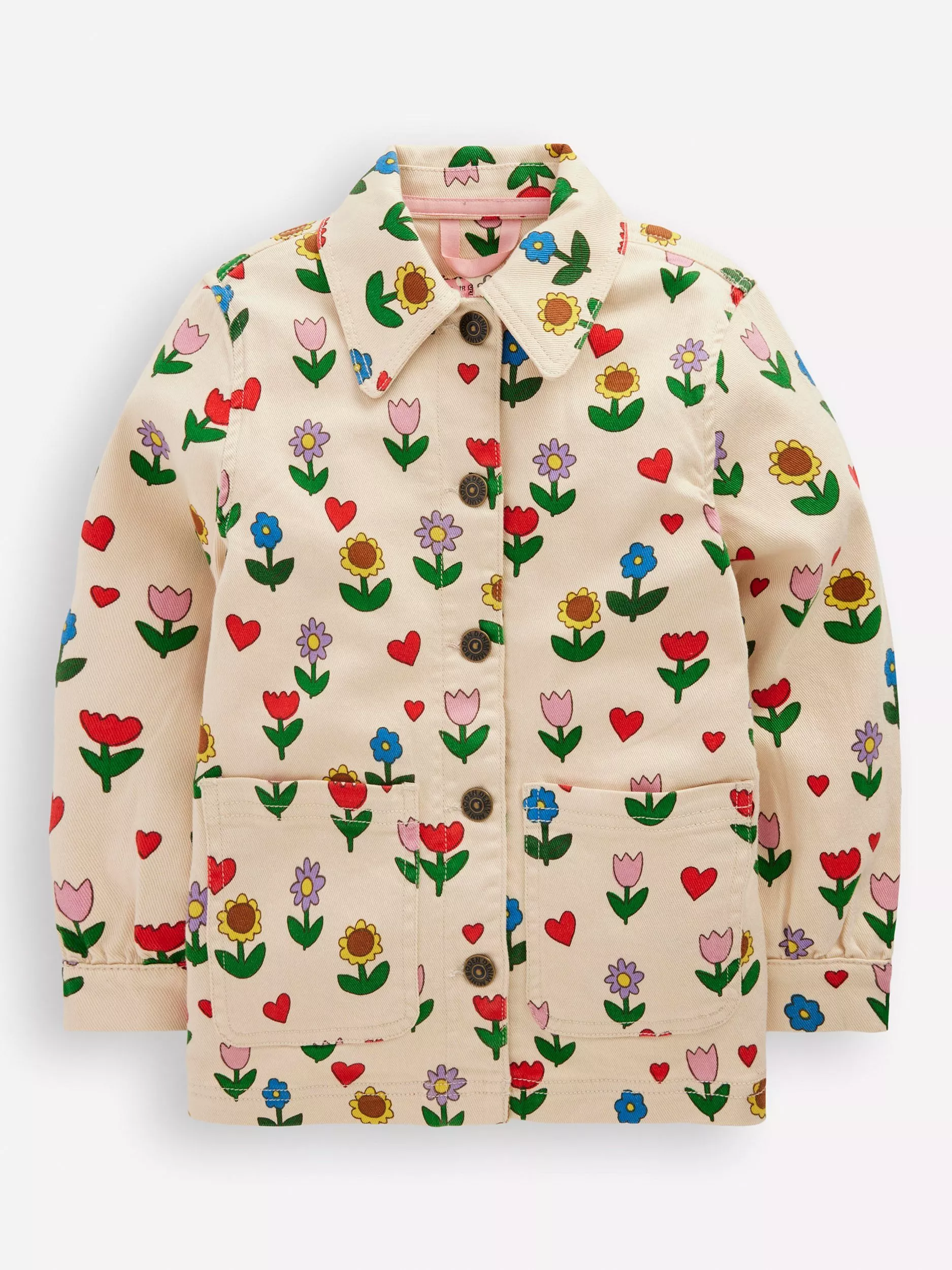 A classic style denim jacket with a collar and patch pockets, but in a colourful, flower design.