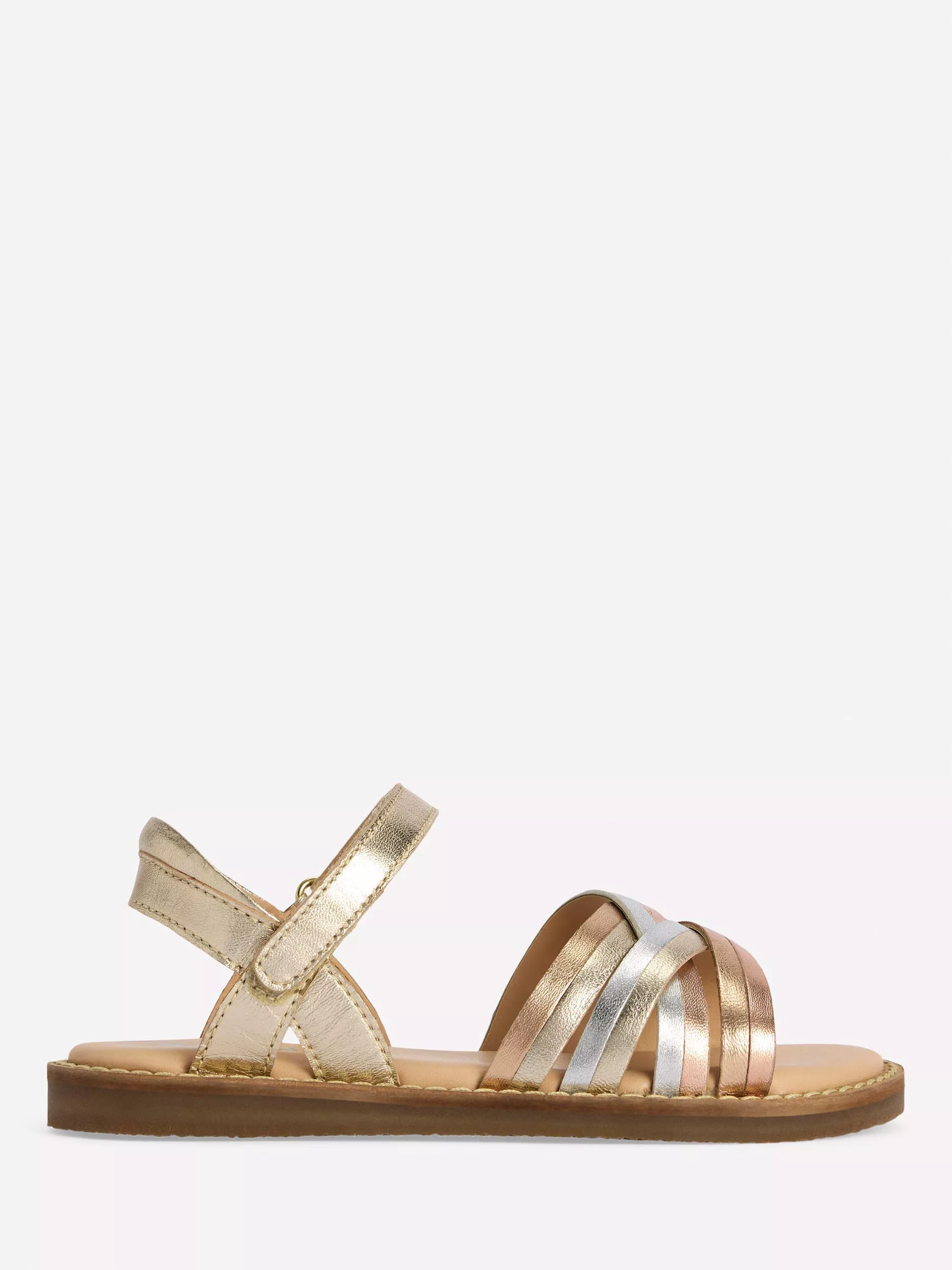 With their shiny metallic cross-over straps, these long-lasting leather sandals are great for special occasions or just adding some sparkle to every day summer fun.