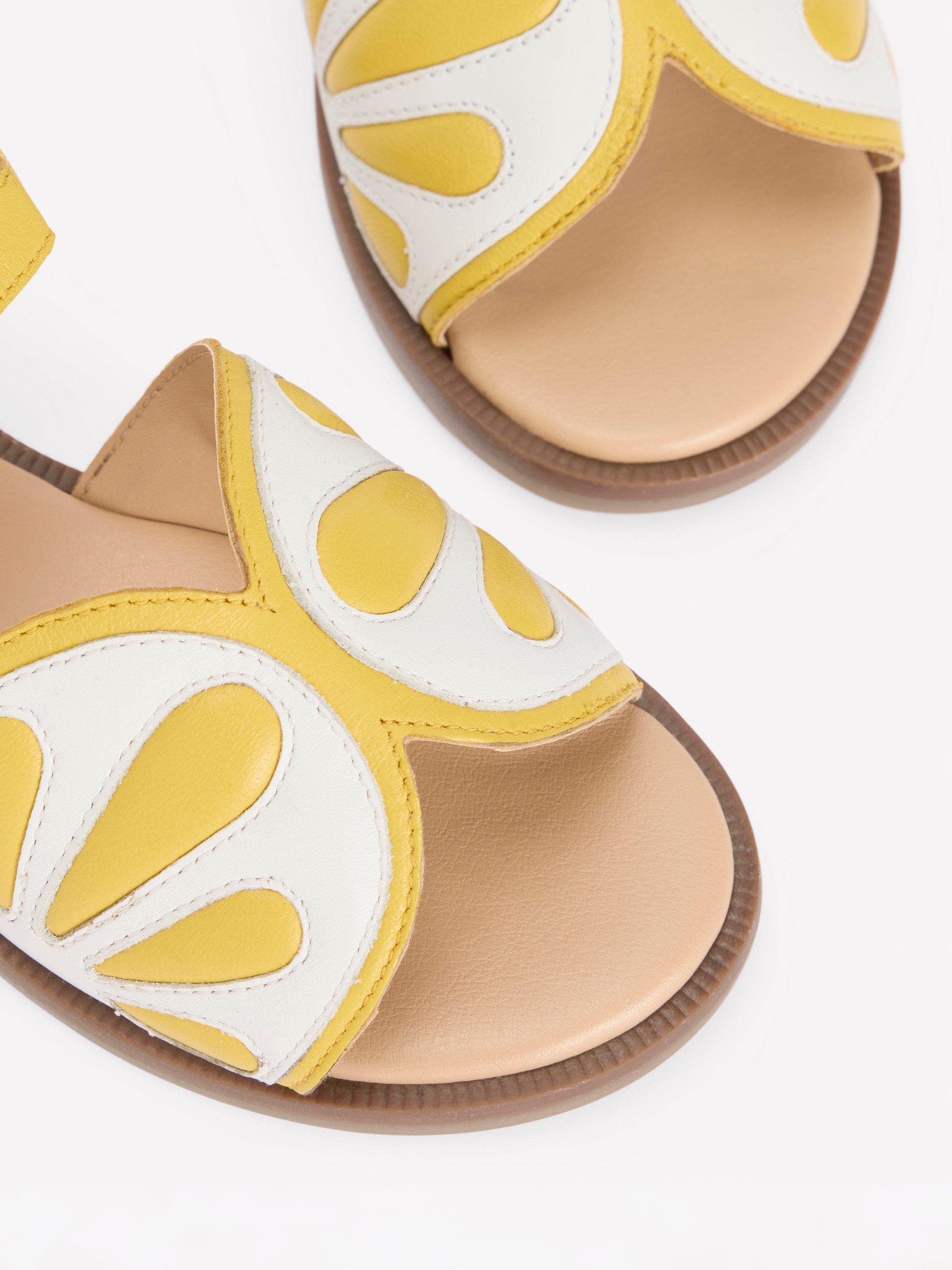These exciting sandals are made with hard wearing leather and have easy Velcro fastenings with open toes. Designed in a playful lemon style, perfect for summer.