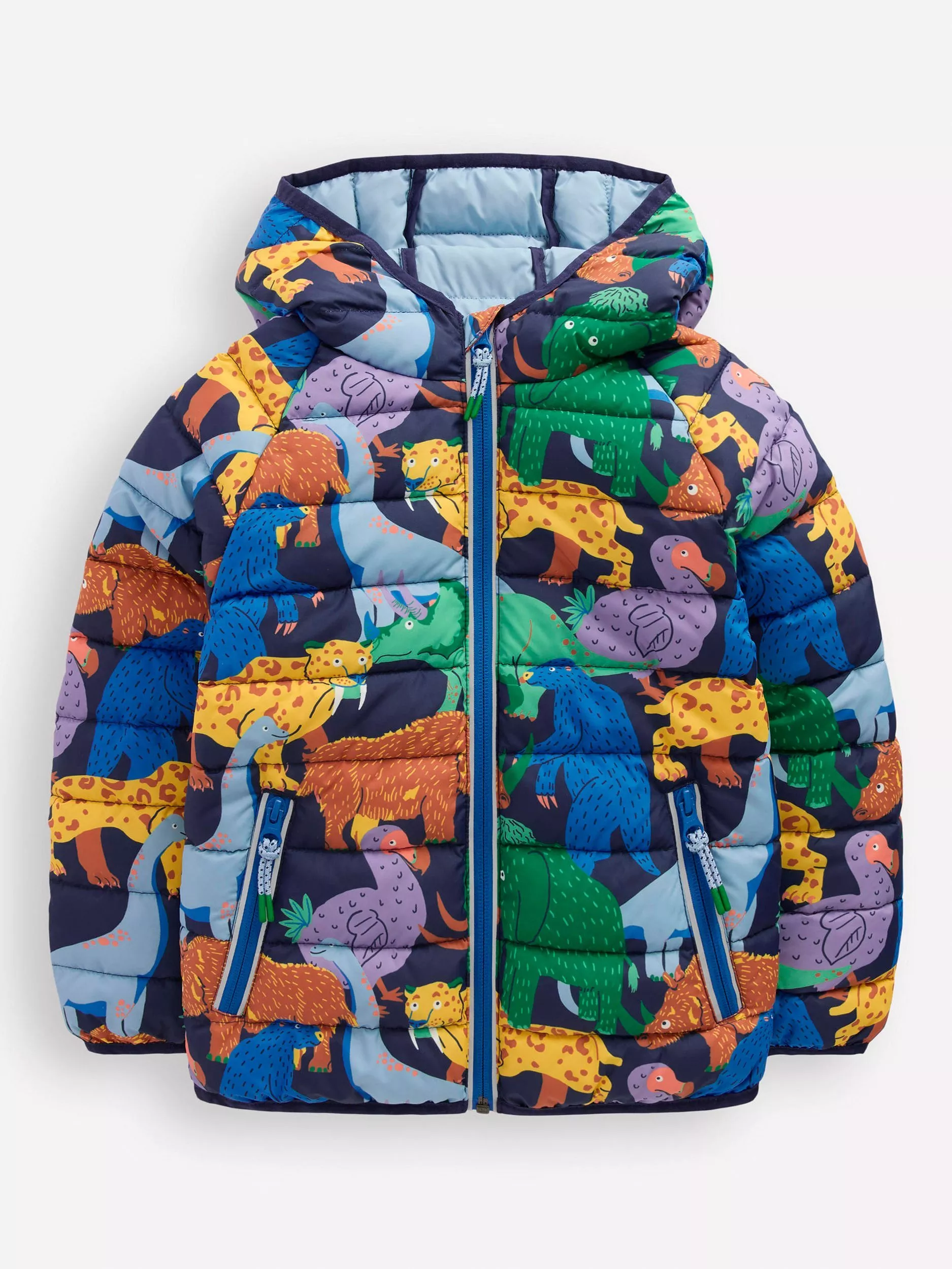 Lightweight and quilted, this hooded jacket, designed with rope zip pulls, packs away into a neat Velcro bag. Ready for when the rain joins in with Minis adventures.