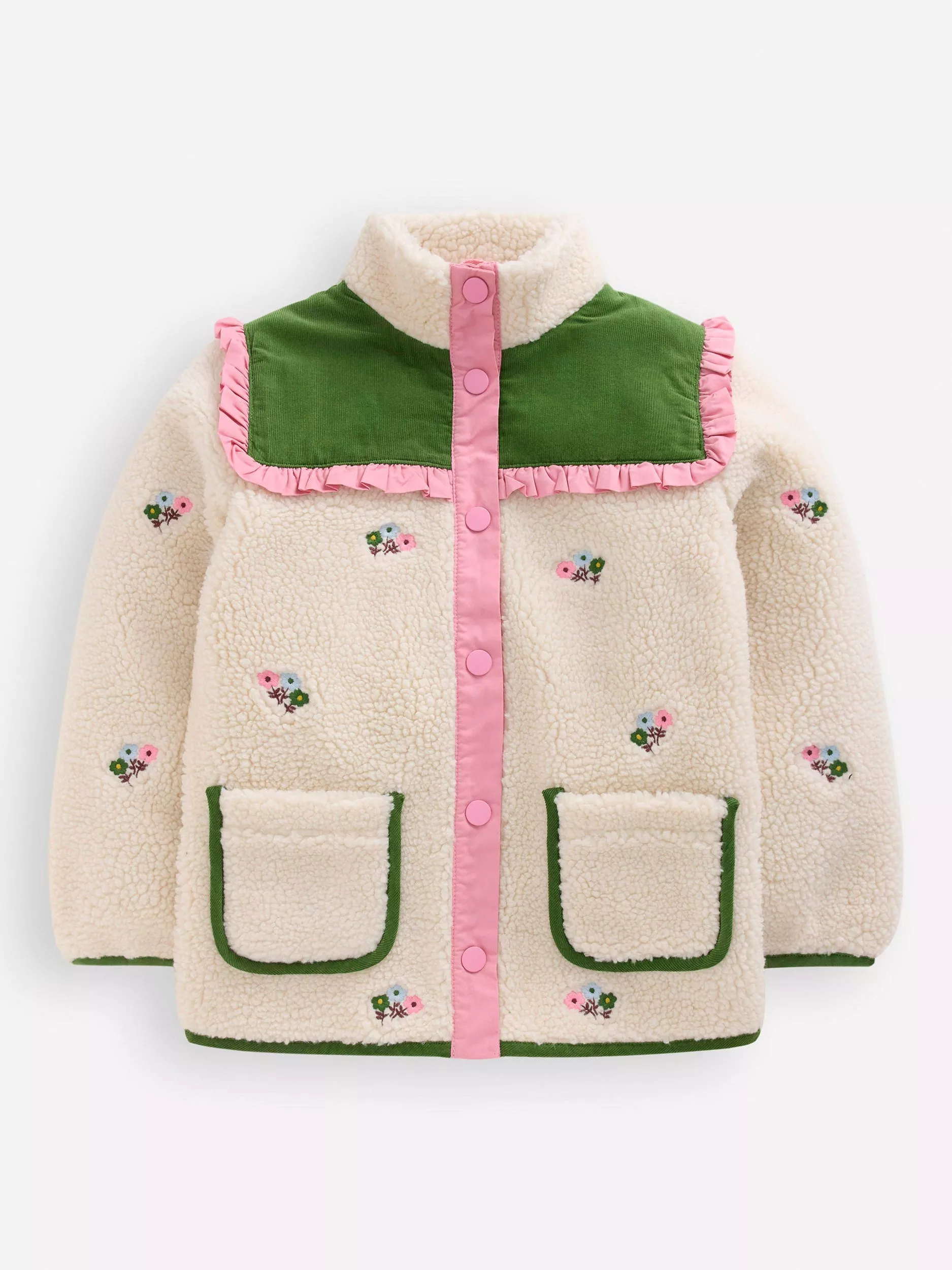This pretty jacket is an adorable way to stay cosy. It’s made from snuggly borg with contrasting cord at the top. Finished off with frills, ditsy flowers and patch pockets.