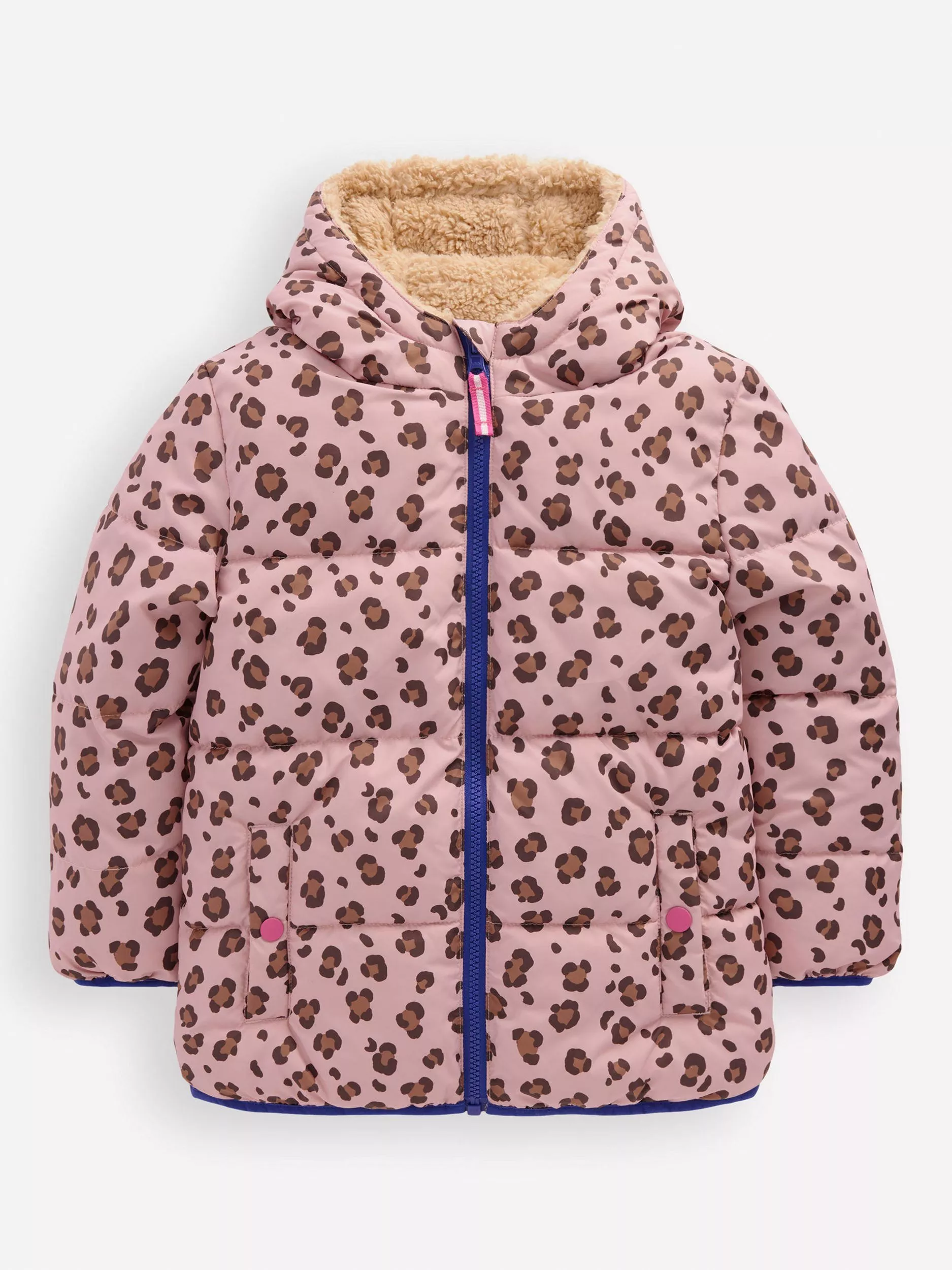 A reversible hooded jacket ready for climbing, jumping and exploring, no matter what the weather brings. They can switch between a animal print or cosy borg – both sides have handy pockets, and there's a contrast metallic patch pocket on the snuggly one.