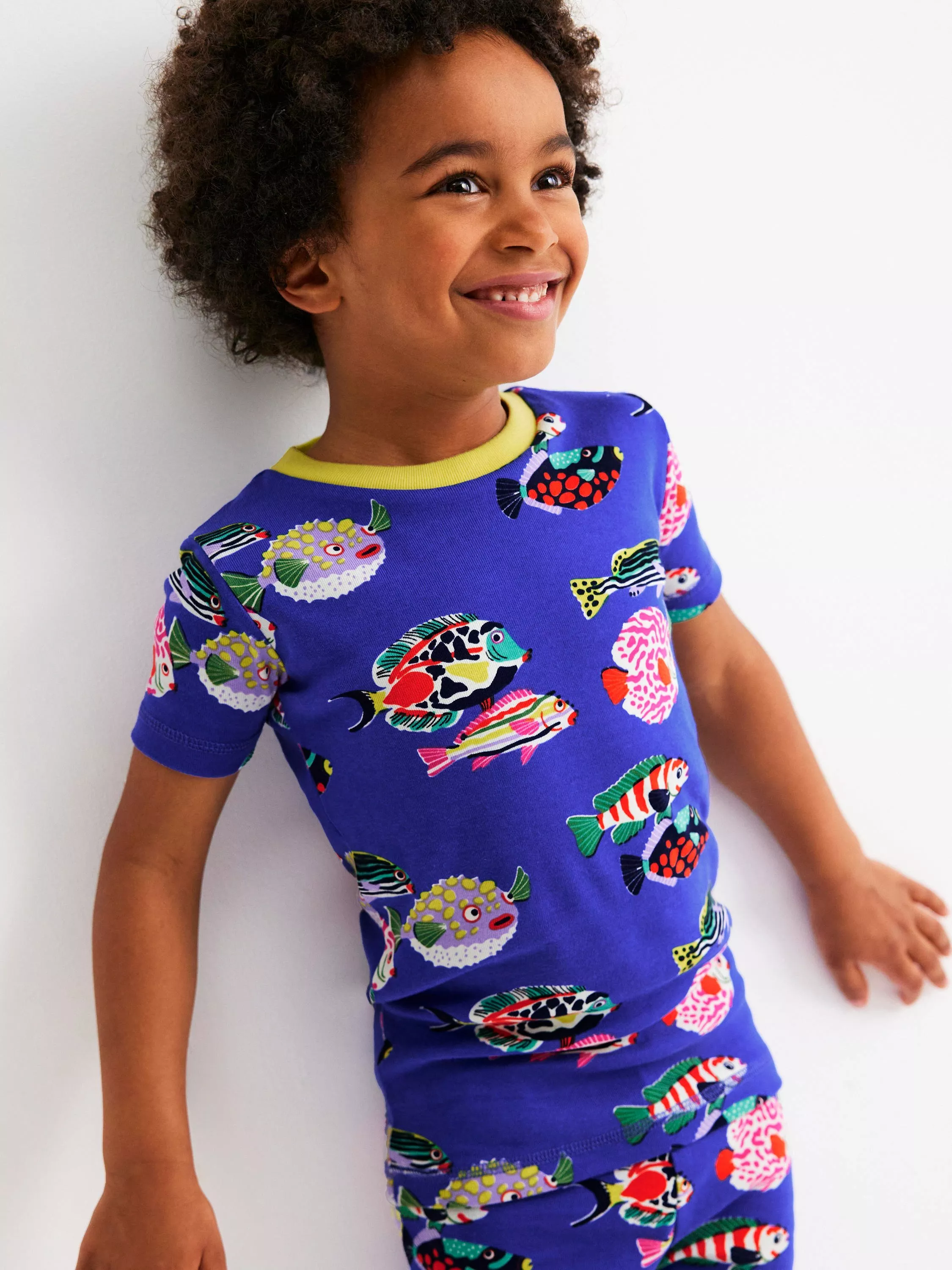 A super-soft pyjama set from Mini Boden, with a crew-neck T-shirt and elasticated shorts. Designed with a fun all-over fish print.