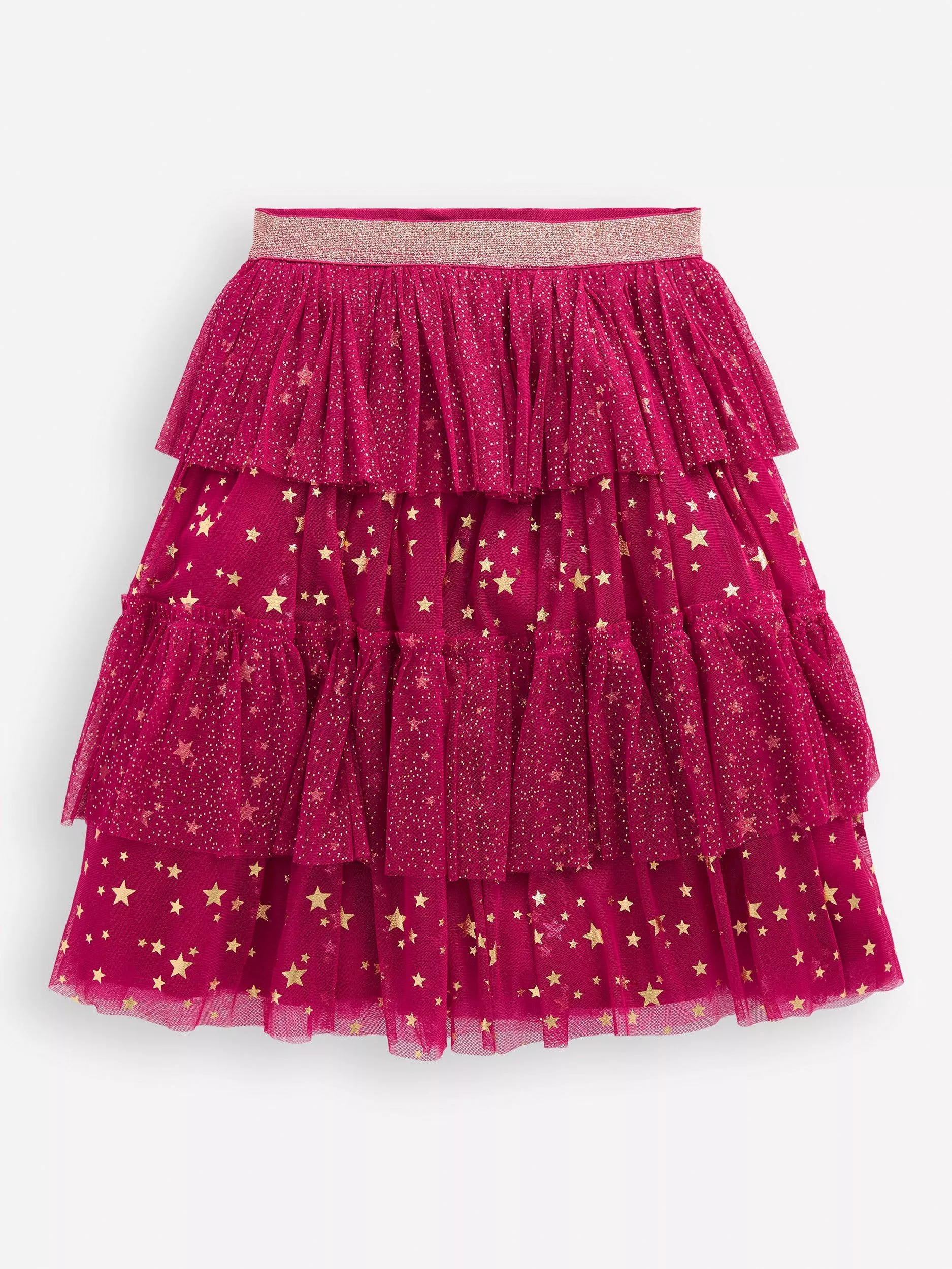 Making magic happen is no tulle order in this skirt. What could be more enchanting than tiers of ruffly tulle decorated with stars? The midi-length adds drama to giddy twirls while the sparkly gold waistband demands attention.