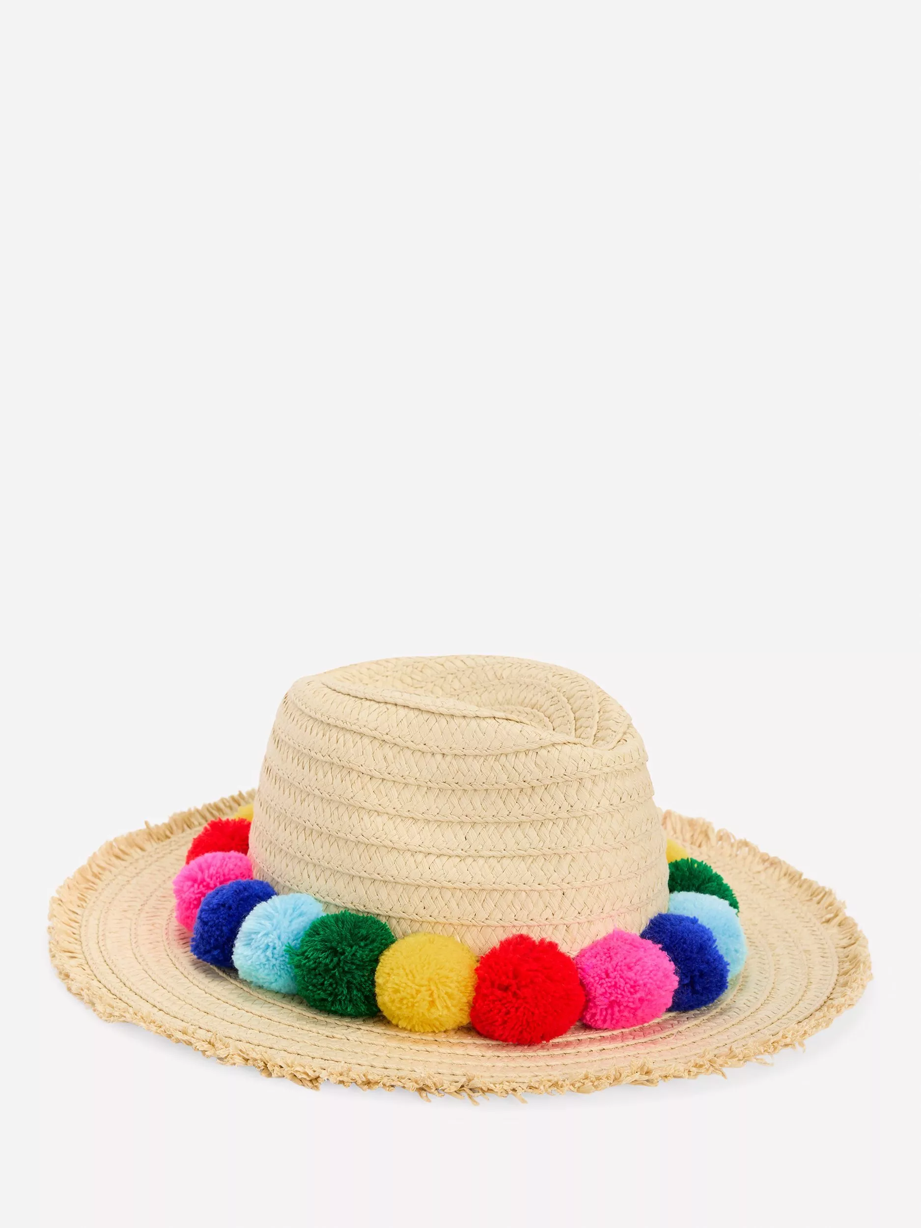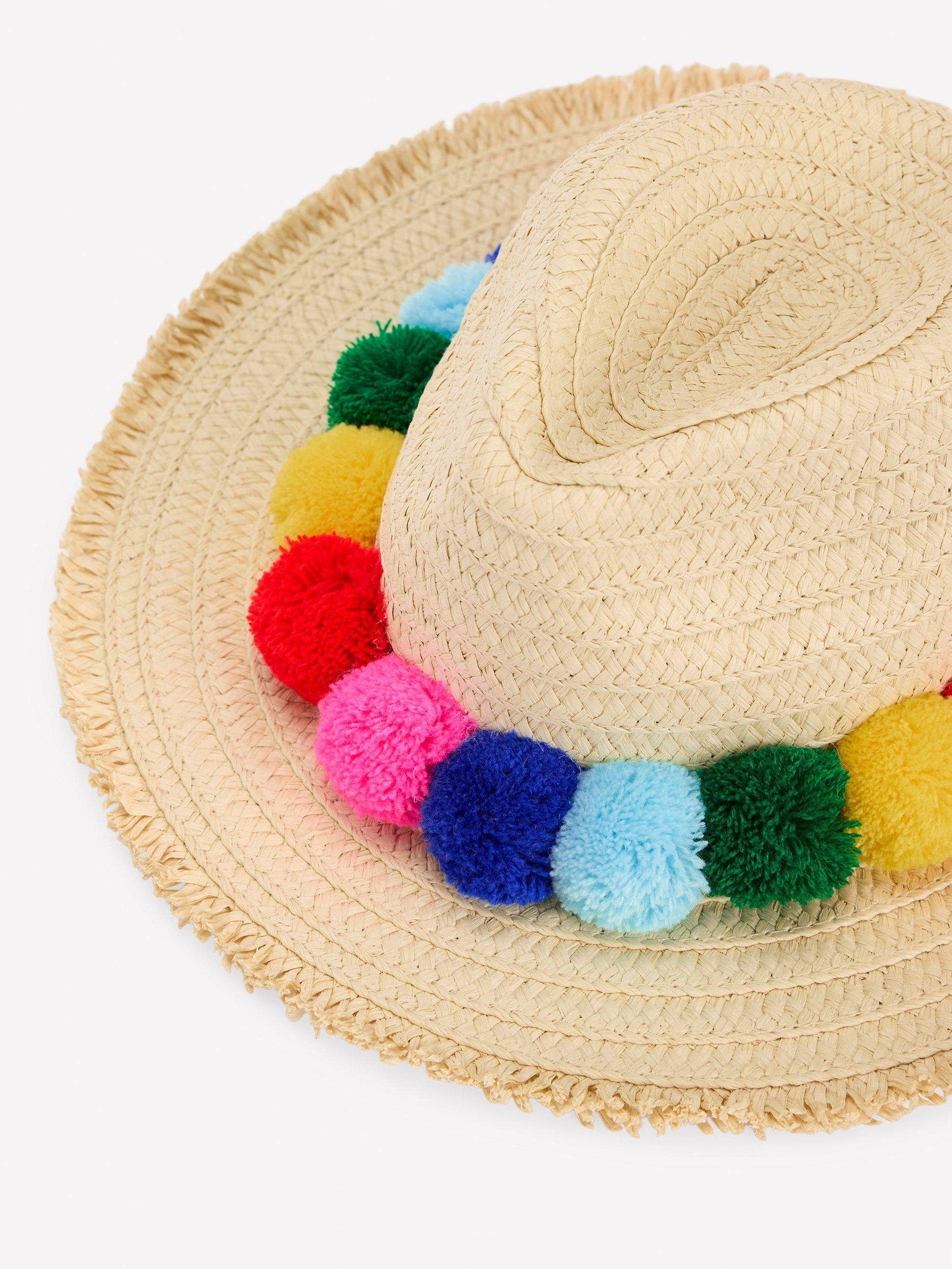 The bright colourful pom-poms might catch Minis out playing hide and seek, but this wide-brimmed hat was made to show off building sandcastles or eating jam sandwiches at picnics.