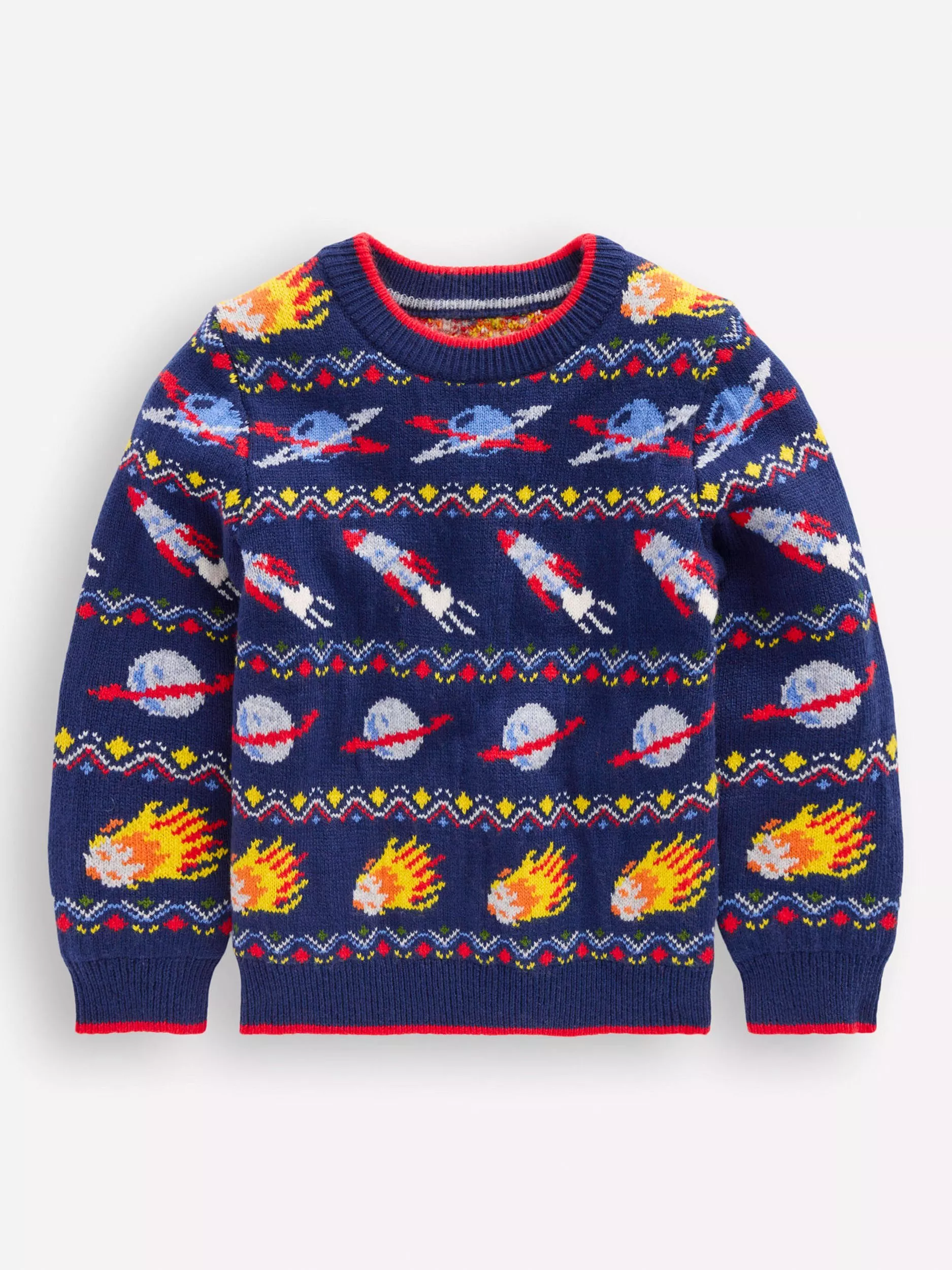 Crafted from a cosy wool blend, this snuggly jumper features a classic round neck, long sleeves, ribbed cuffs, and colourful space patterns.
