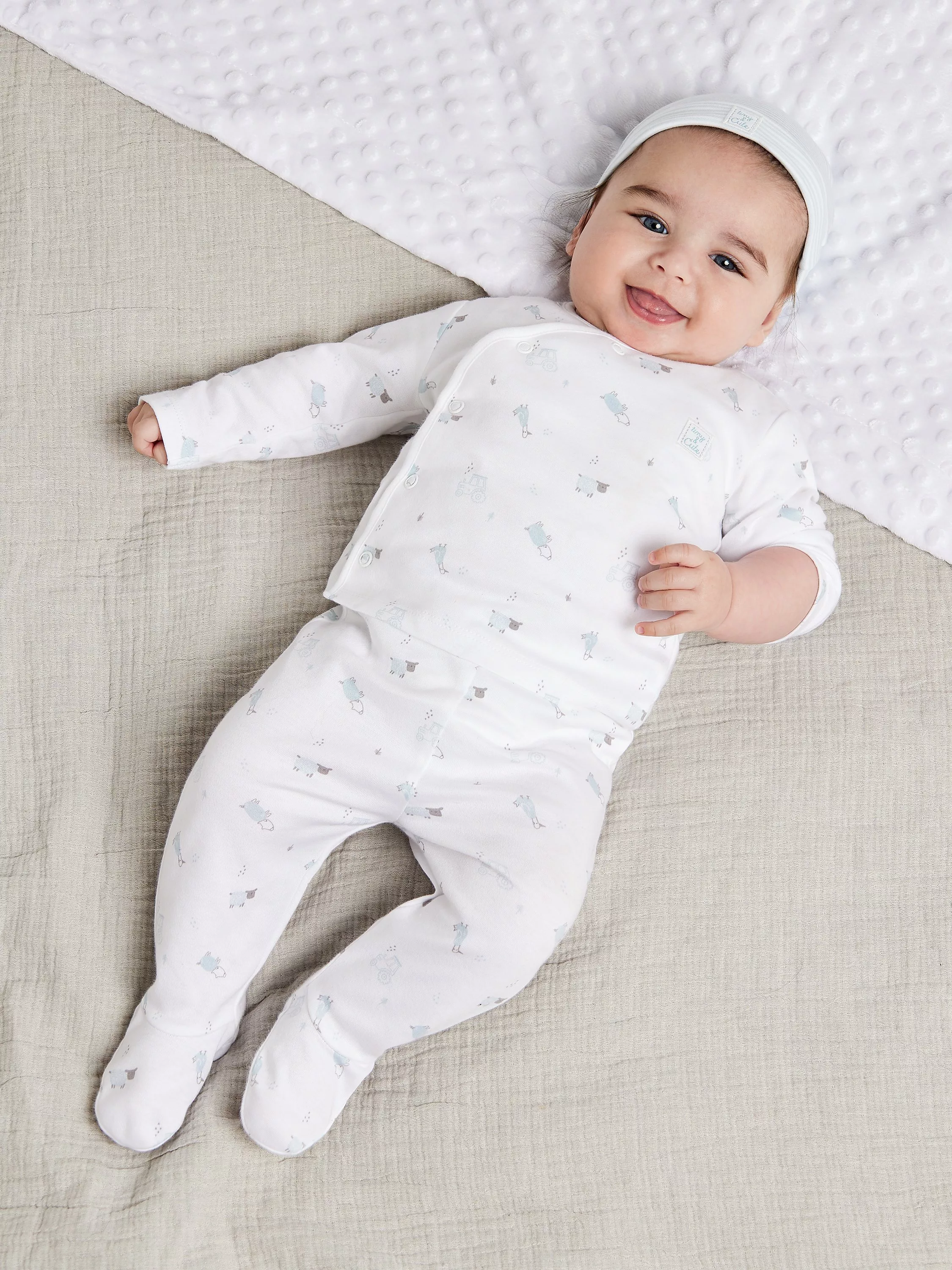 Including a front-open top, sleepsuit, footed jogger, cap and mittens, the soft palette and sweet print finish the set with adorable appeal. The high-quality snap buttons make for easy dressing and additional grown on scratch mittens keep baby comfy.