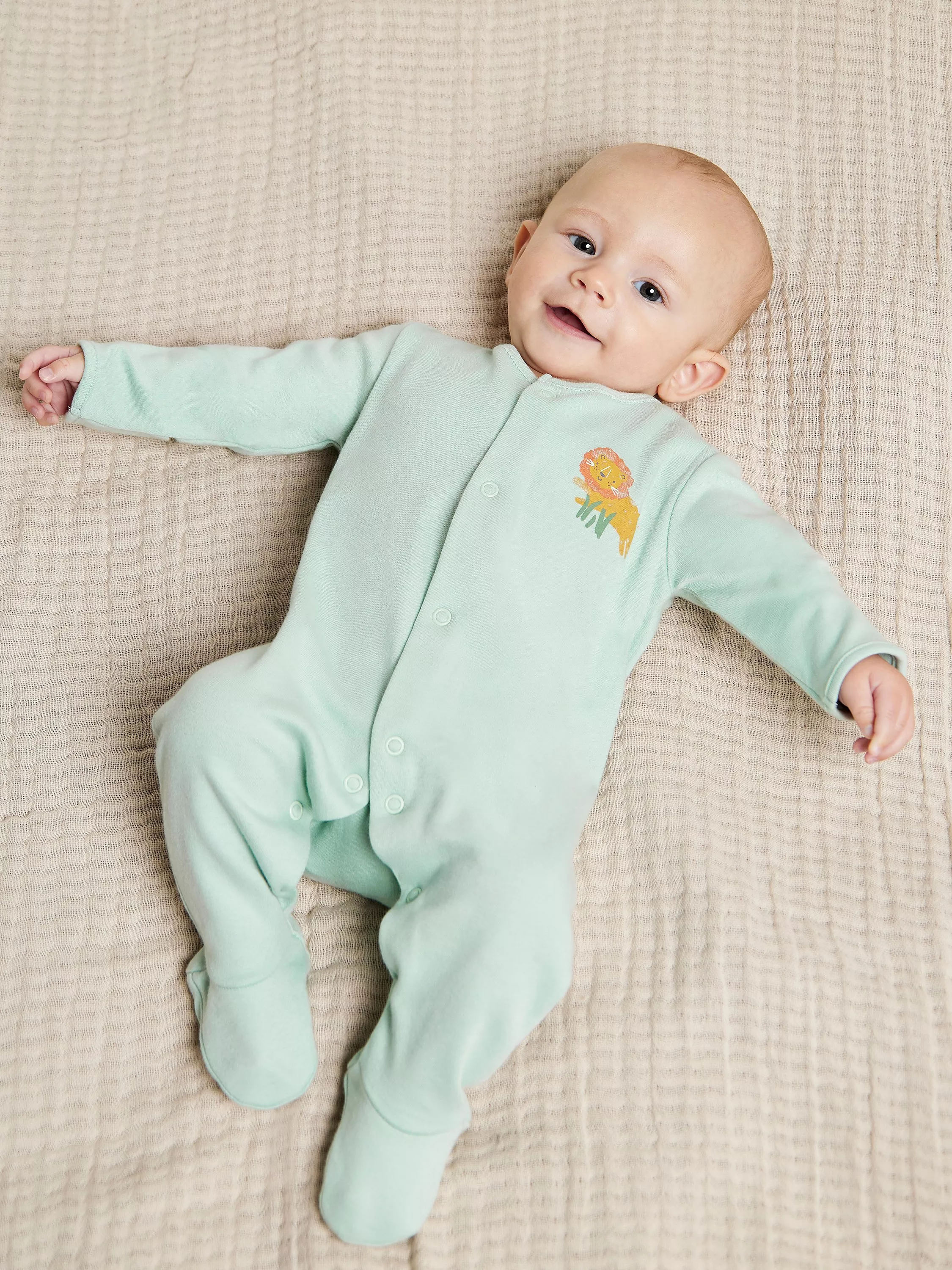 A pack of two sleepsuits, made from super-soft cotton. In a safari theme, one features an all-over animal print and the other is plain, with a lion print on the chest. The front popper openings on both will help you with quick changes, and there are built-in scratch mitts on the smaller sizes to protect tiny hands.