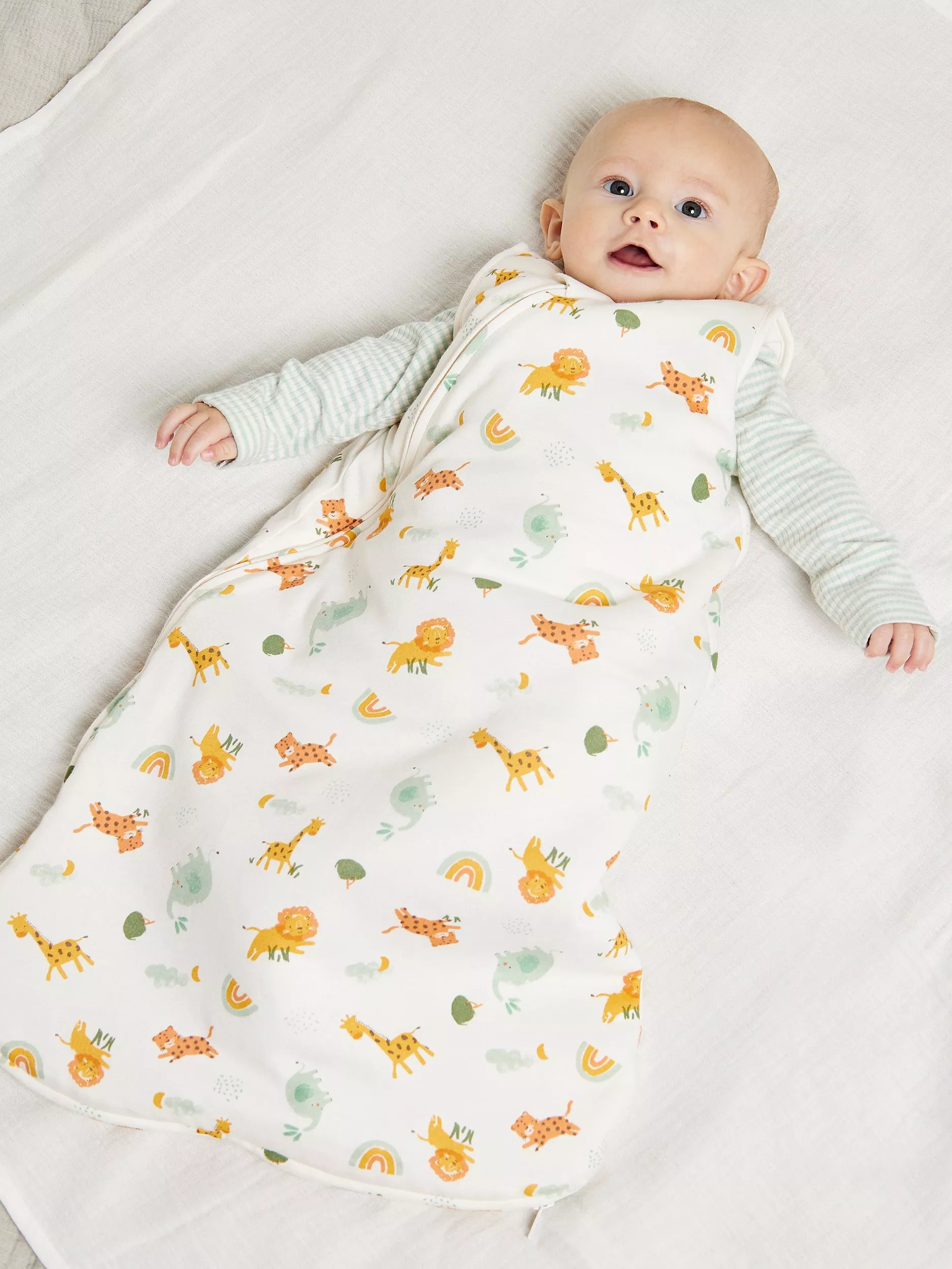 This beautifully designed safari print sleeping bag is a practical addition to baby's bedtime routine. This cotton 2.5 tog baby sleeping bag is perfect for keeping your little ones warm and cosy in the cooler temperatures, with a zip opening for easy changing.