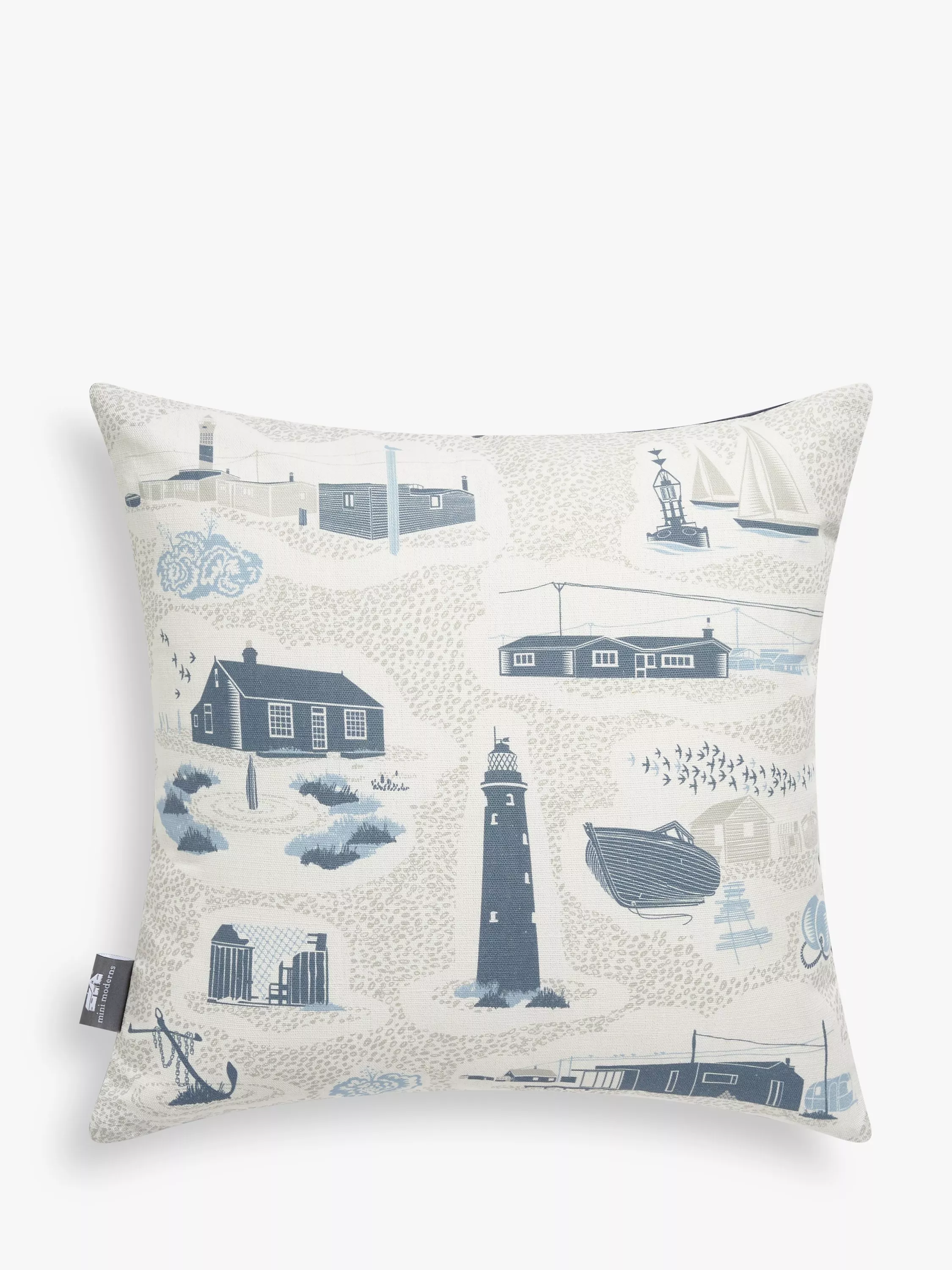This scene of Dungeness features a mass of shingle, punctuated by illustrated vignettes of quaint cabins, abandoned fishing boats and ramshackle huts. Anchoring the print are the two lighthouses that flank the Mini Moderns beach house.