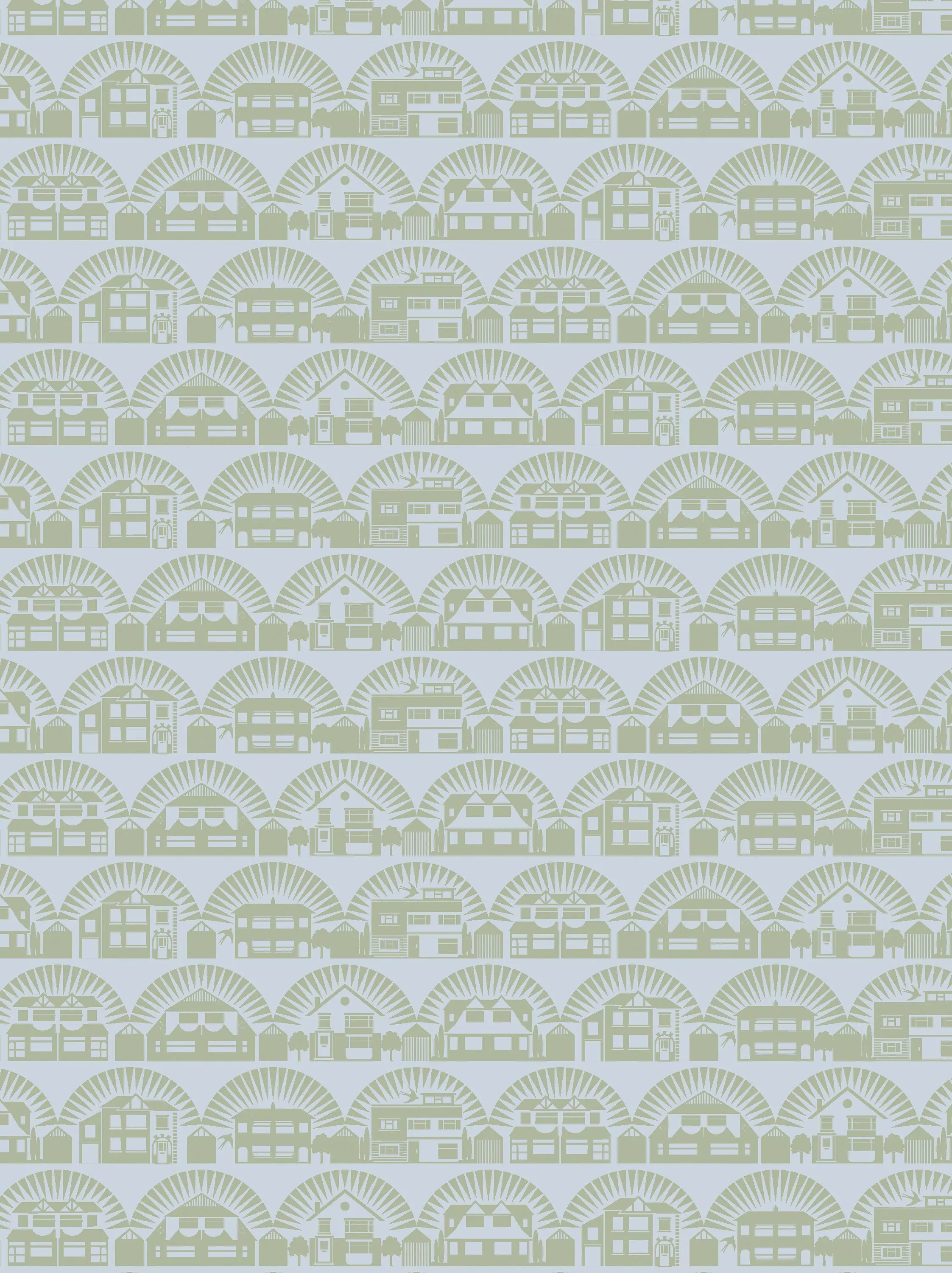 Wallpaper featuring rows of 1930s houses with the sun rising on a sleepy Sunday morning.