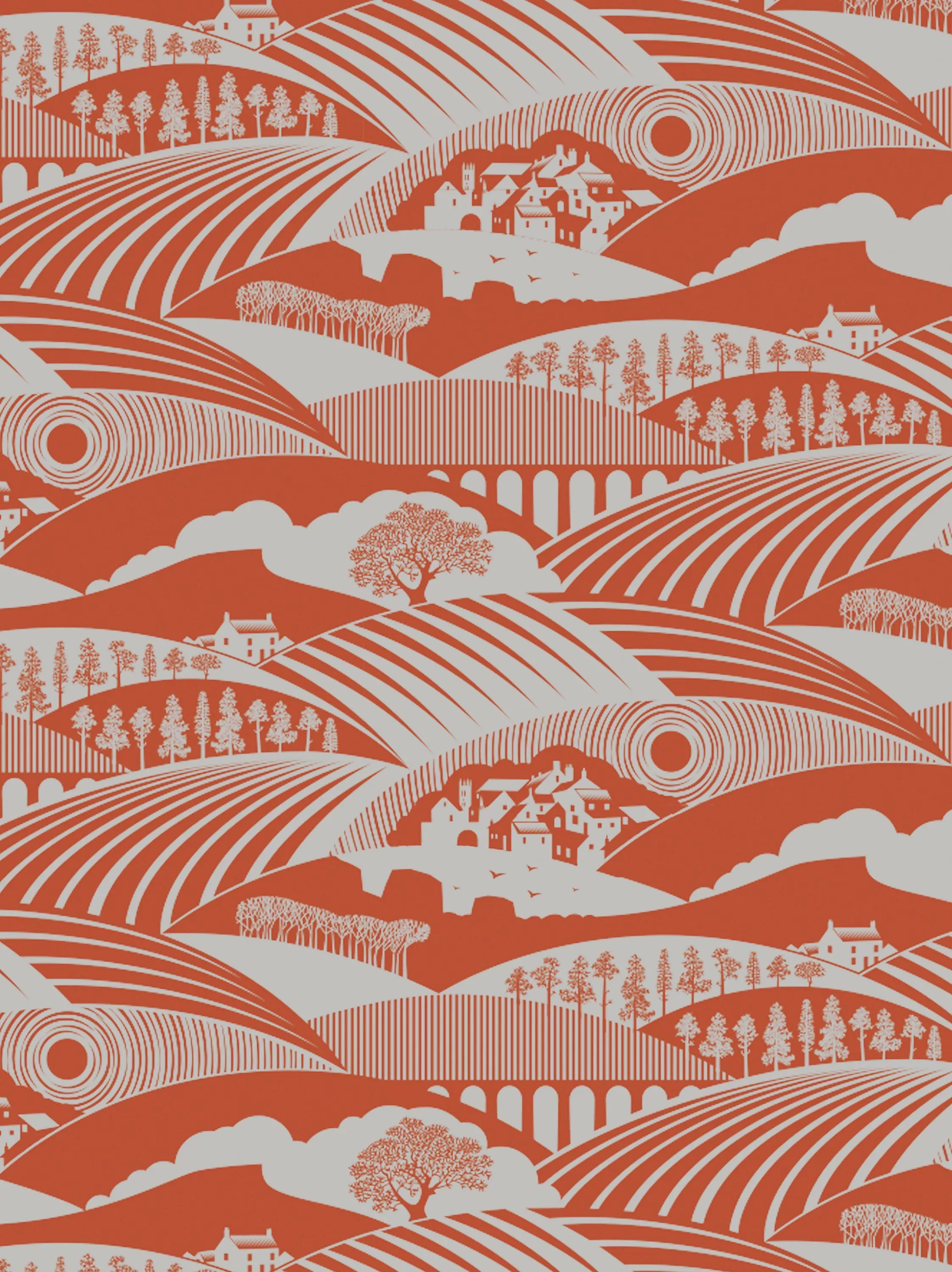 This design features rolling hills of moors and dales, punctuated by farm houses and rows of Douglas firs.