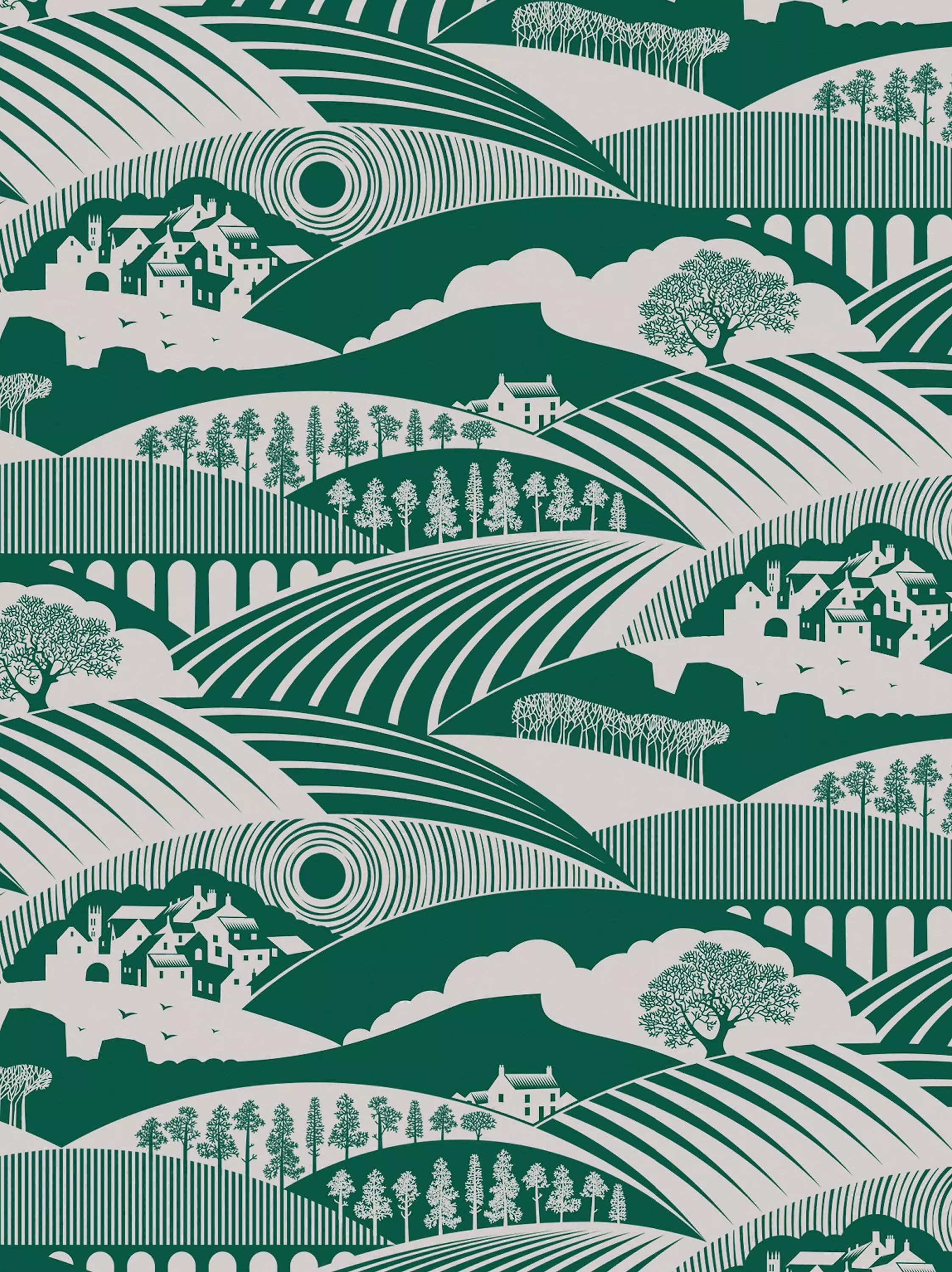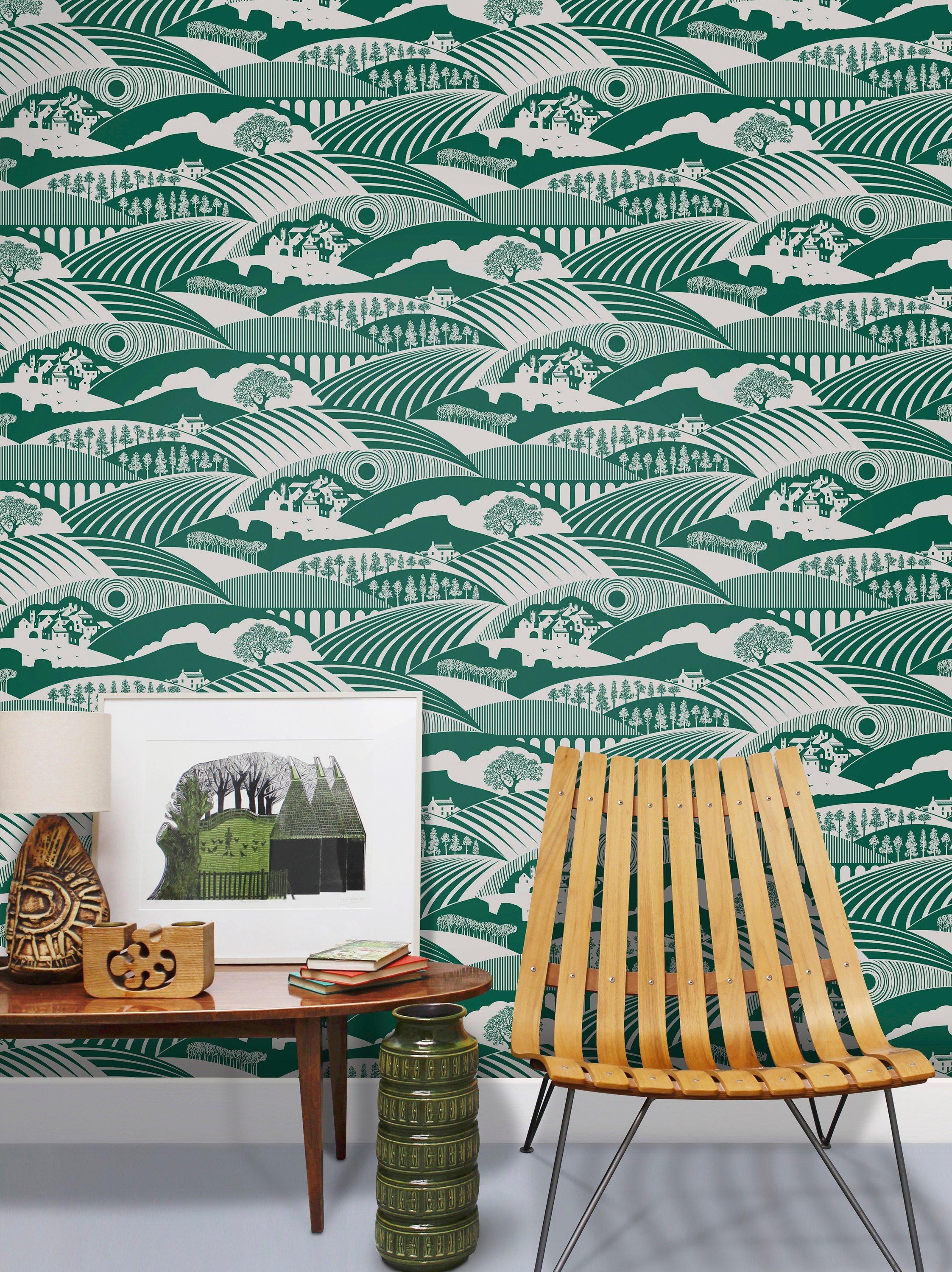 This design features rolling hills of moors and dales, punctuated by farm houses and rows of Douglas firs.
