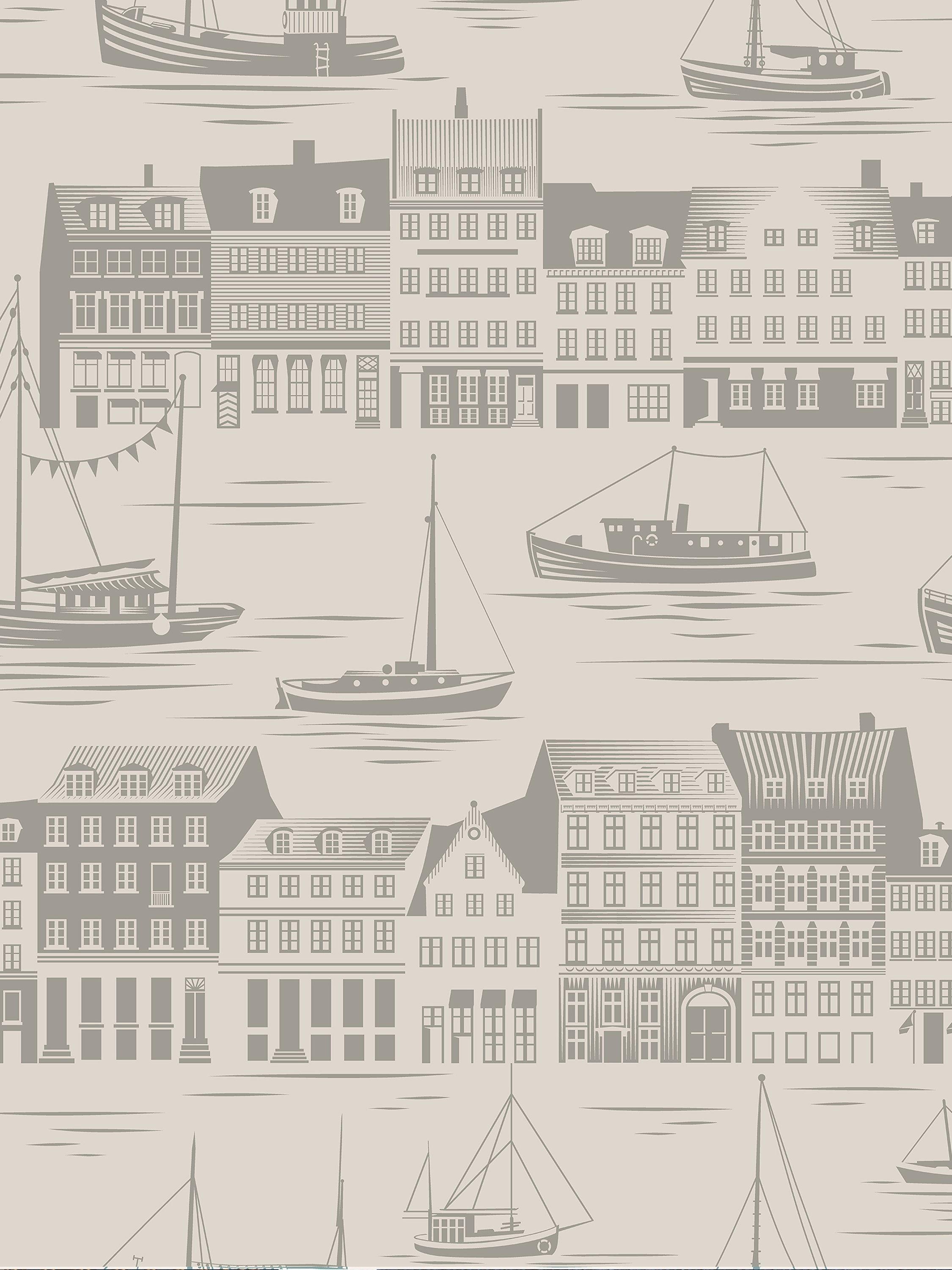 This charming nautical scene celebrates Mini Moderns designers, Mark and Keith's first visit to Copenhagen's bustling Nyhavn district, with boats sailing past its colourful historic townhouses.
