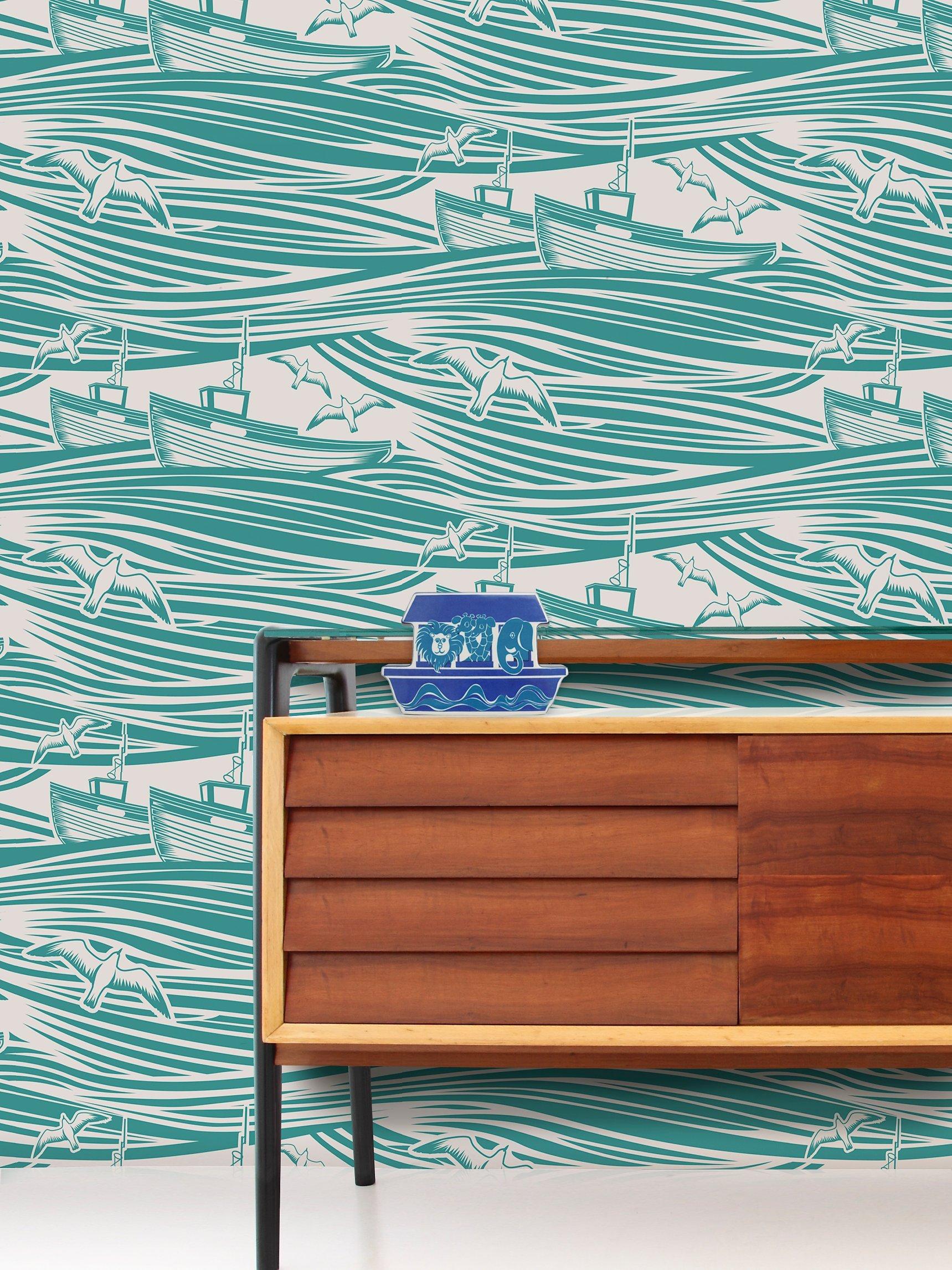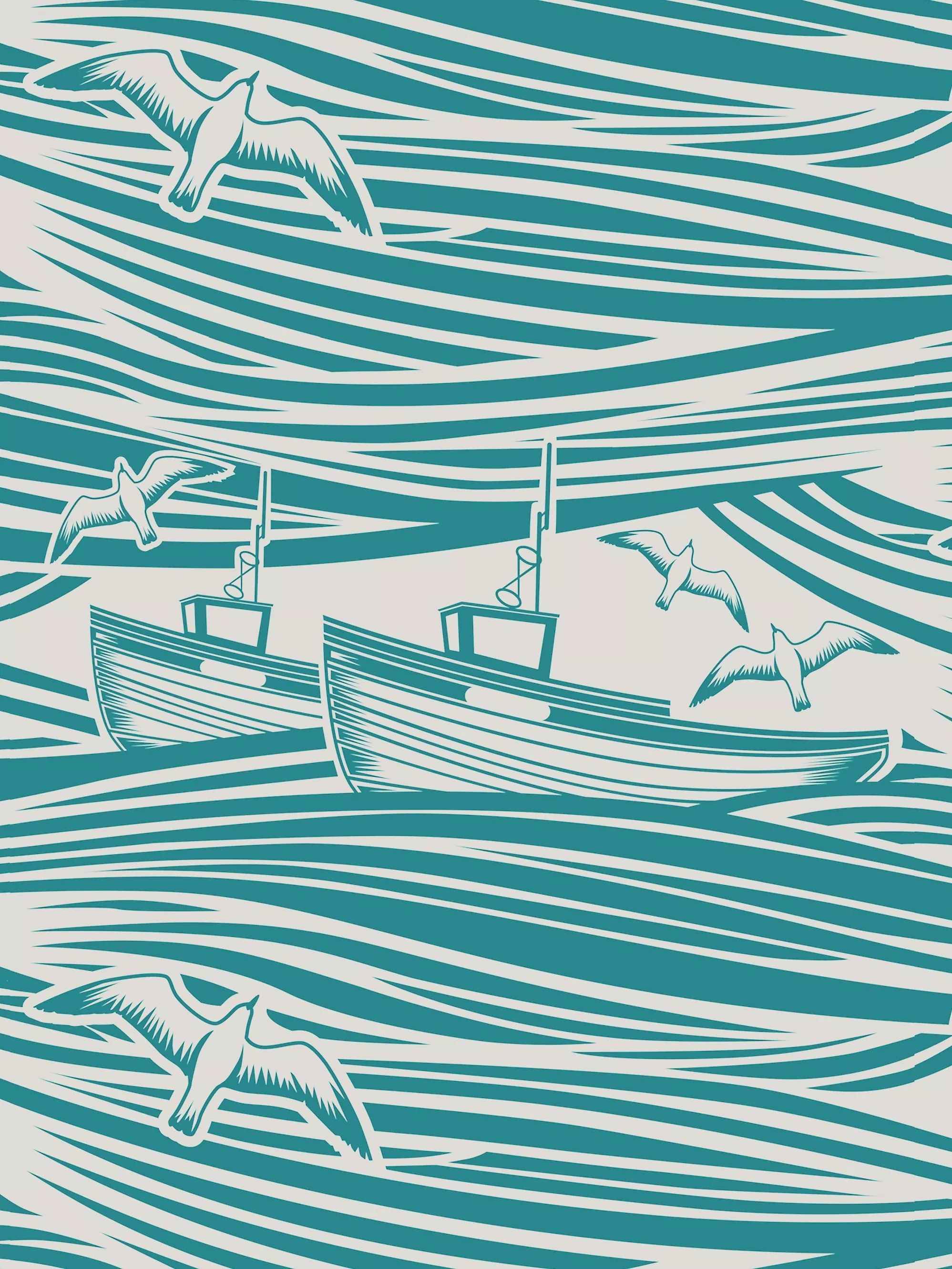 A beautiful design of rolling waves, trawlers and seagulls inspired by 1950s lino cuts.