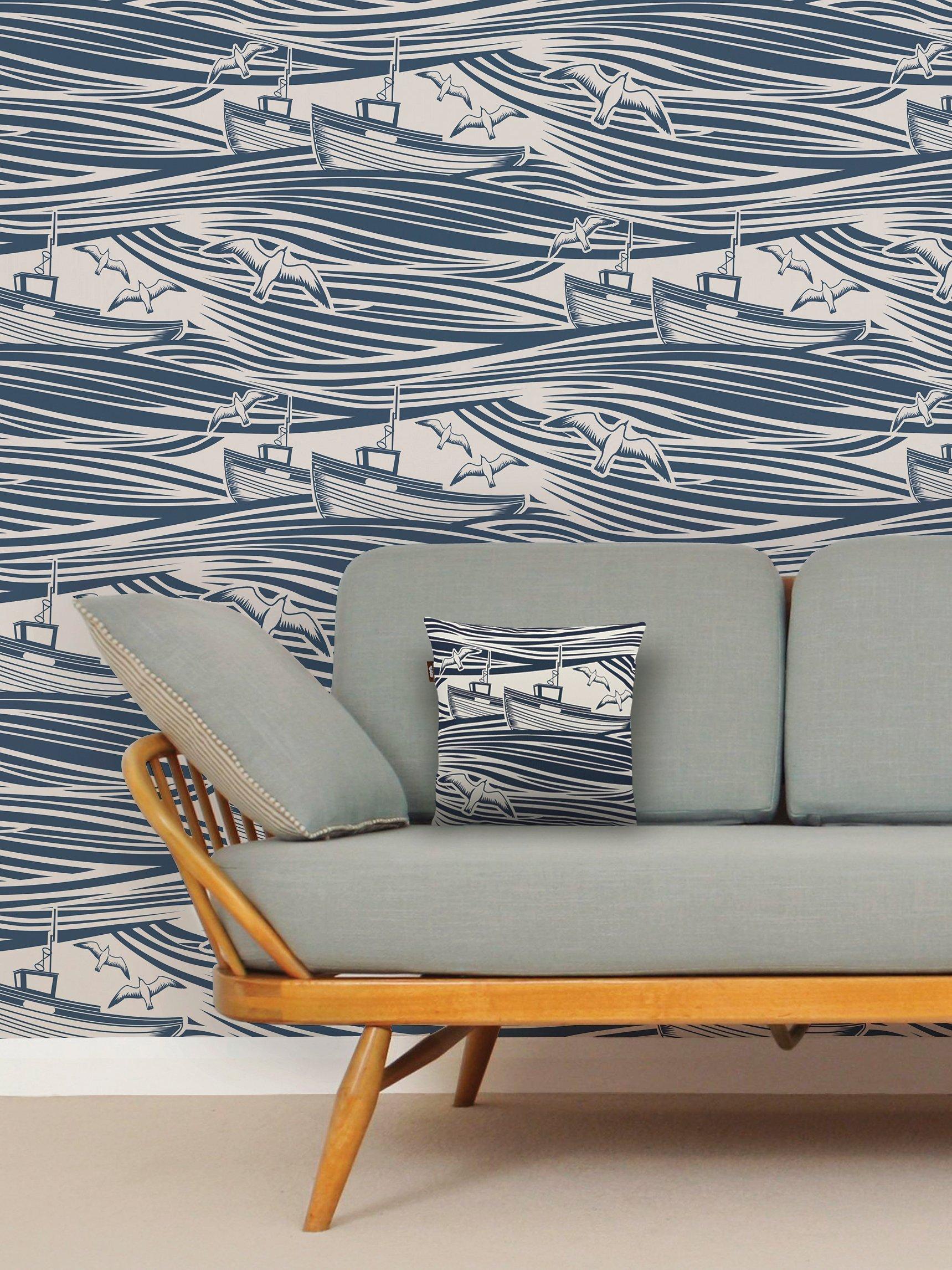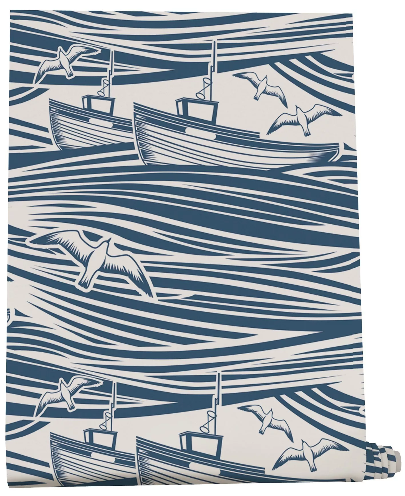 A beautiful design of rolling waves, trawlers and seagulls inspired by 1950s lino cuts.