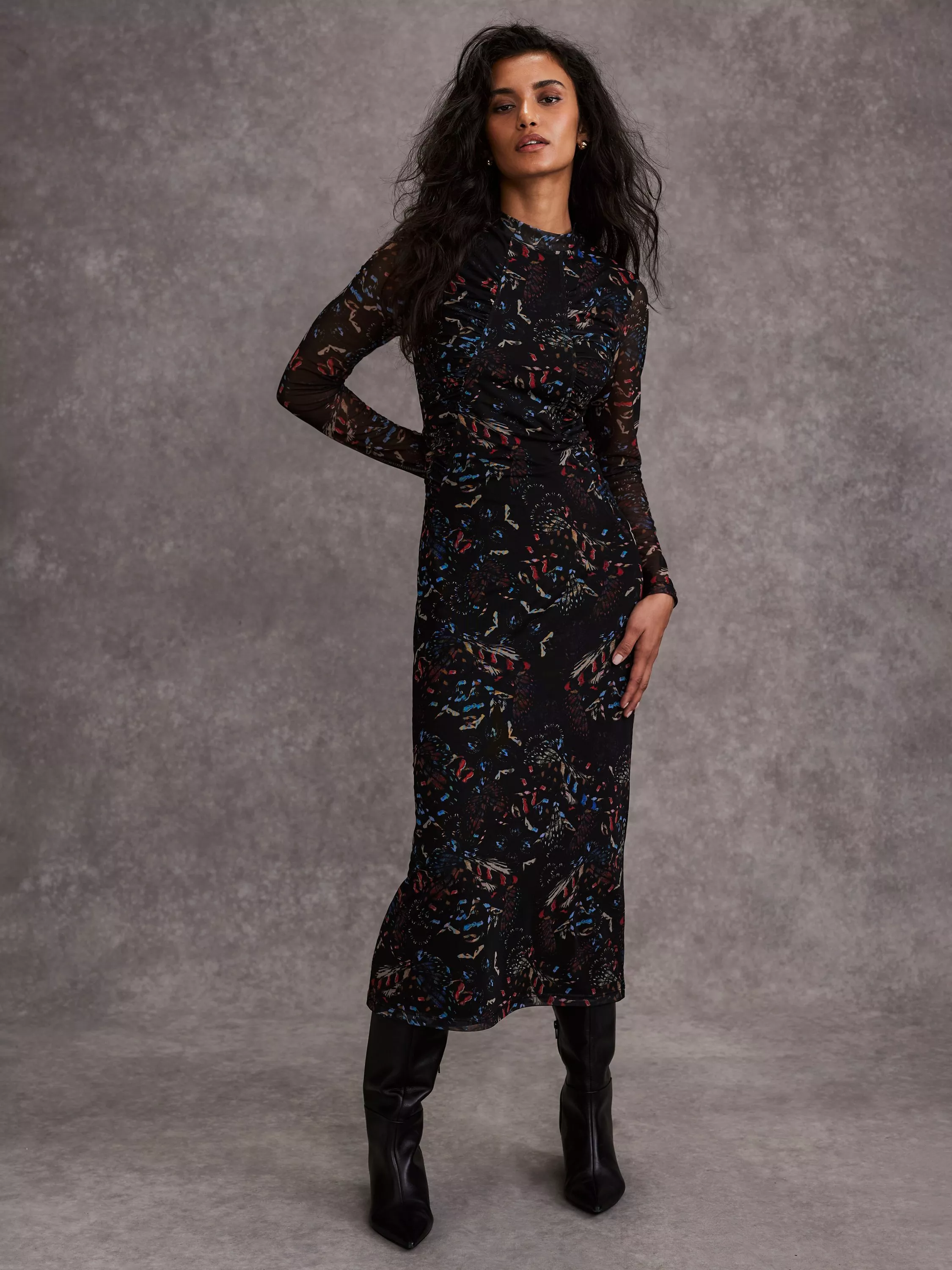 An abstract print mesh midi dress with a high neckline, long semi-sheer sleeves and ruched details along the side.