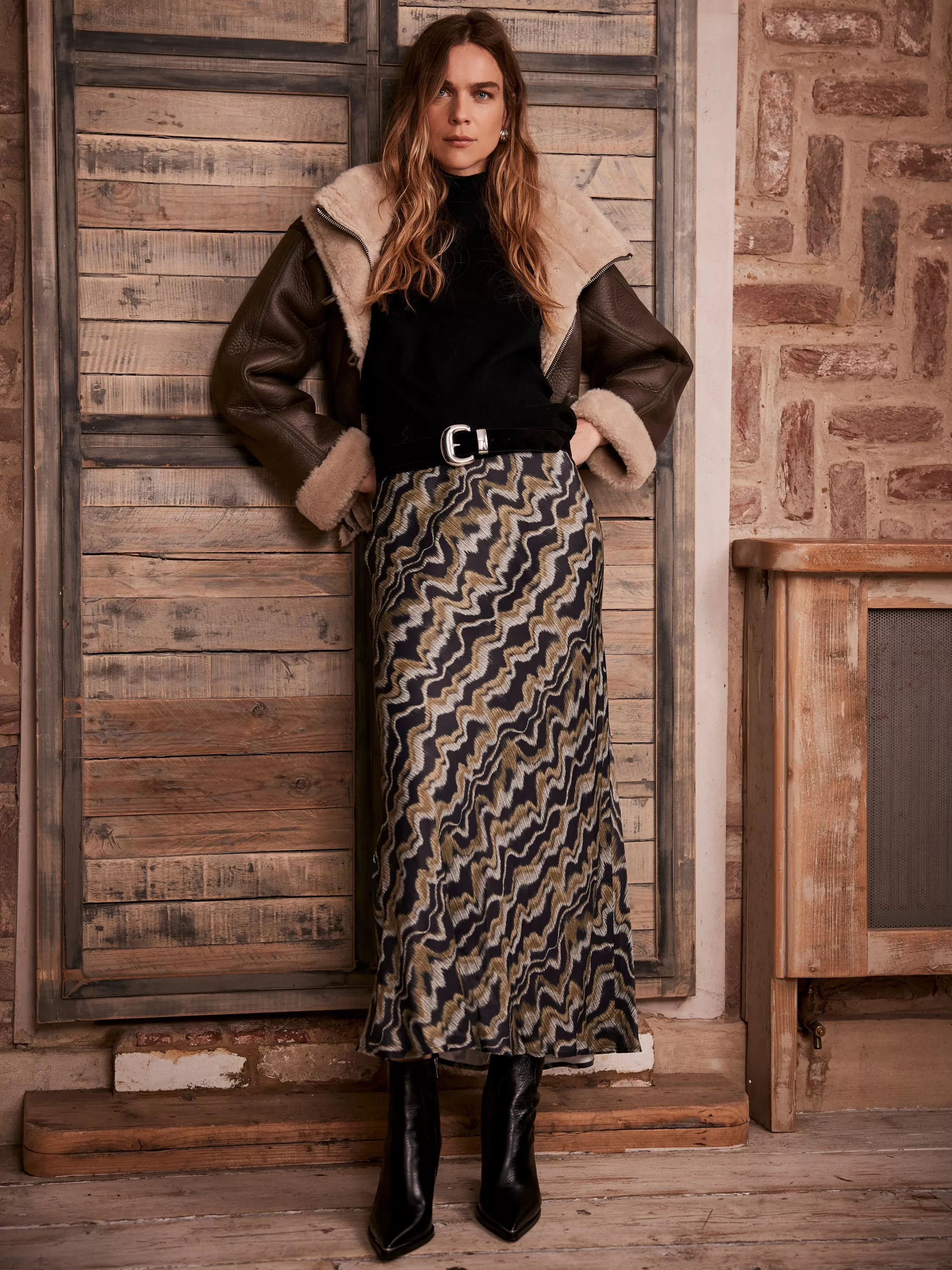 An abstract print slip skirt in a midi silhouette featuring an elasticated waistband and bias cut hemline.