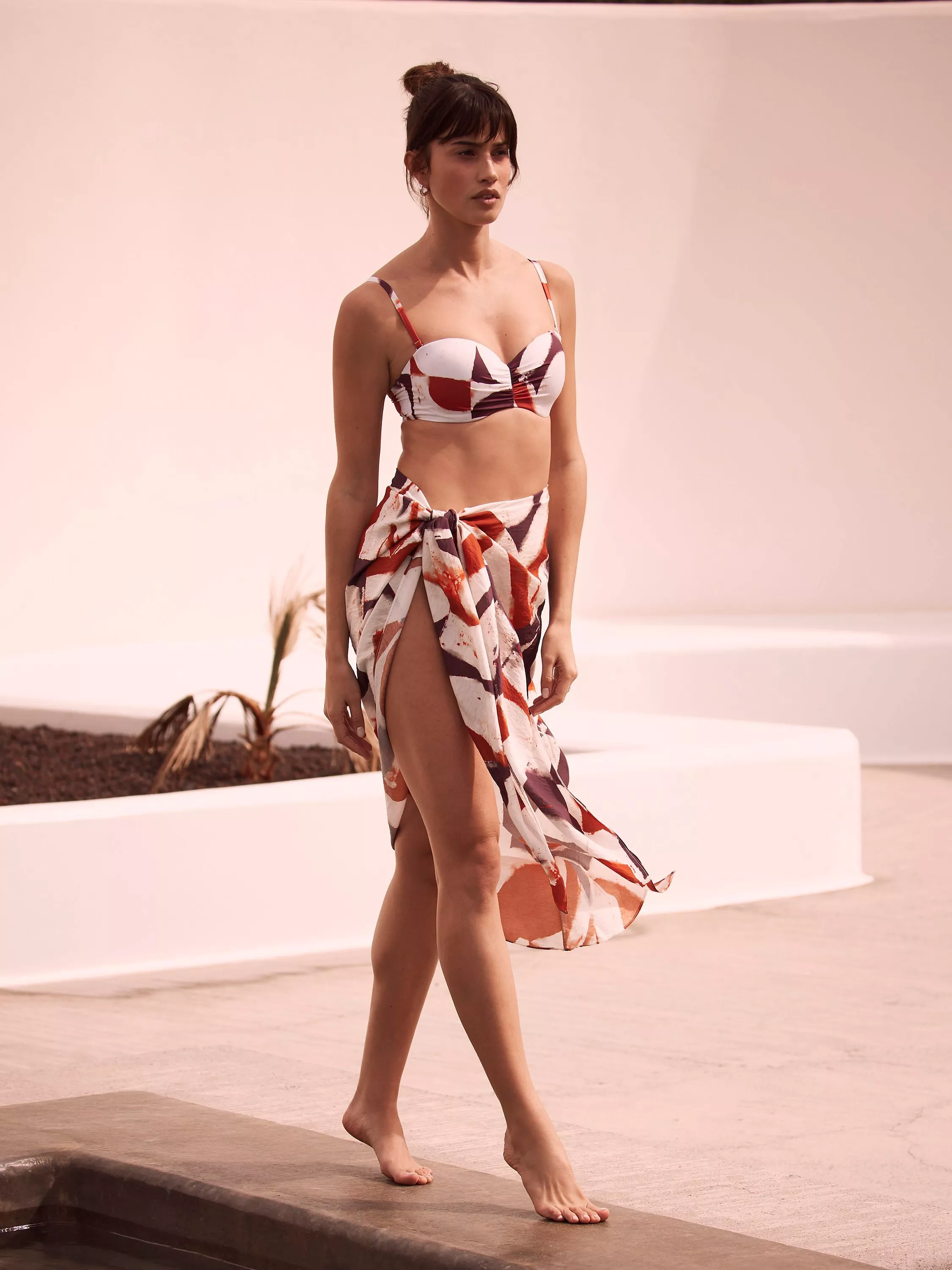 An abstract print sarong featuring a split front, dipped hemline and a tie fastening through the front.