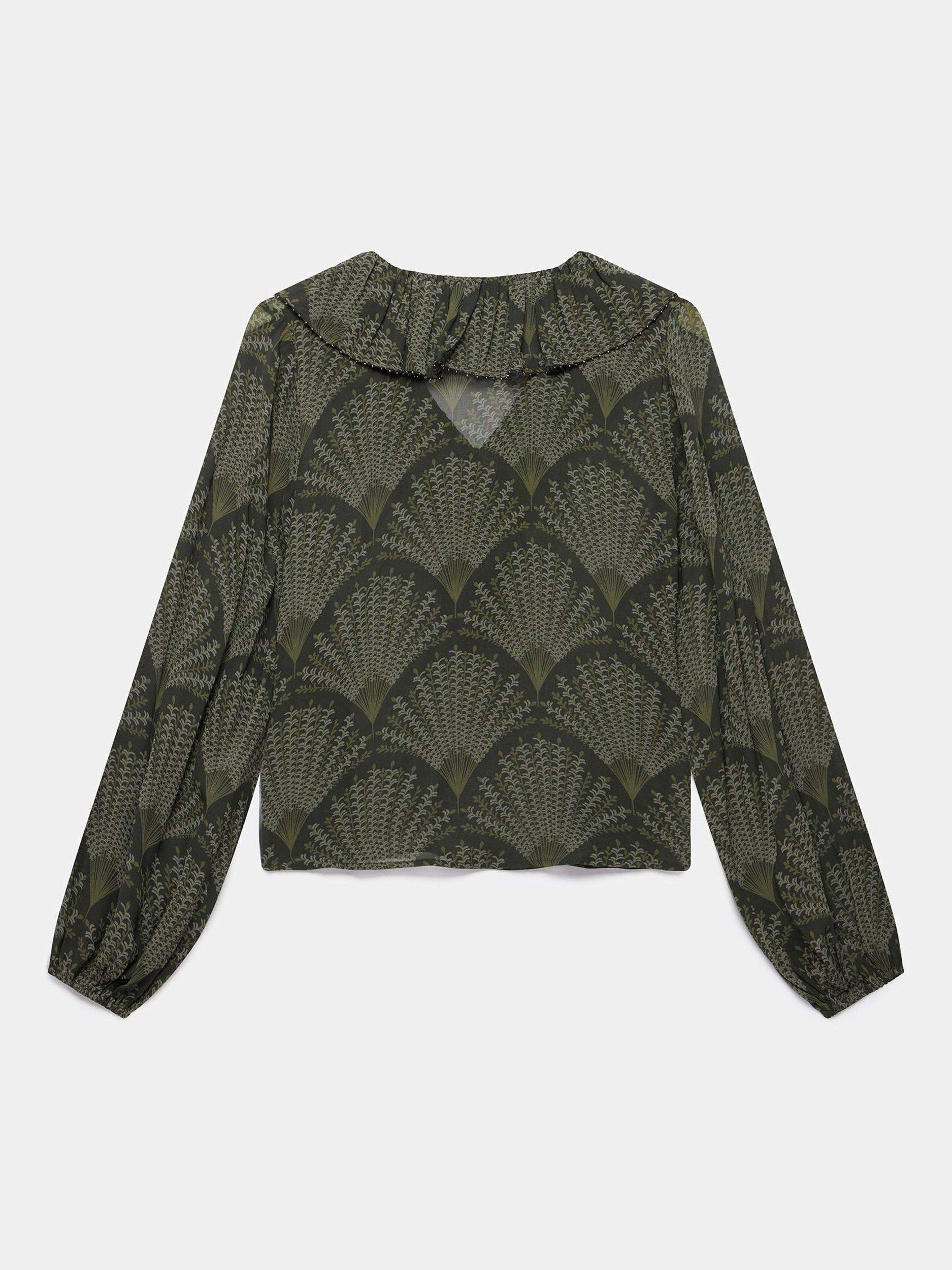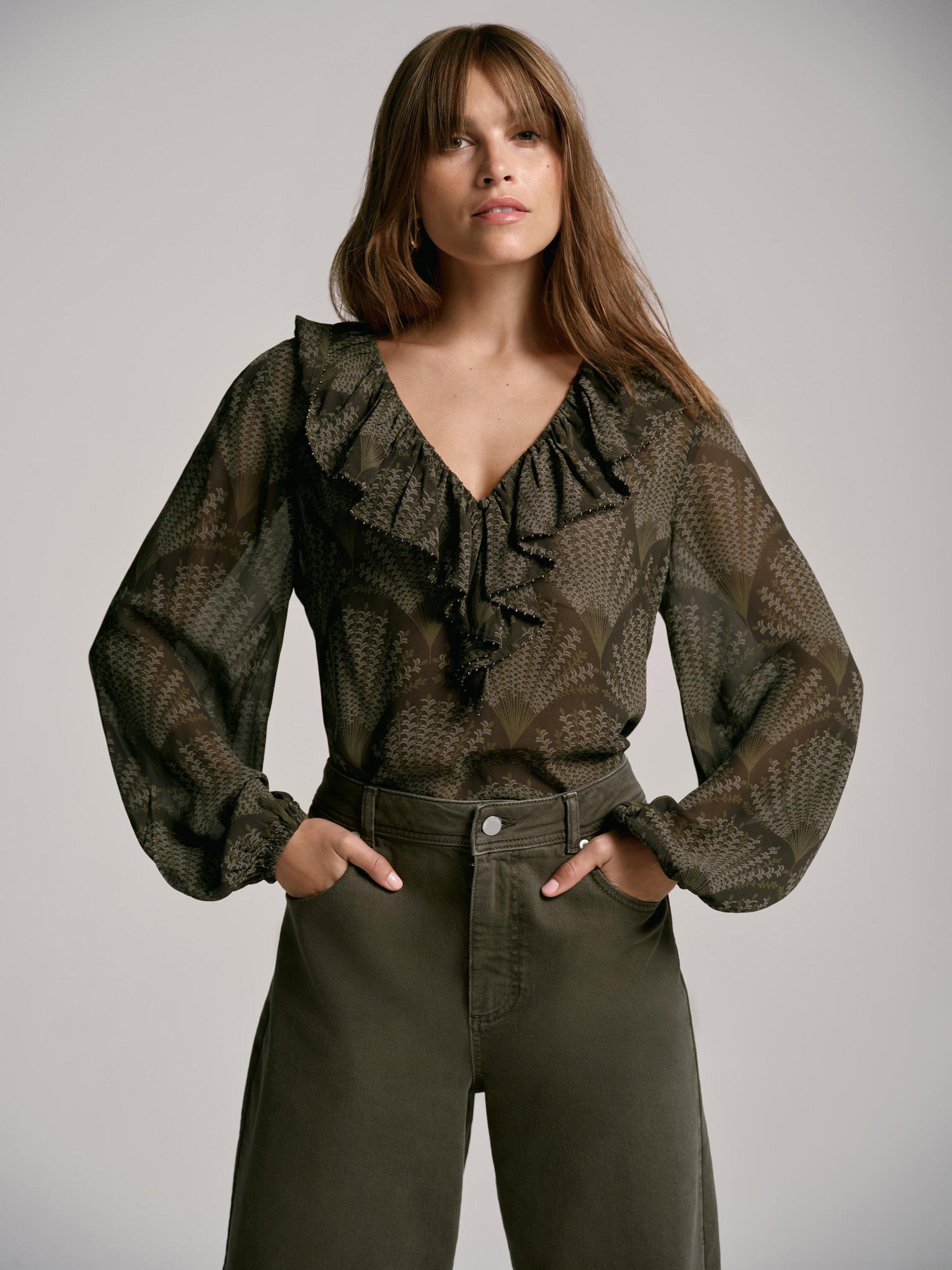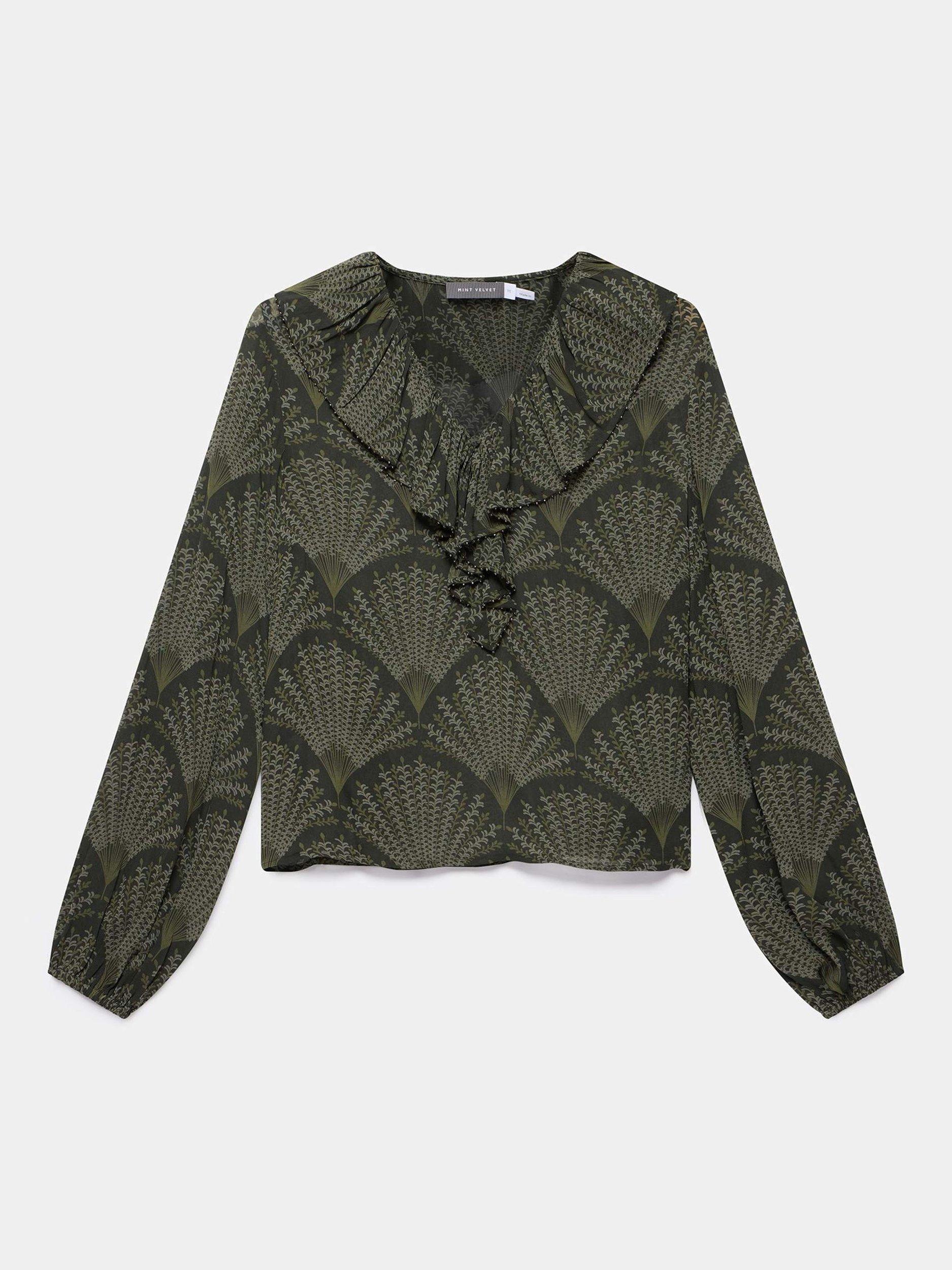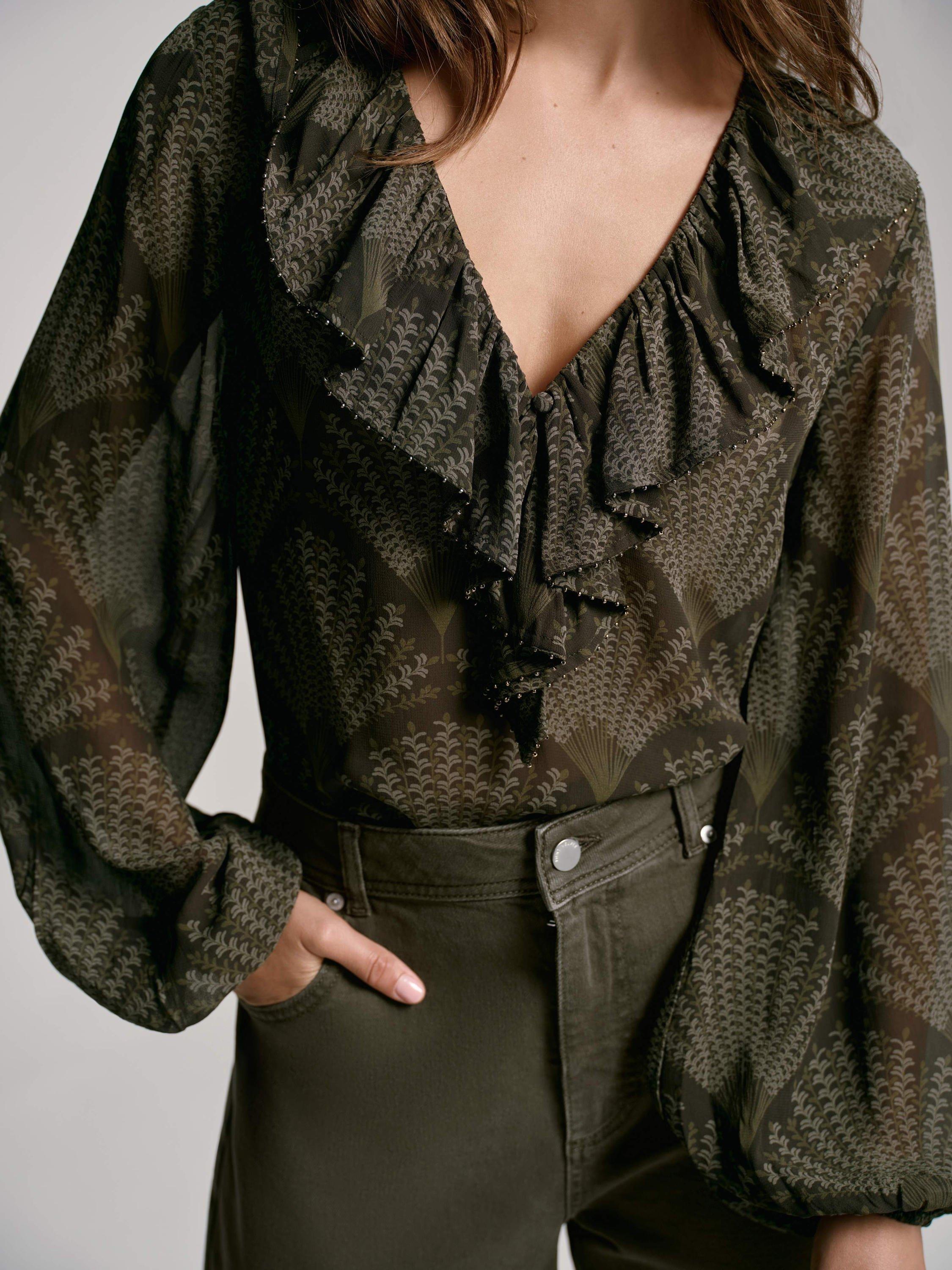 A printed blouse featuring a ruffle V-neckline, long sleeves, elasticated cuffs and beaded trim.