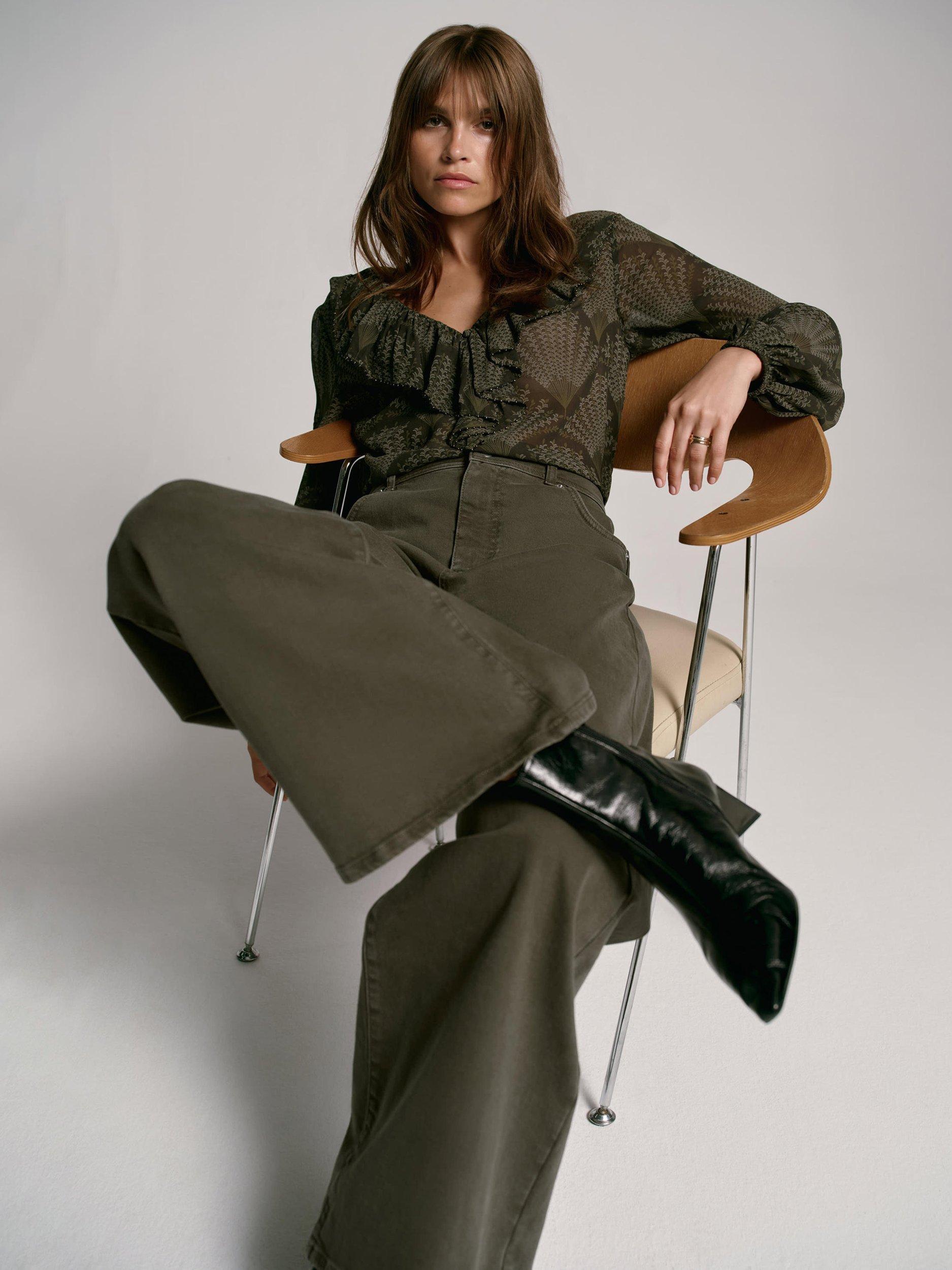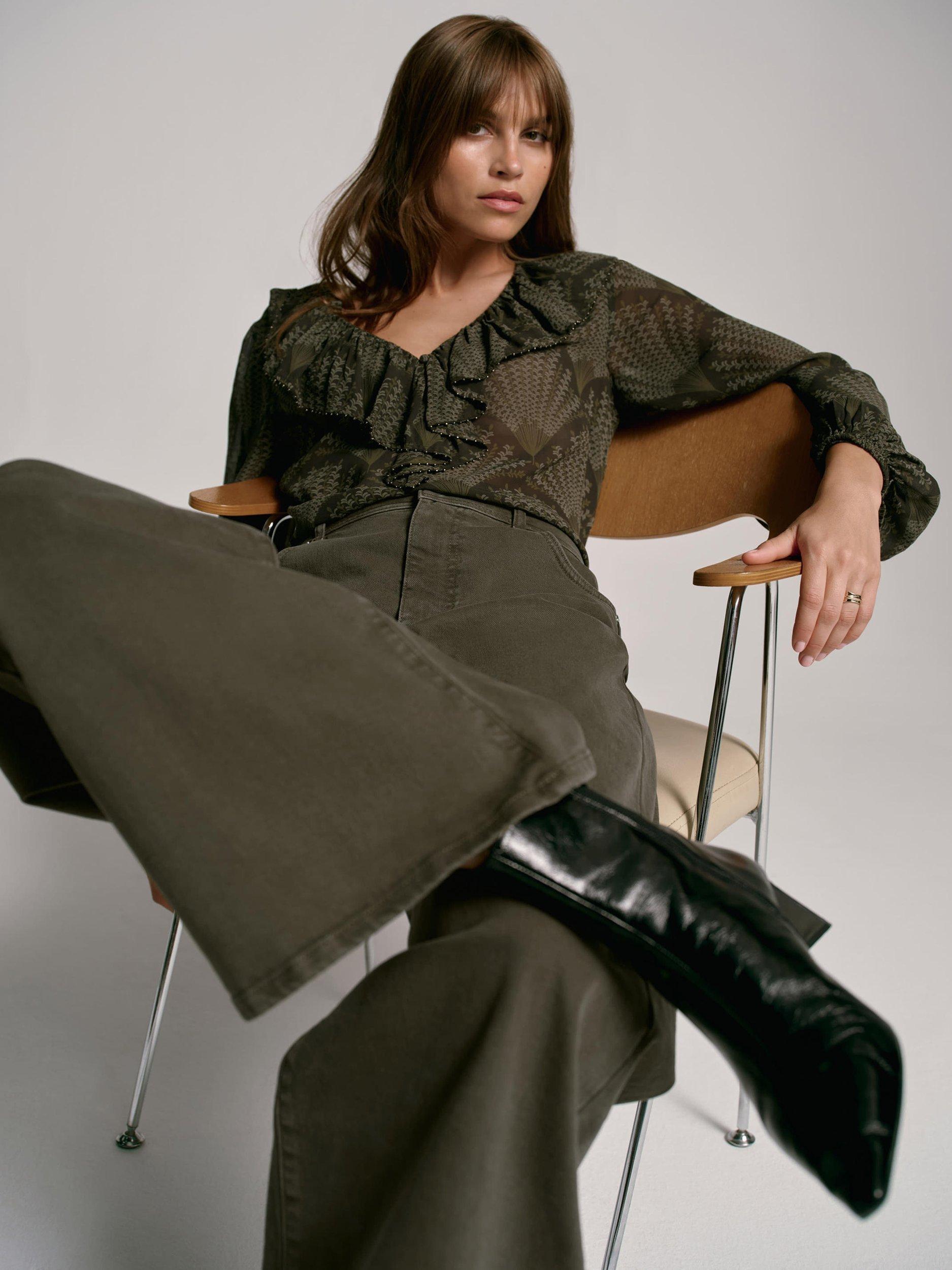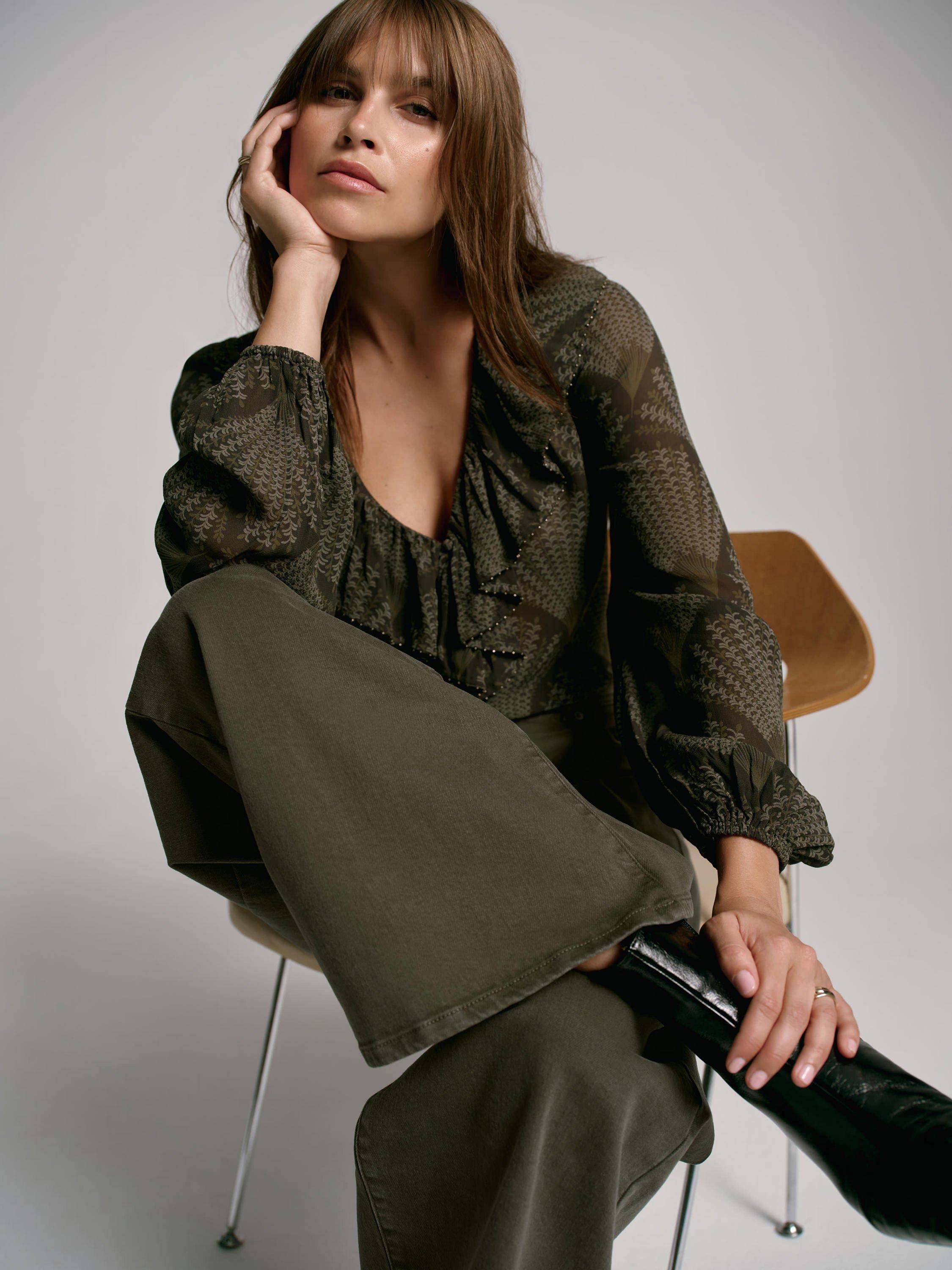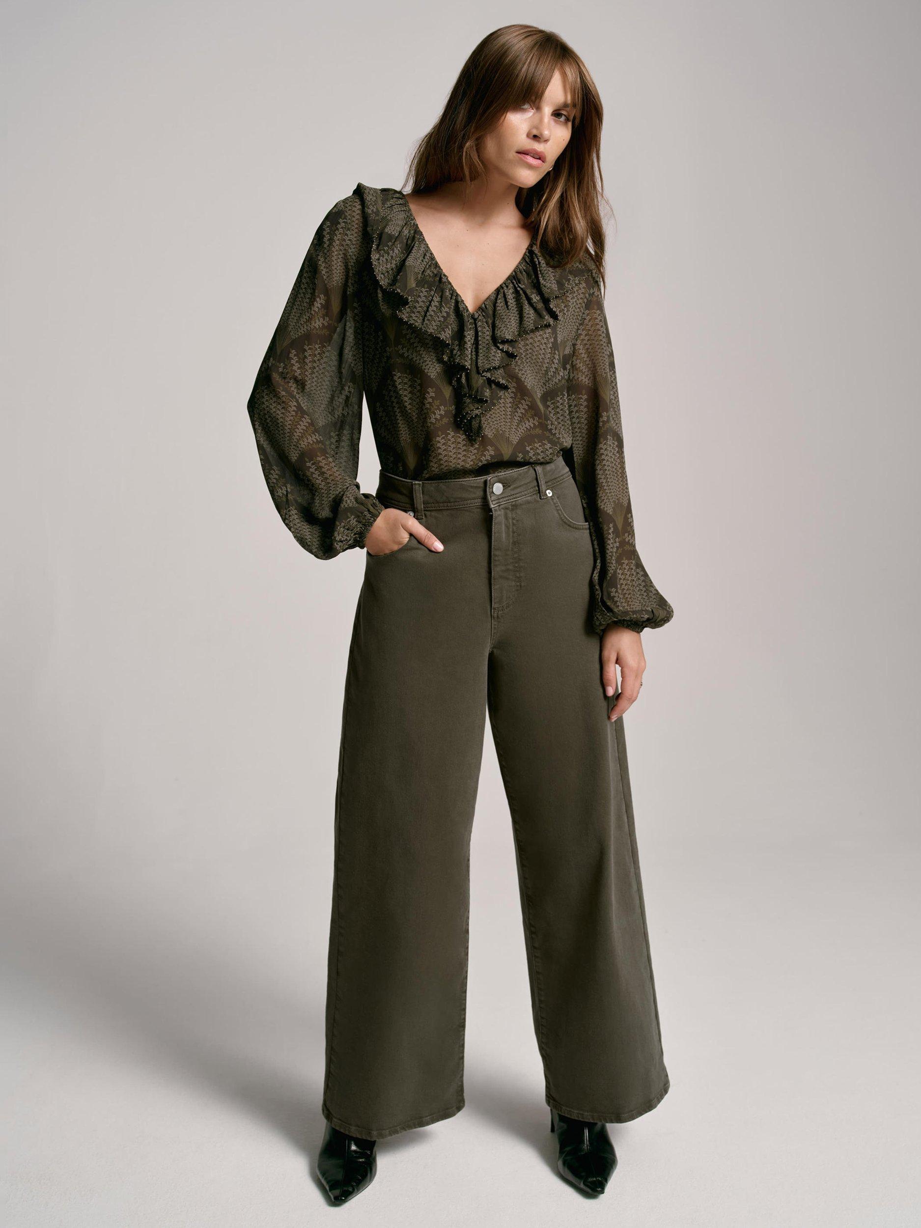 A printed blouse featuring a ruffle V-neckline, long sleeves, elasticated cuffs and beaded trim.