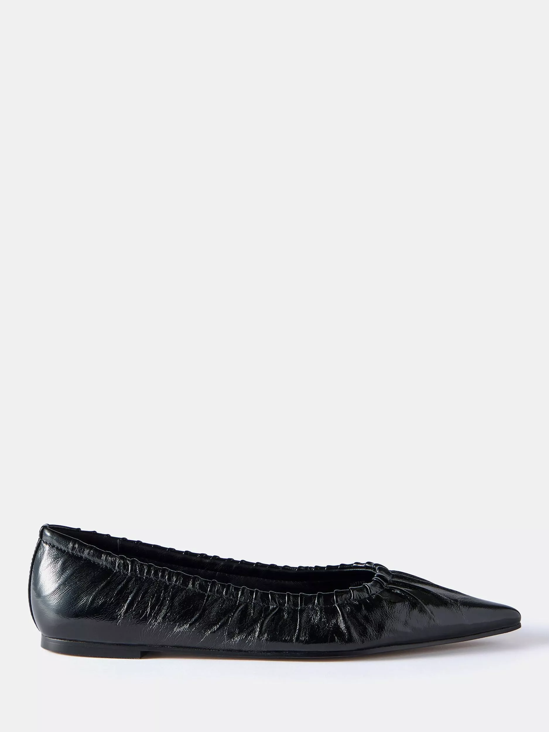 A pair of ballet pumps from Mint Velvet, artfully crafted from coated leather with a flat heel and a pointed toe.