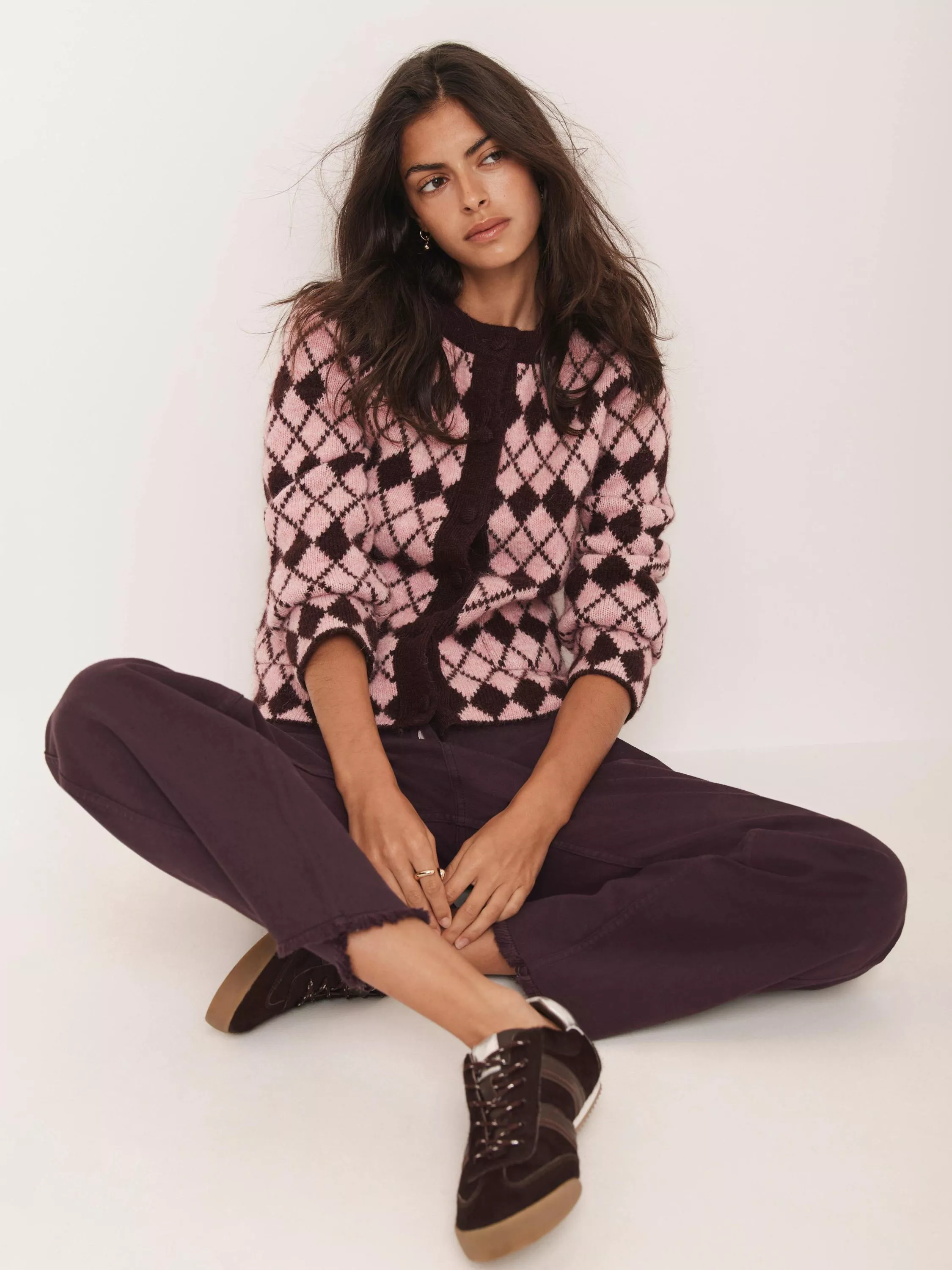 Burgundy tone argyle cardigan with a crew neckline, long sleeves, square pockets featuring a button fastening through the front.