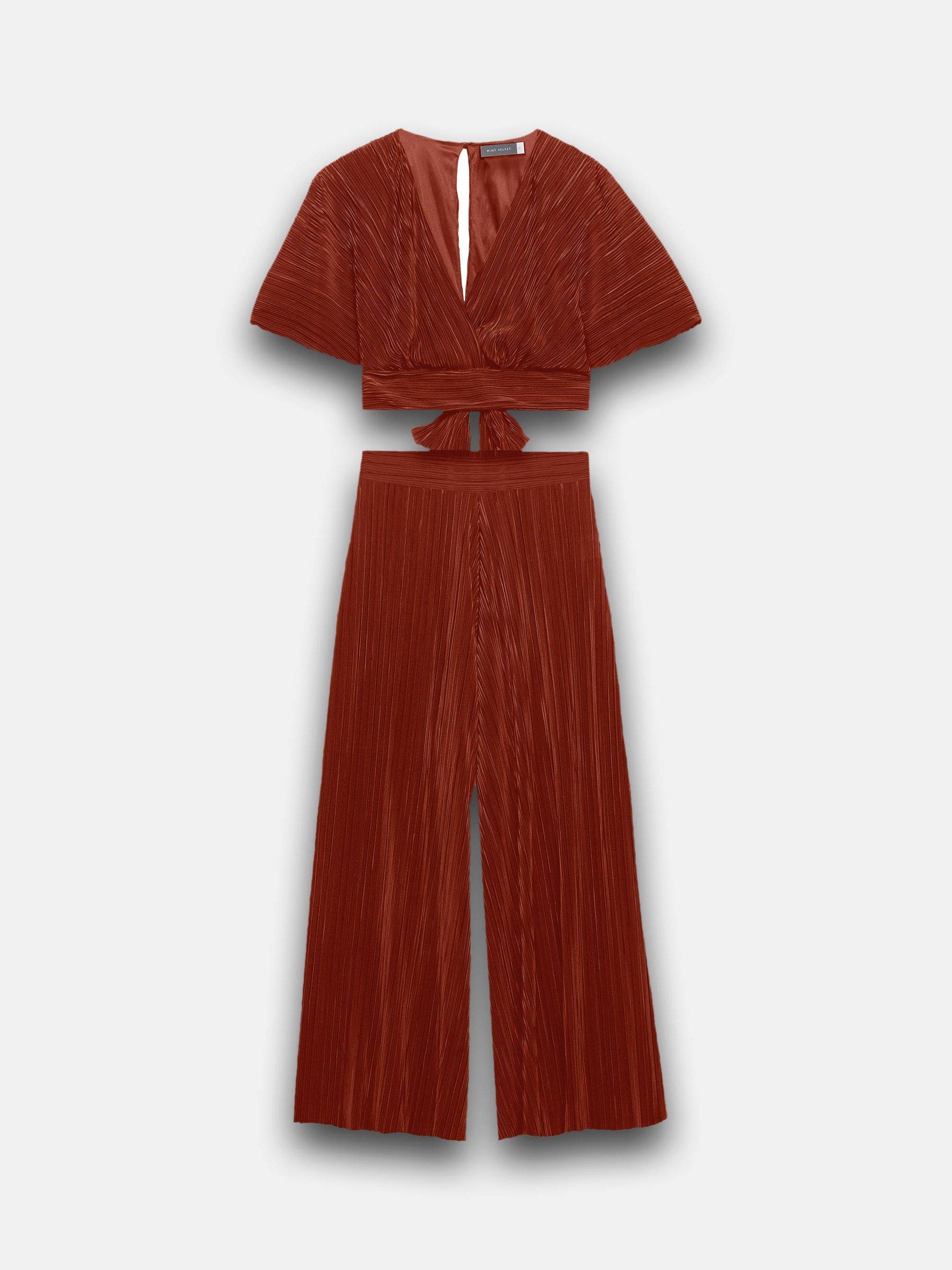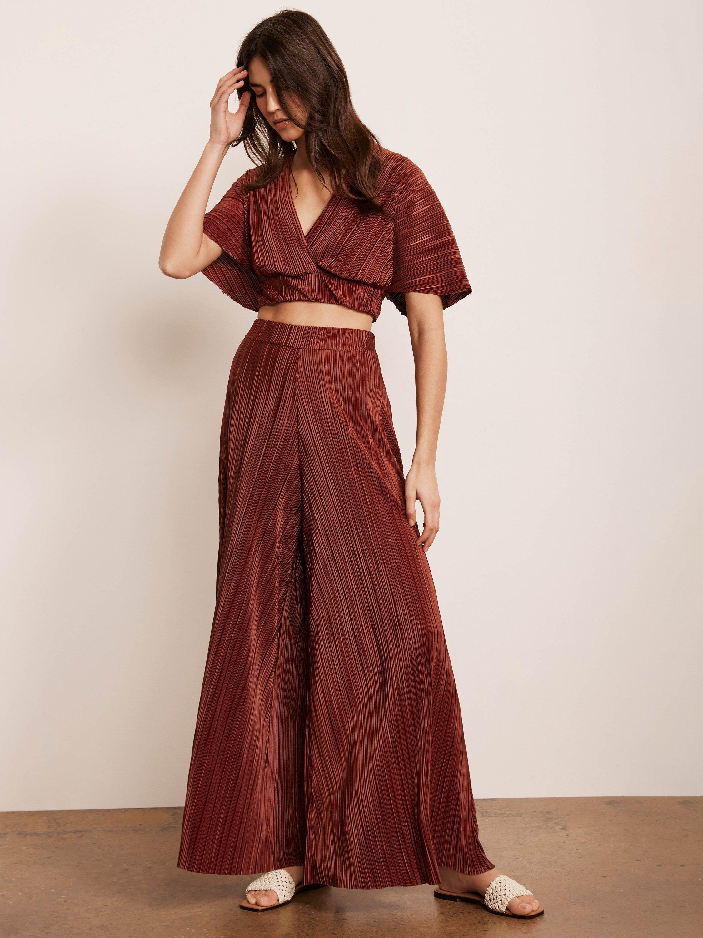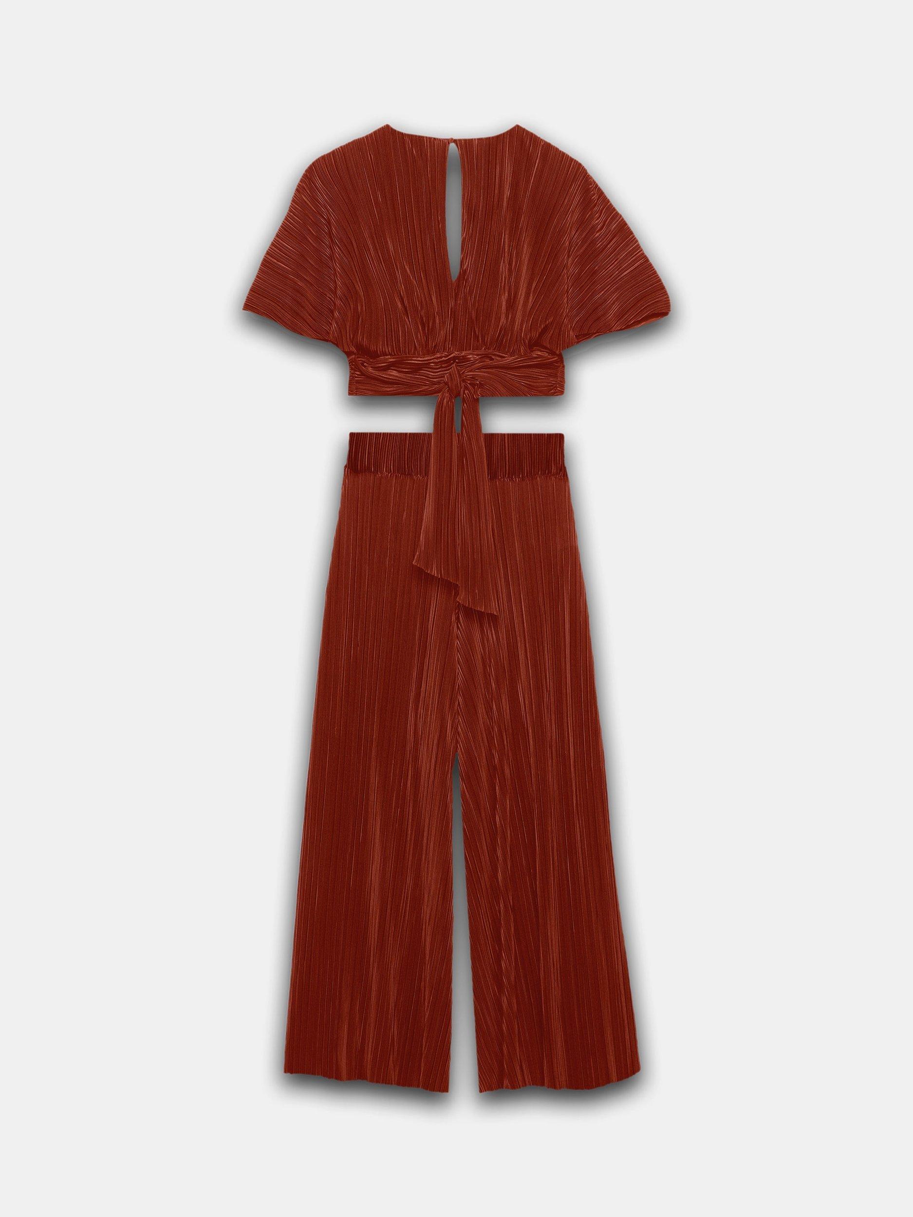A plisse set featuring a wrap-front top with short sleeves, button and tie fastening through the back with matching wide leg full-length trousers.