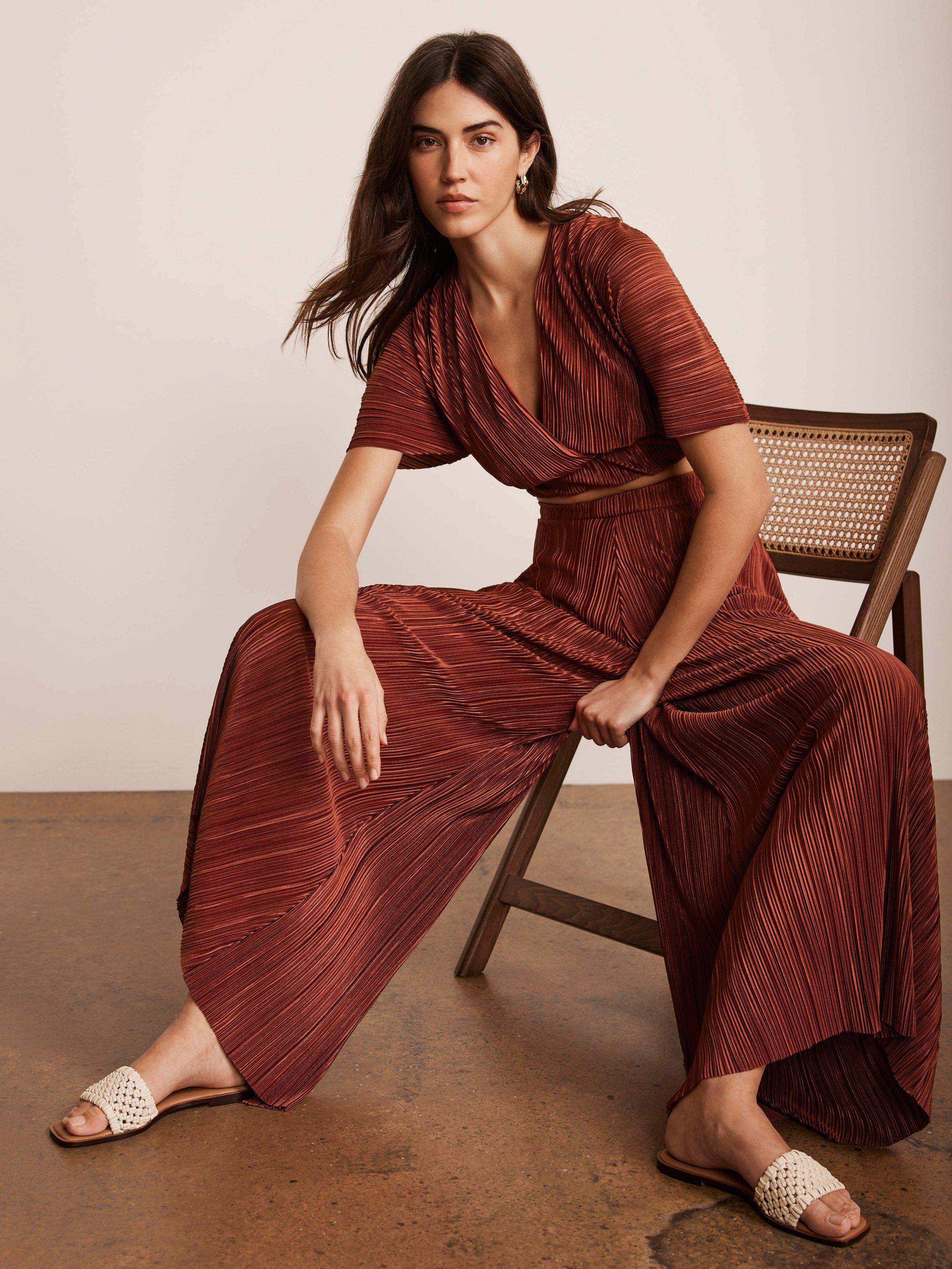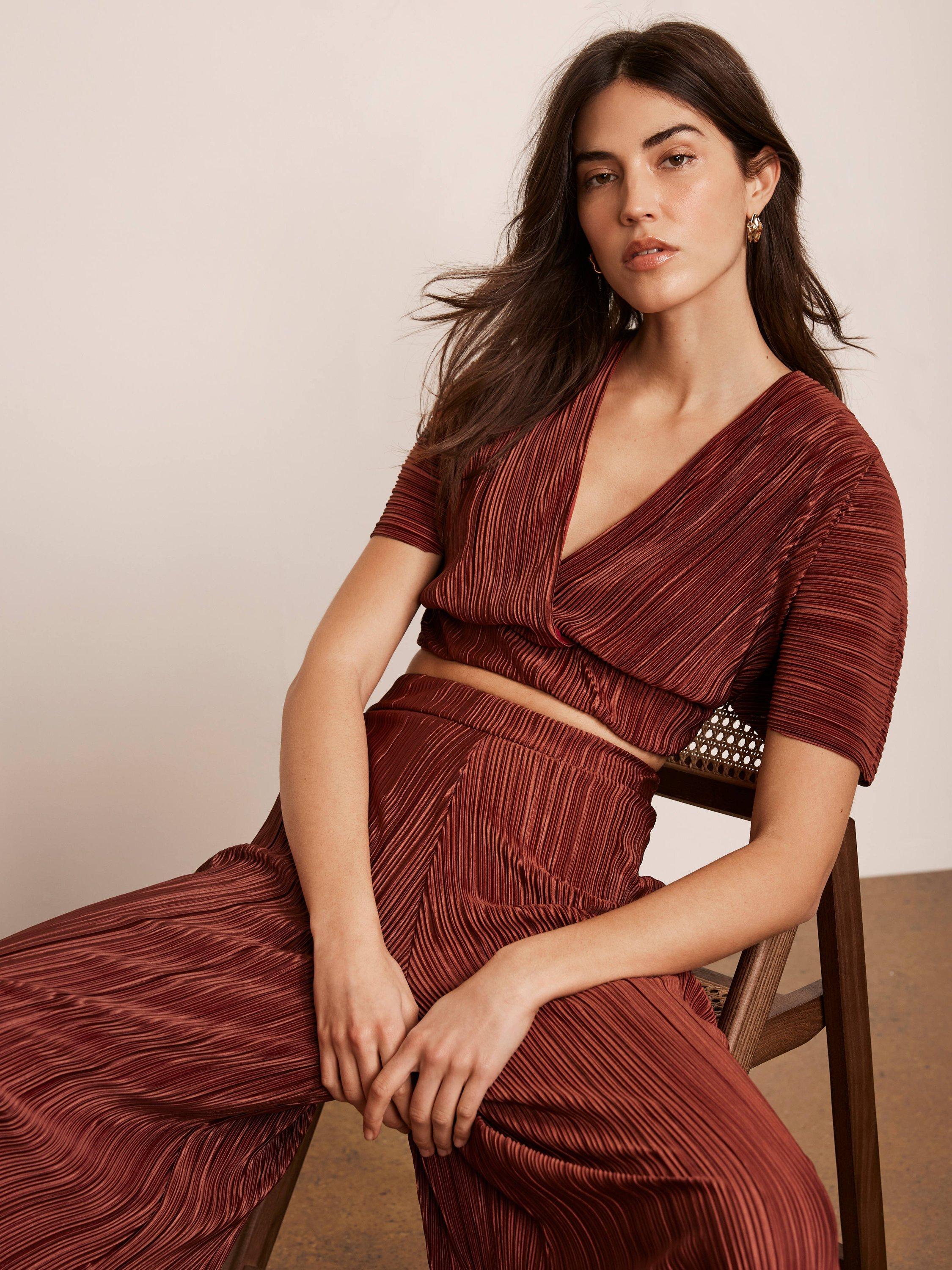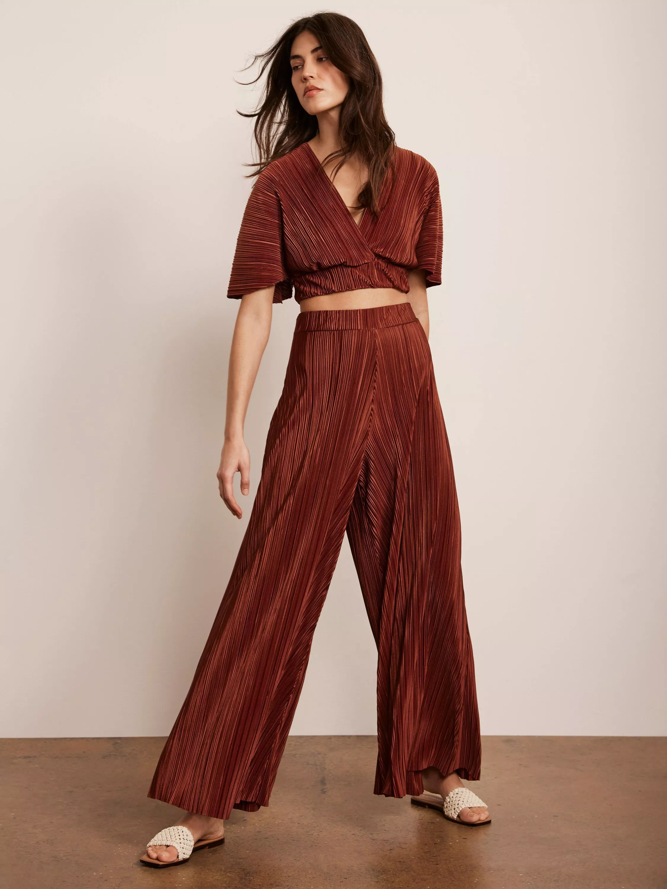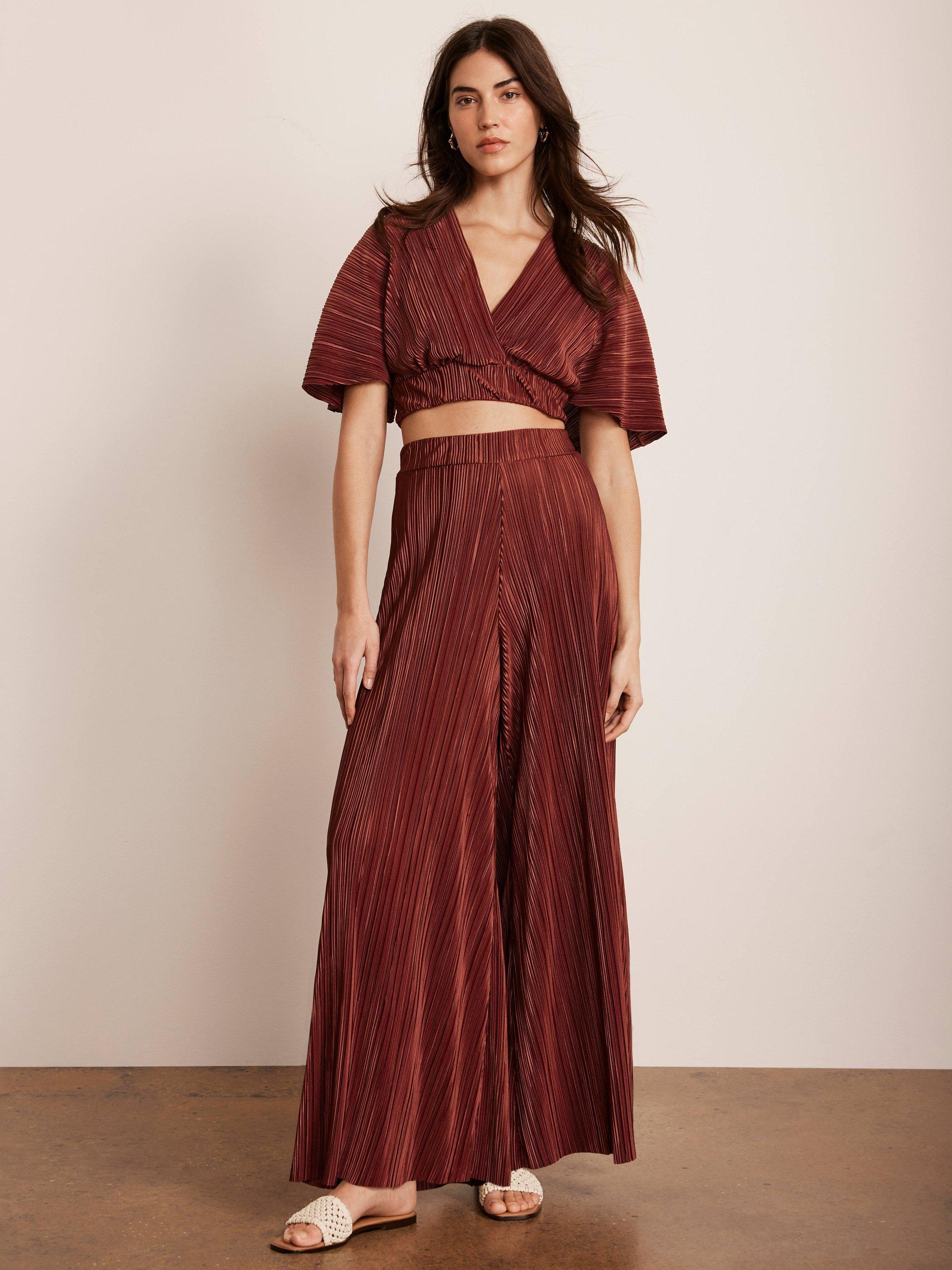 A plisse set featuring a wrap-front top with short sleeves, button and tie fastening through the back with matching wide leg full-length trousers.