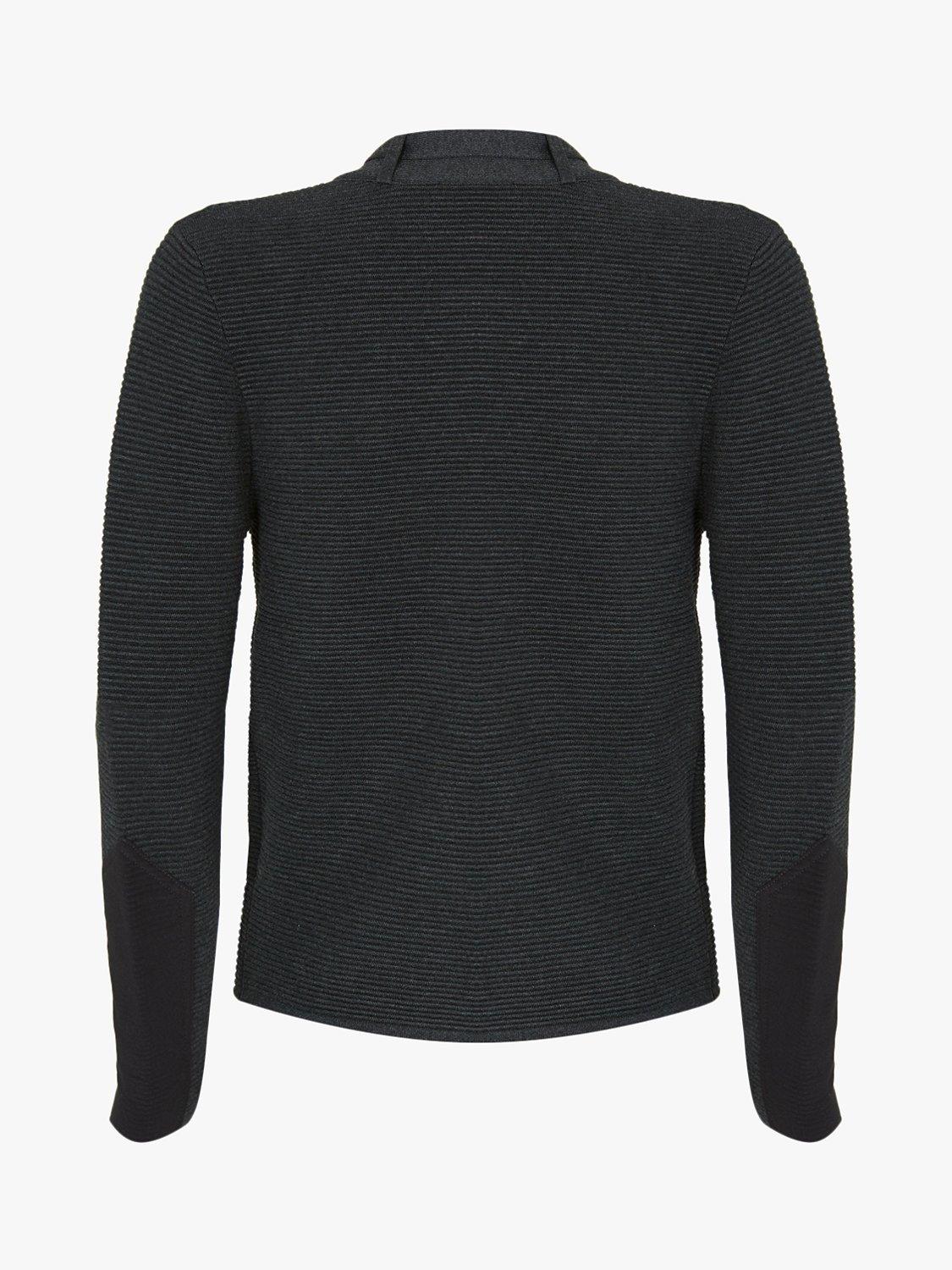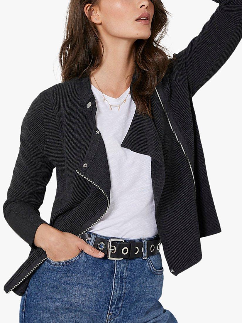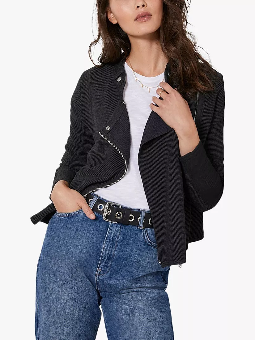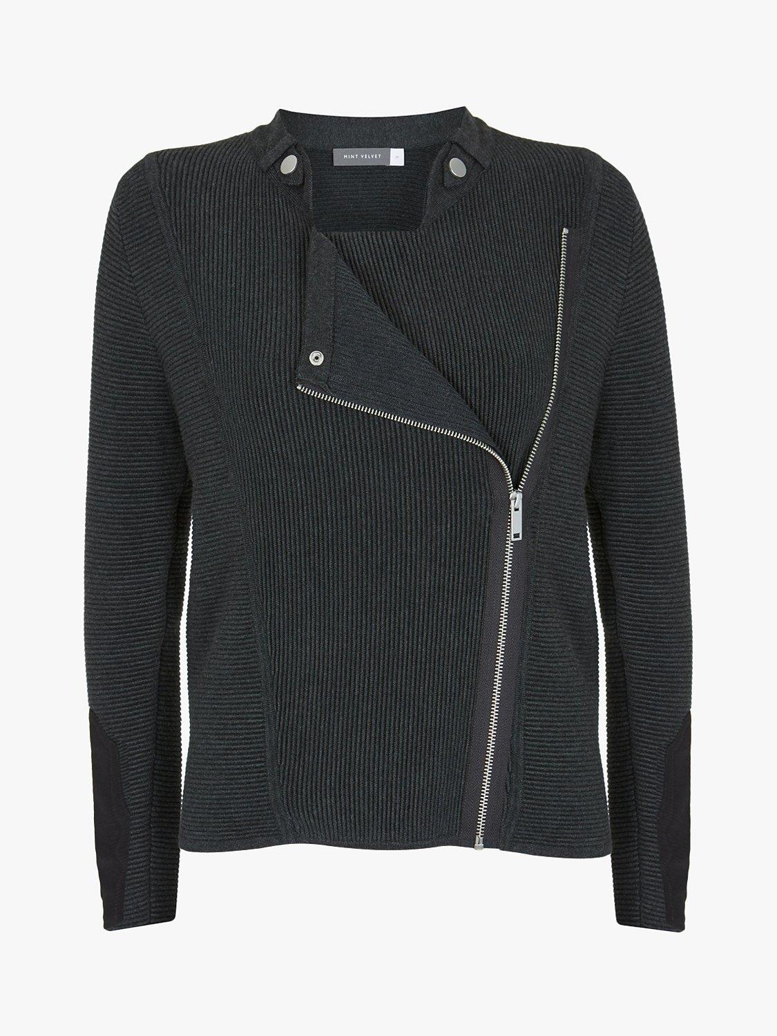 Finely knitted using an intricate ottoman stitch for a cool ridged texture, this cropped charcoal-grey cardigan is designed with our signature biker construction for a contemporary feel. It zips asymmetrically across the front and is detailed with silver-tone studs and tonal woven panels - slip yours over a basic tee and jeans at the weekend.