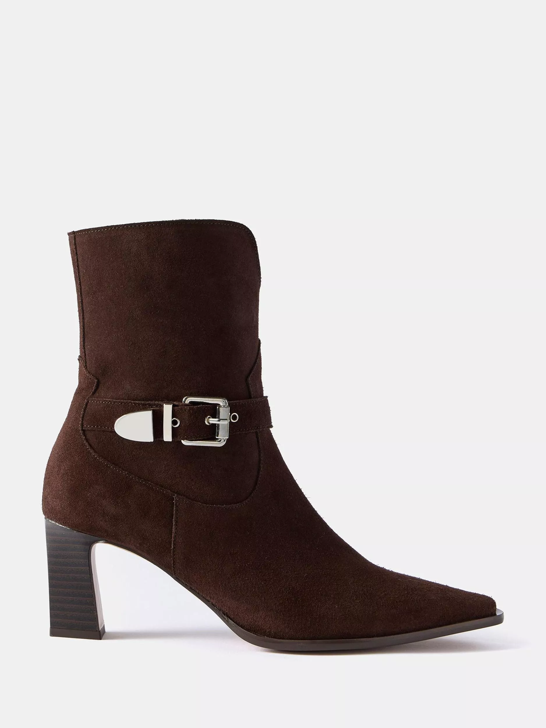 These Blair suede ankle boots feature a pointed toe, high heel, silver tone buckle detail with a zip fastening through the sides.