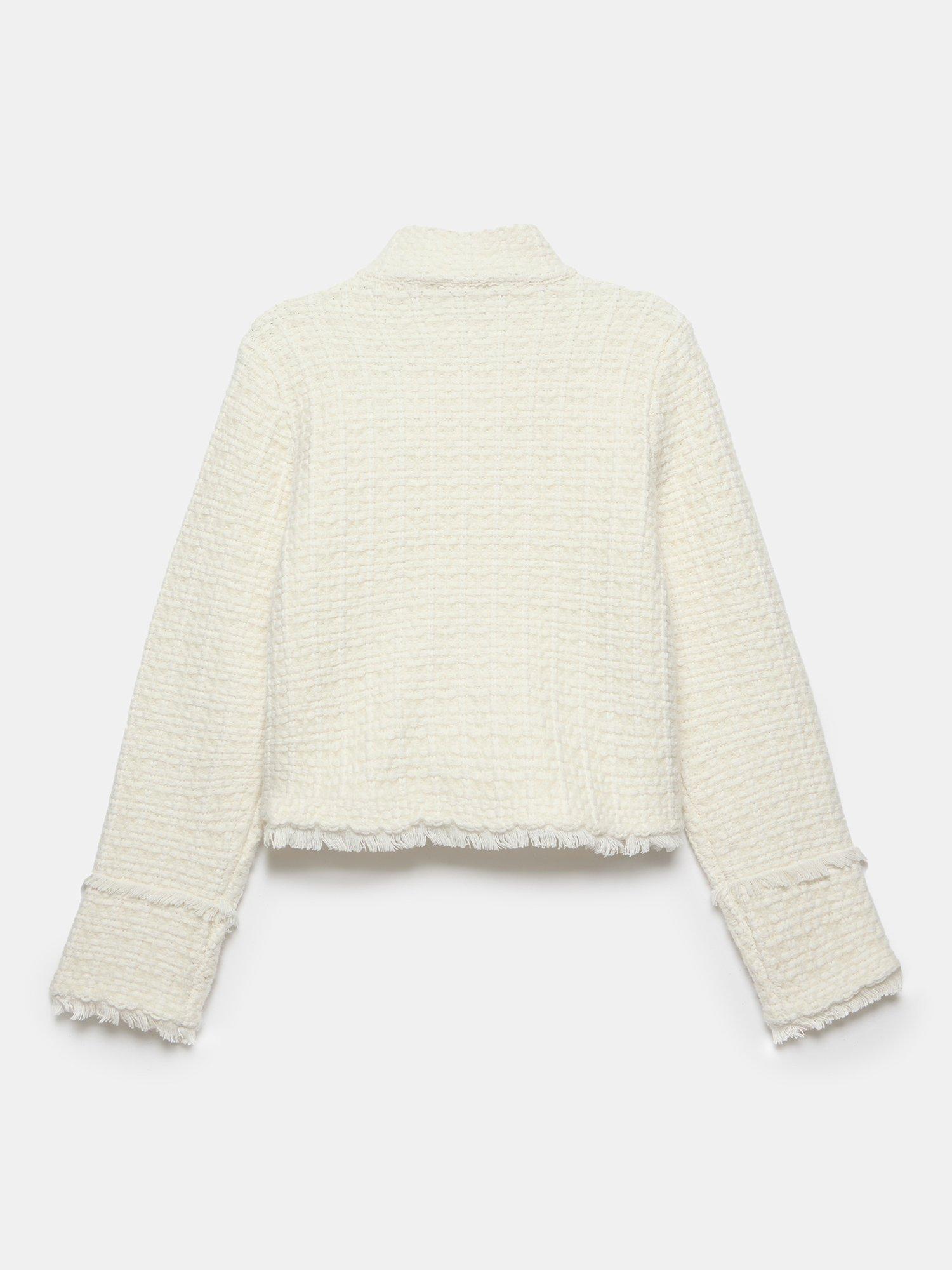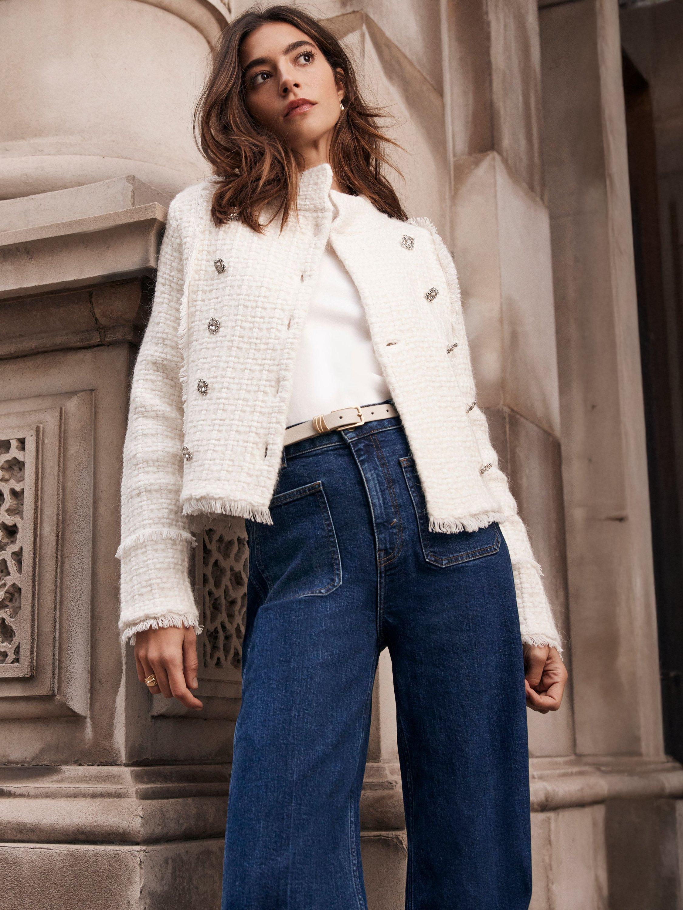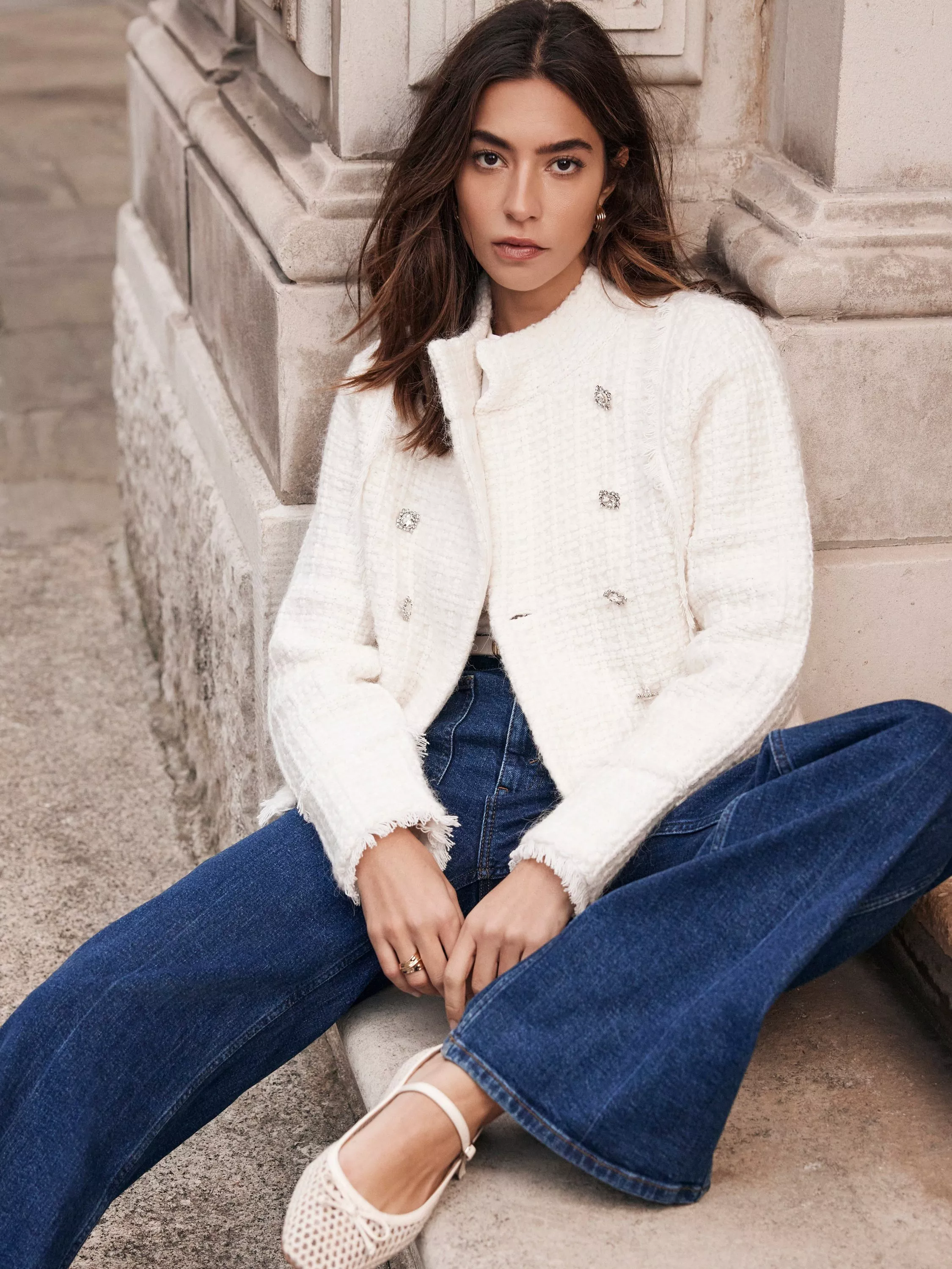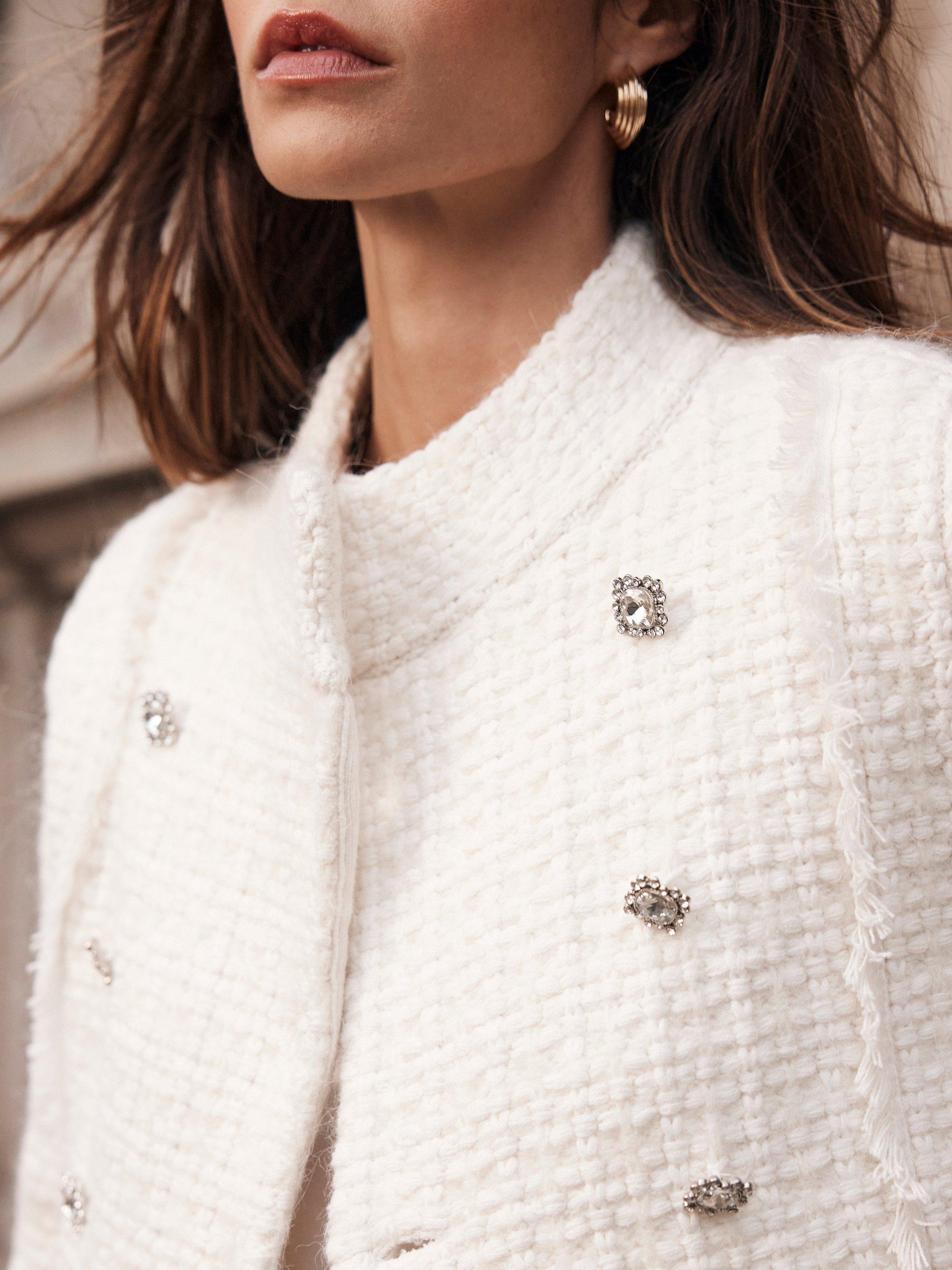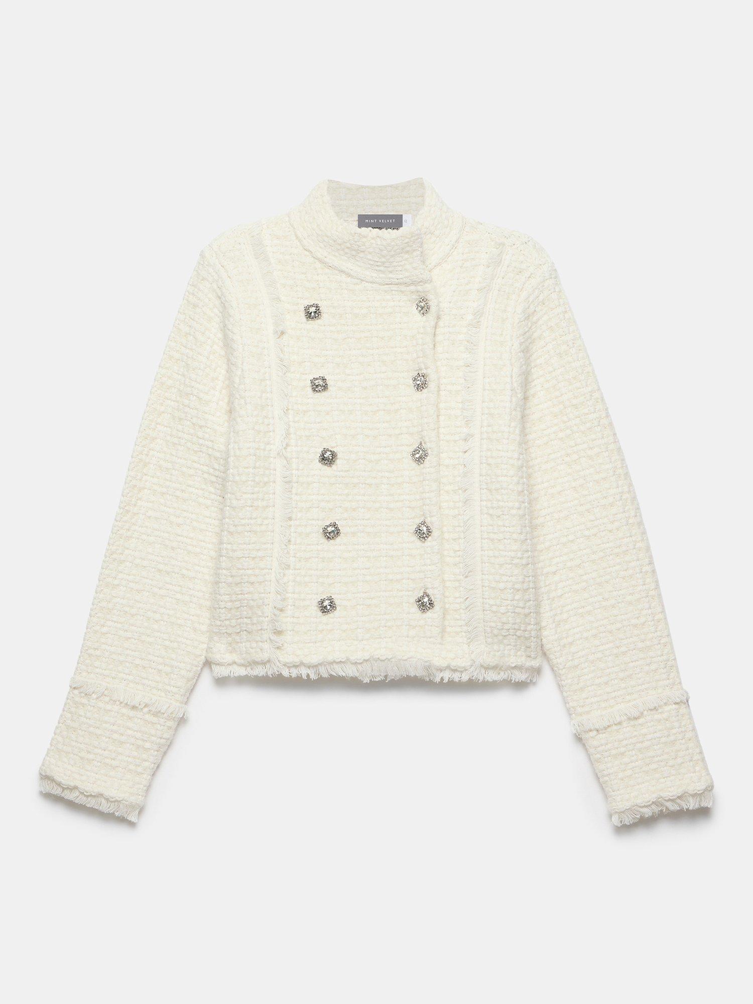 A boucle knit jacket in a cropped silhouette with a high neckline, long sleeves, raw edge detailing and a double breasted crystal button fastening through the front.