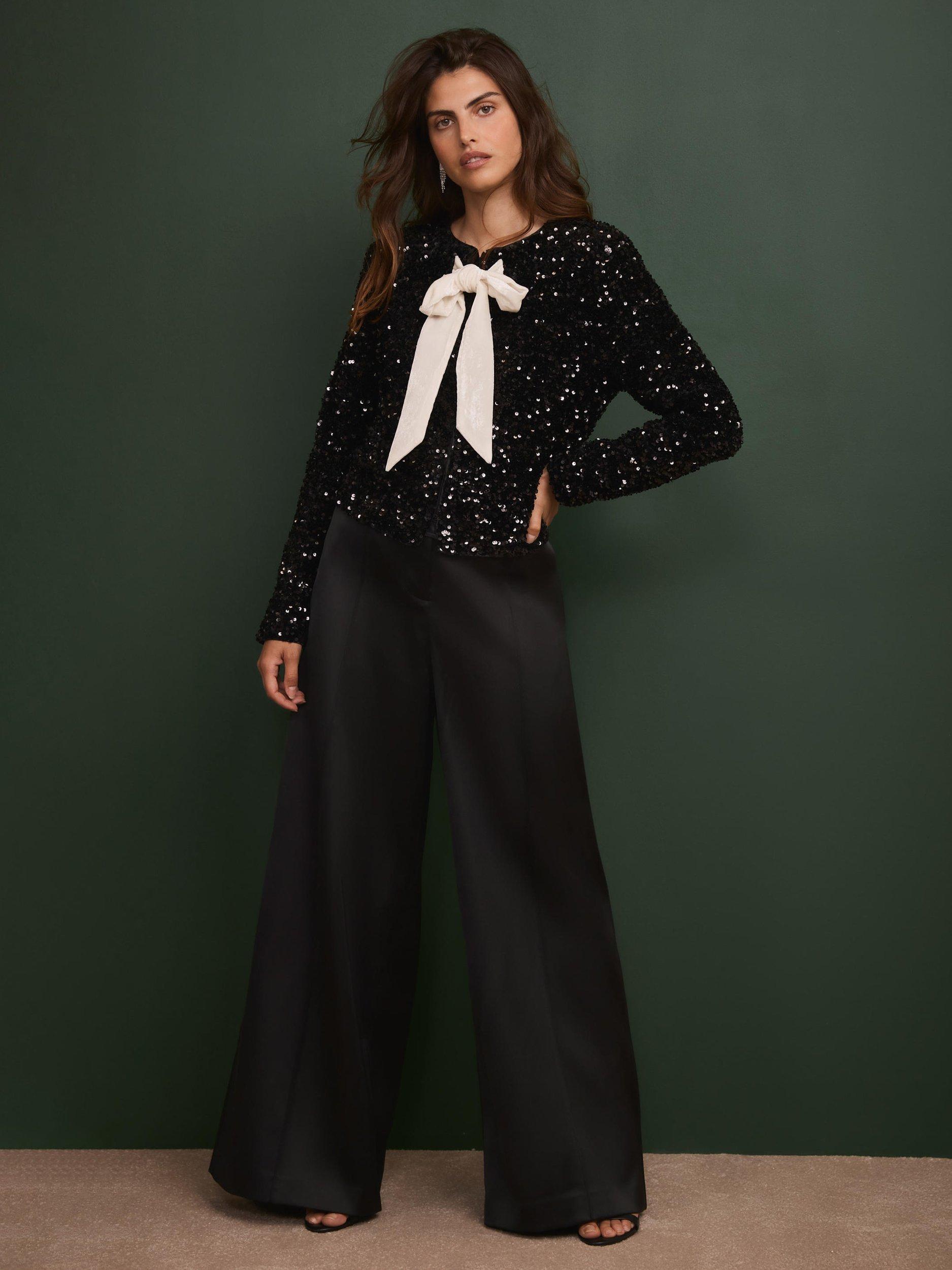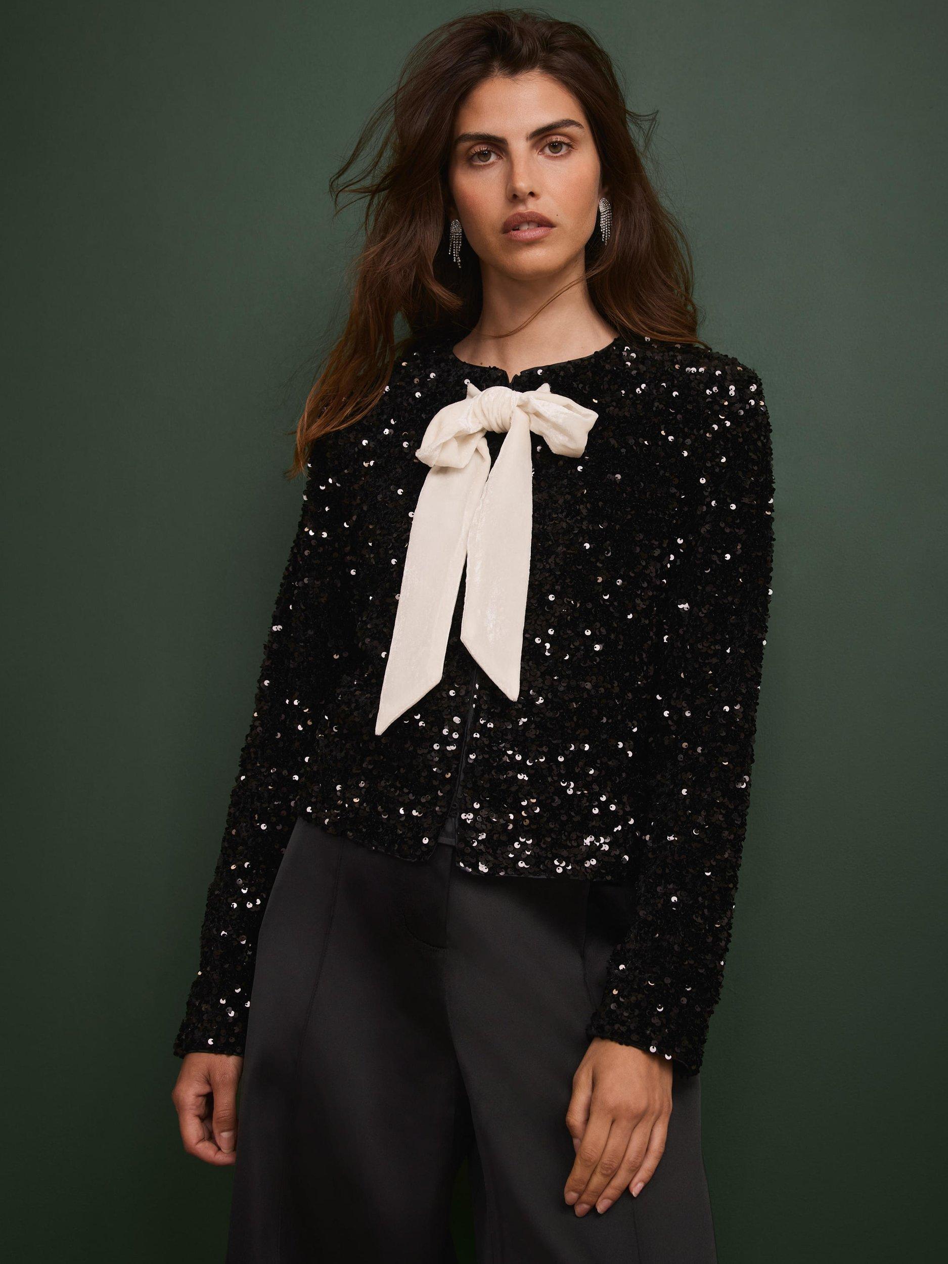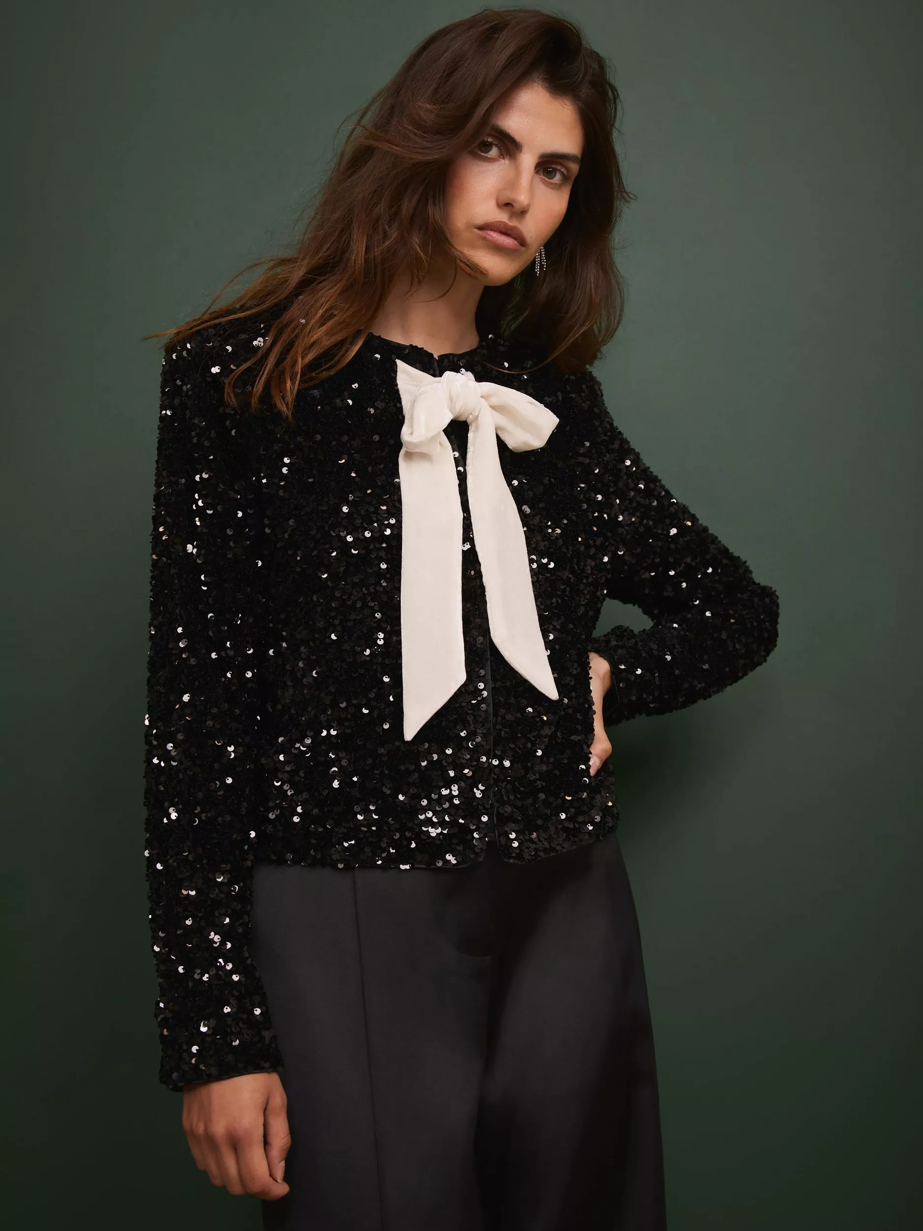 A sequin jacket from Mint Velvet, with a flattering fit and soft lining that keep you comfortable as you move. Featuring a crew neckline, long sleeves and contrast bow fastening through the front.