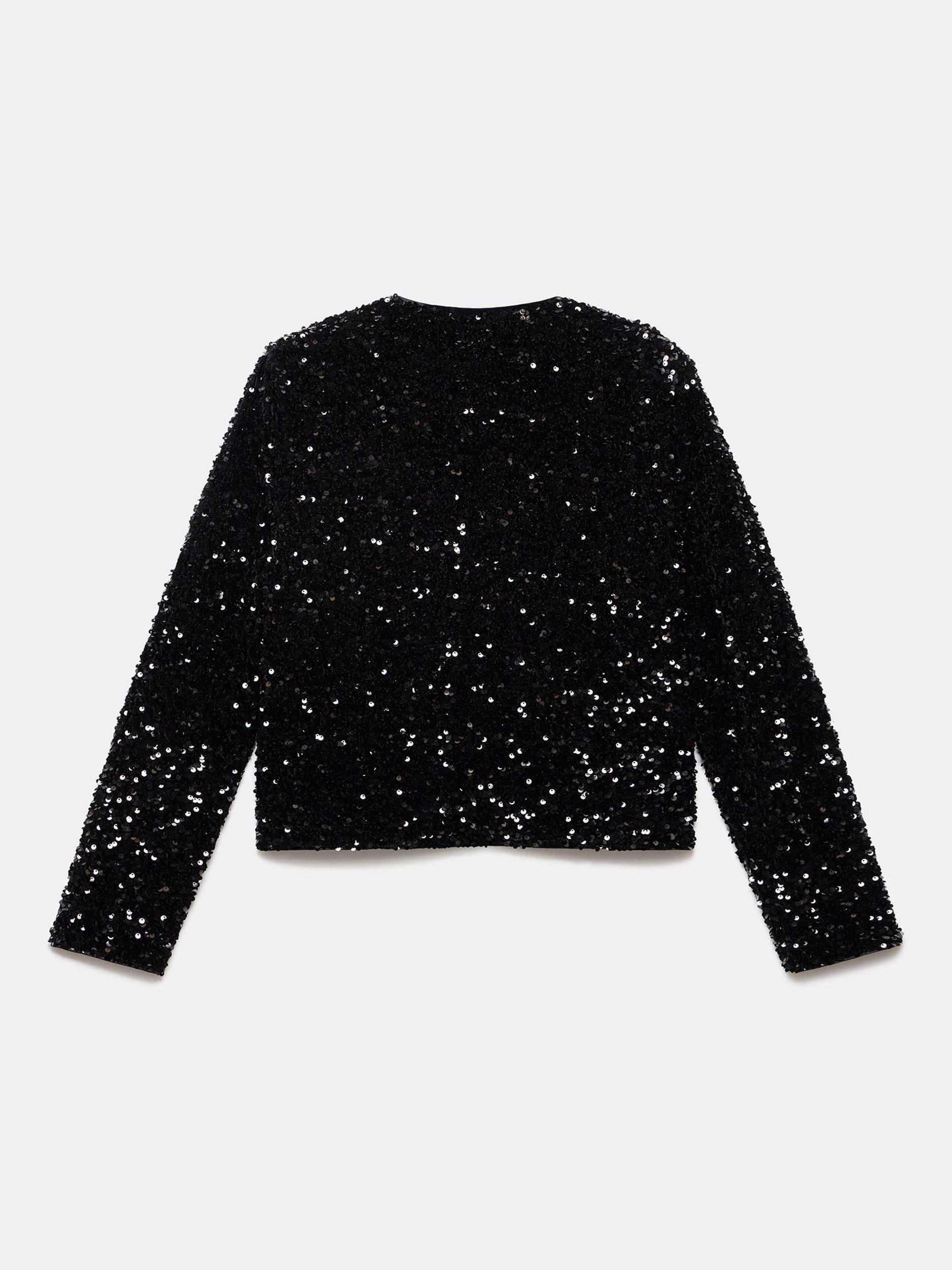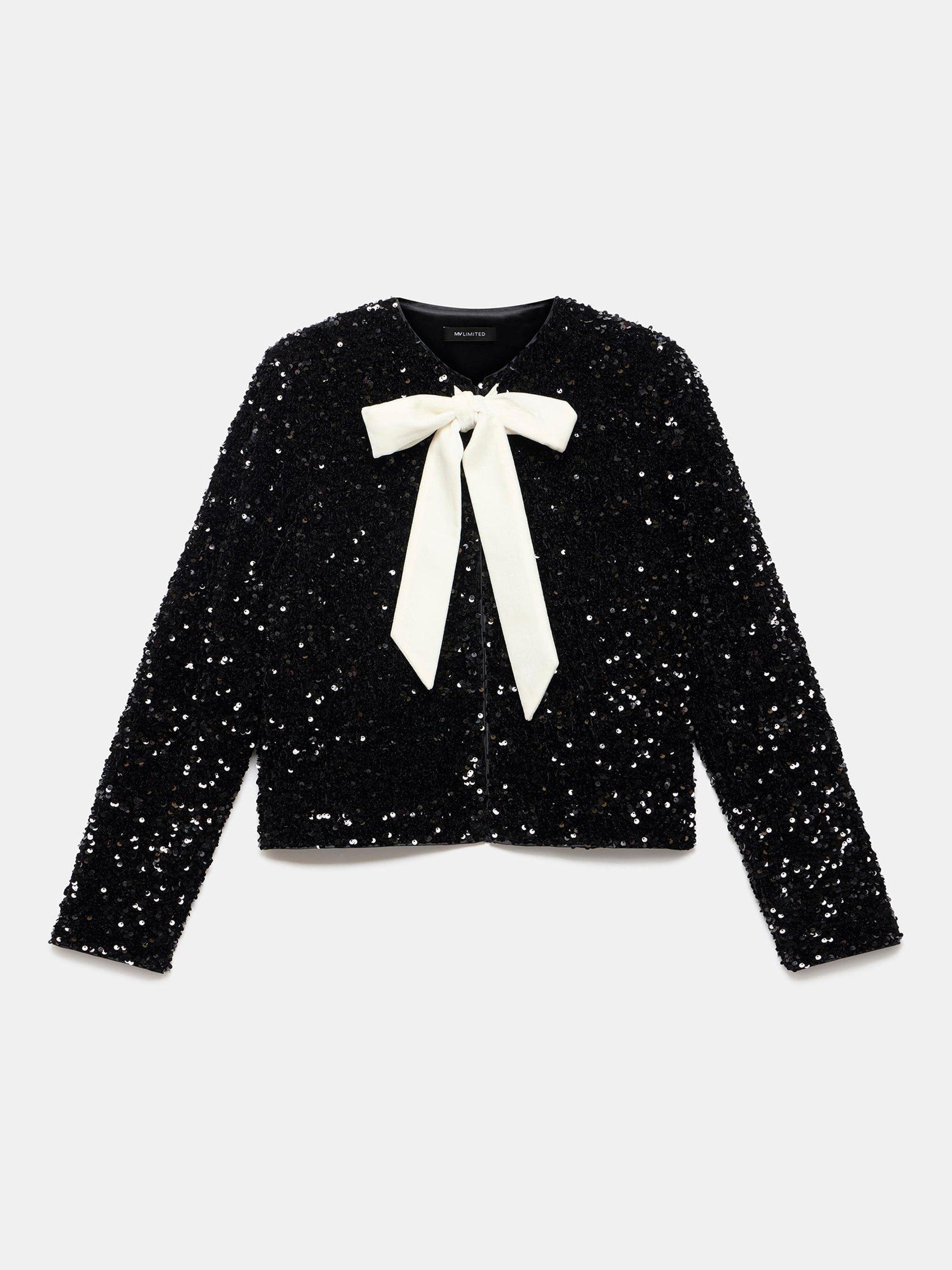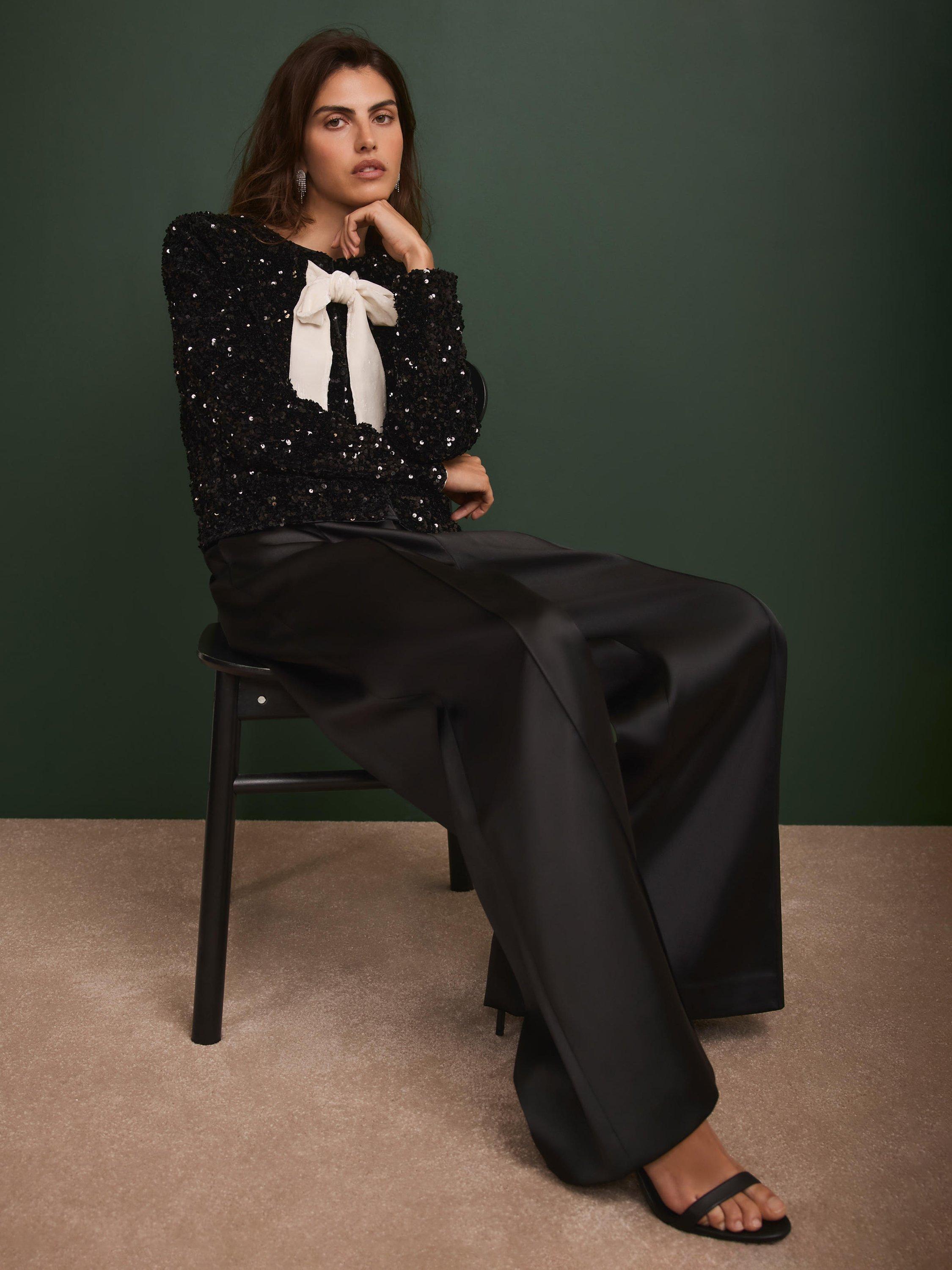 A sequin jacket from Mint Velvet, with a flattering fit and soft lining that keep you comfortable as you move. Featuring a crew neckline, long sleeves and contrast bow fastening through the front.