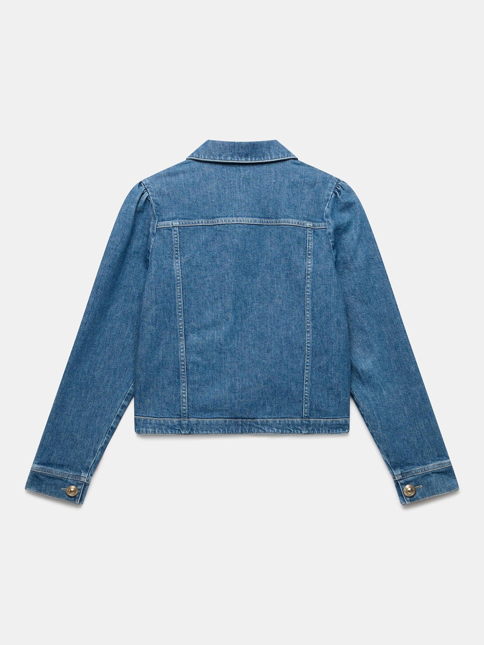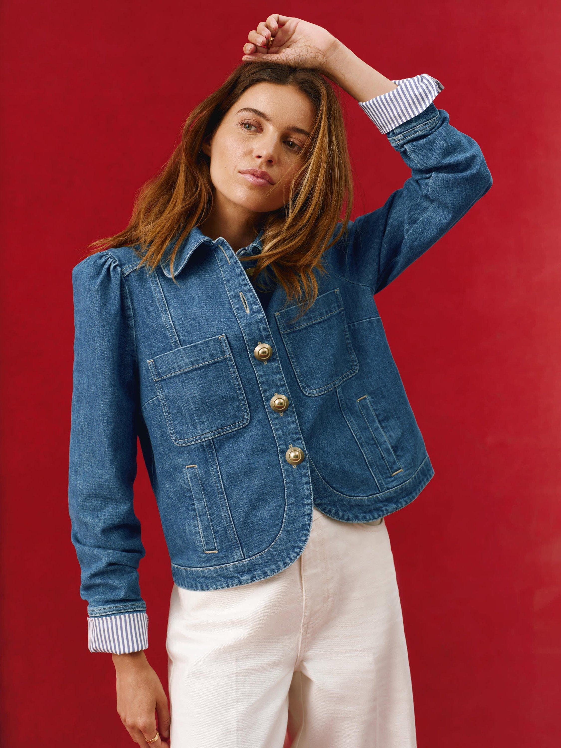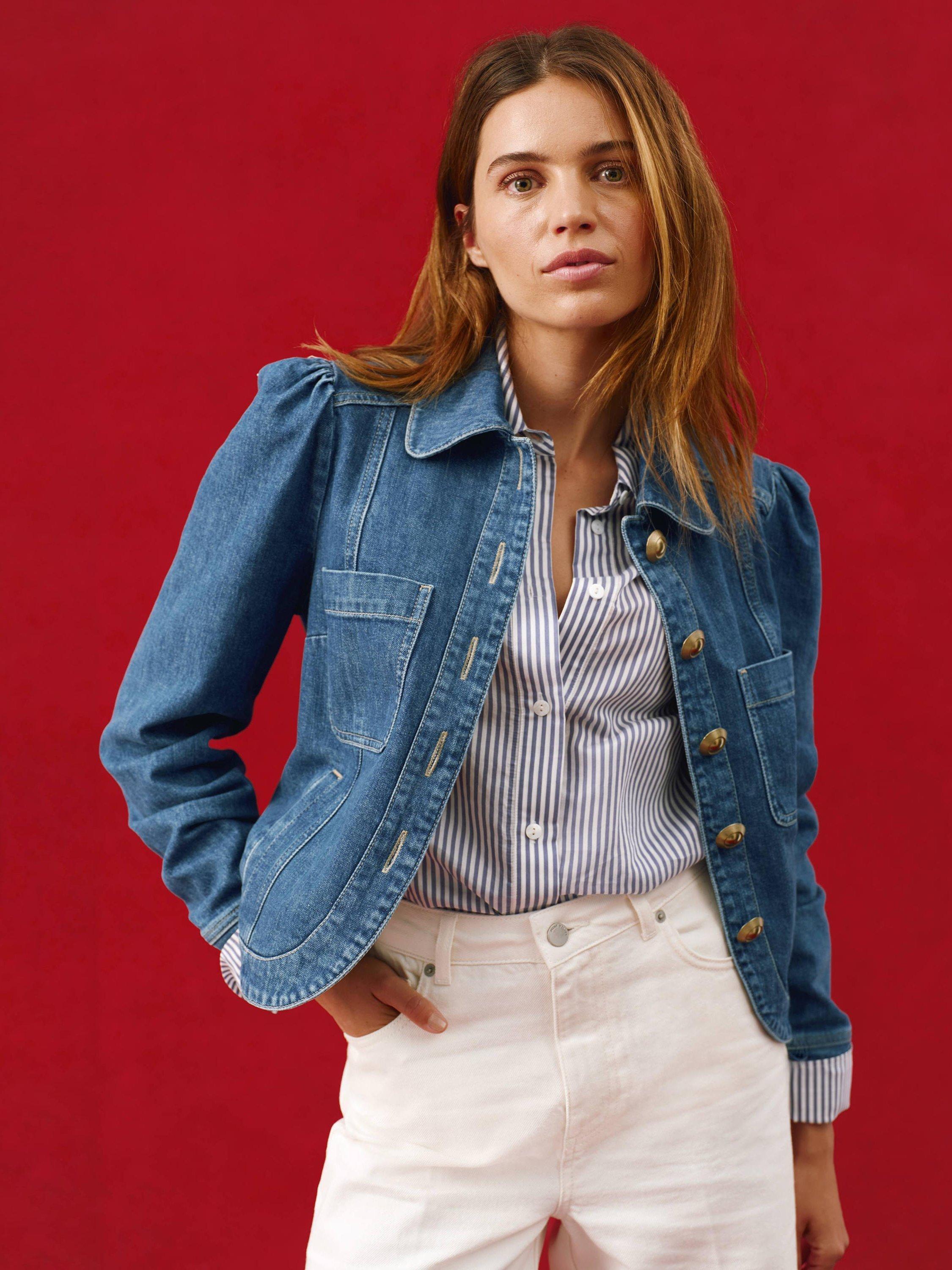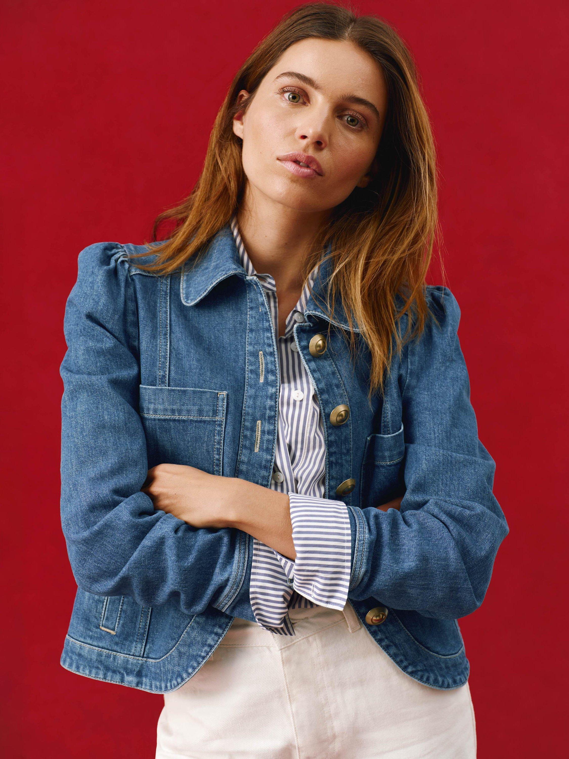 A denim jacket with a classic collar, puff shoulders, chest pockets, welt pockets, long sleeves, buttoned cuffs with gold-tone button fastening through the front.