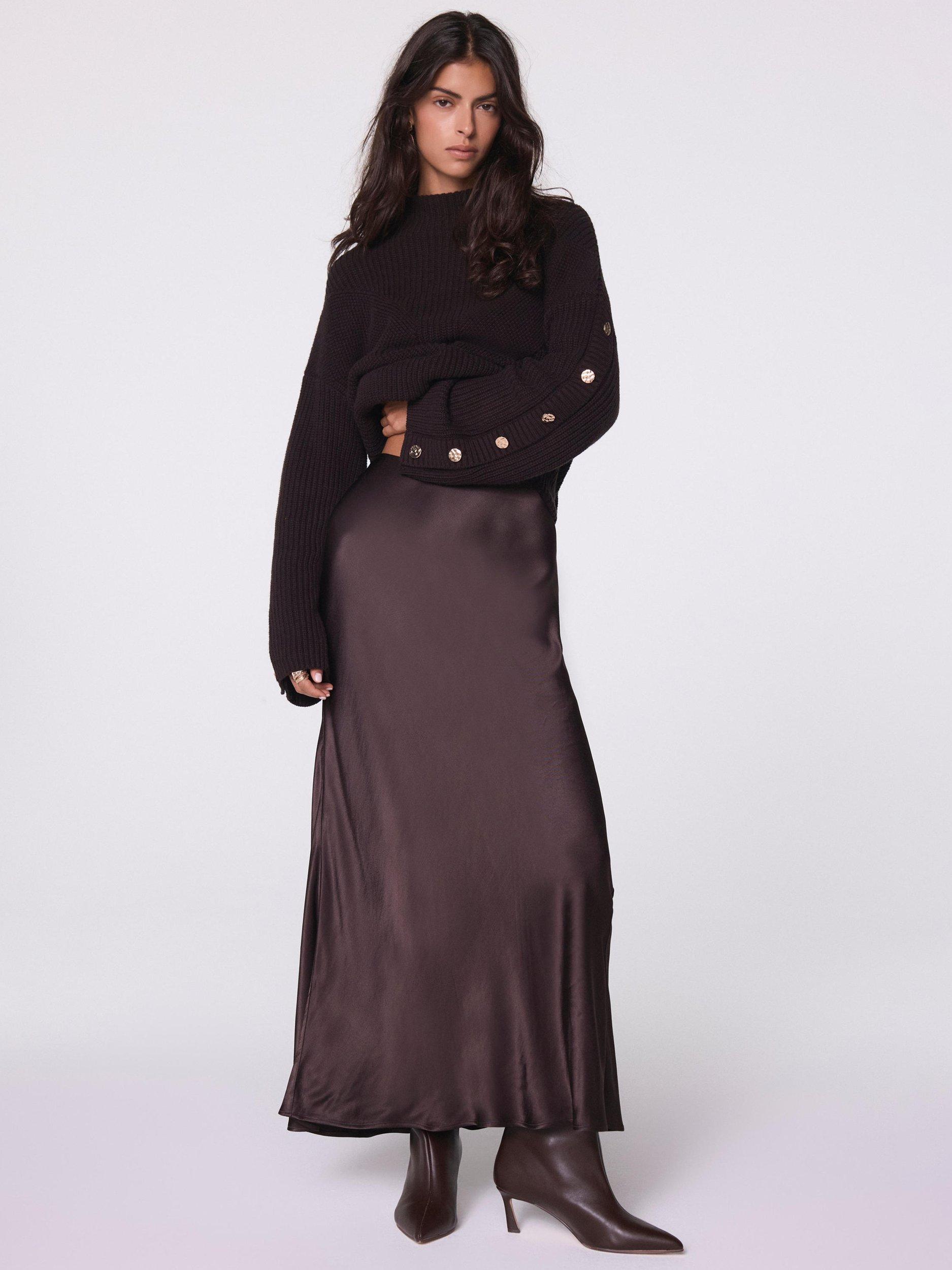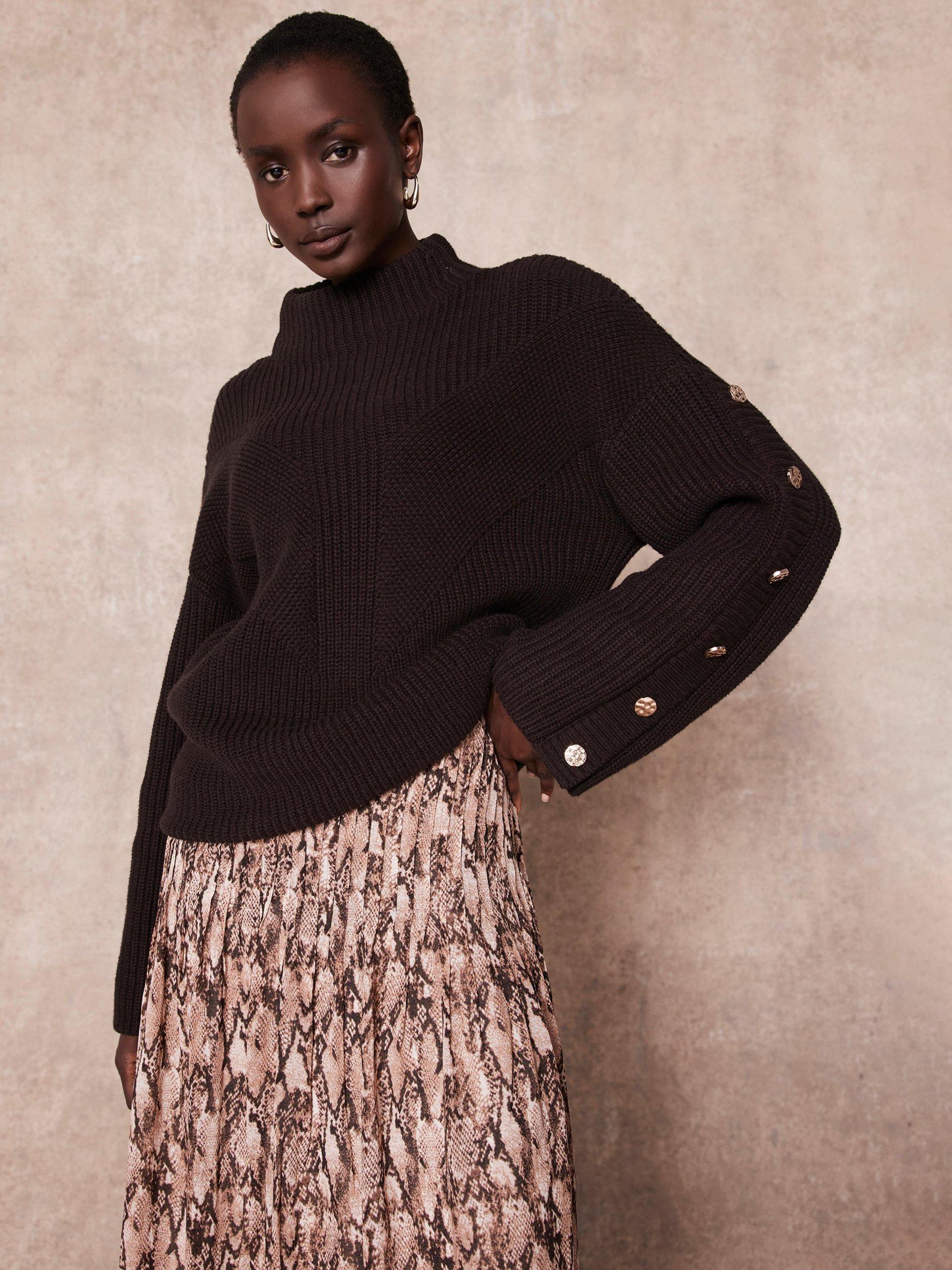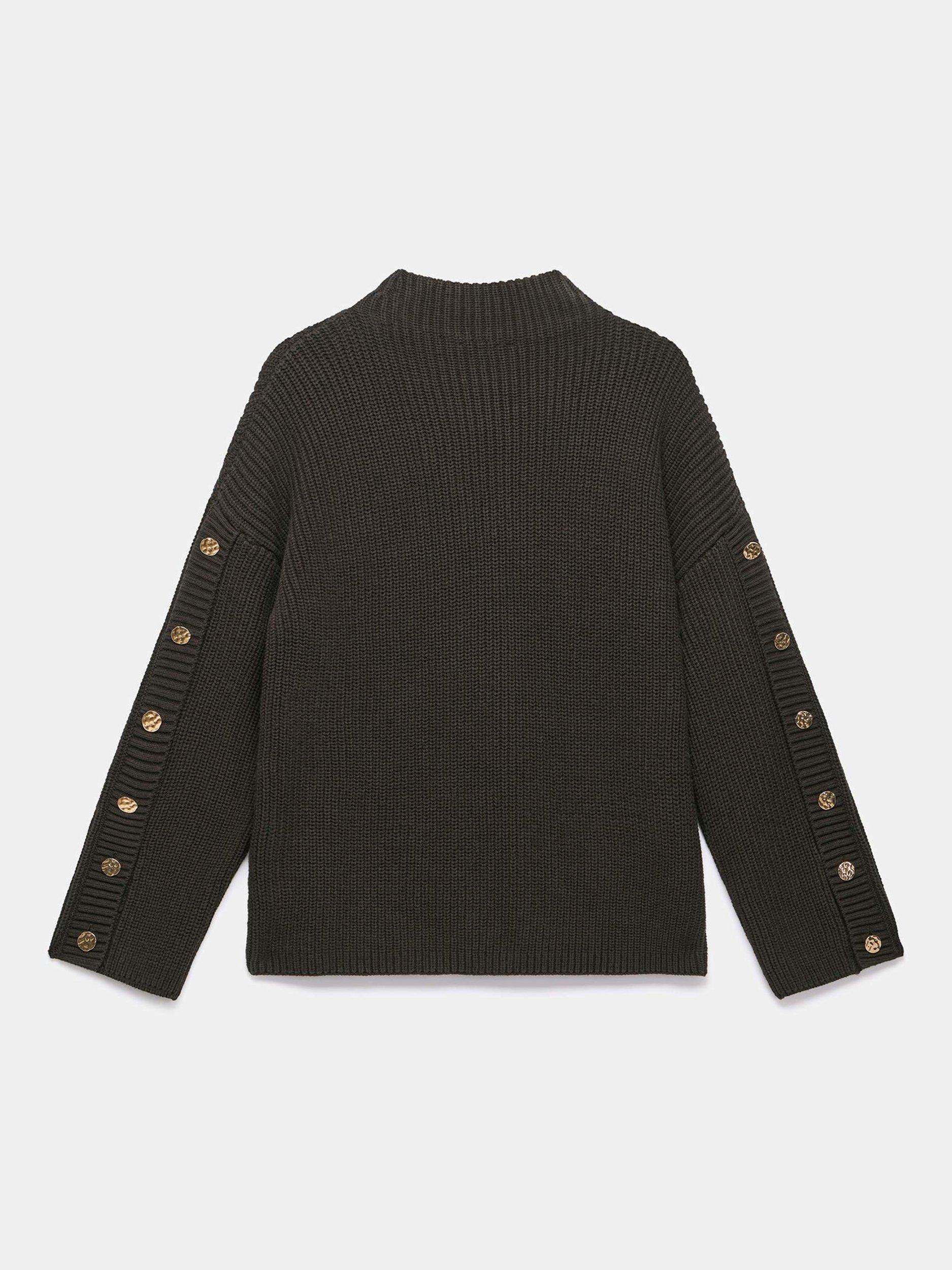 A knit jumper featuring a high neckline, stitch design, long sleeves and metallic-tone hammered button trim down the sleeves.