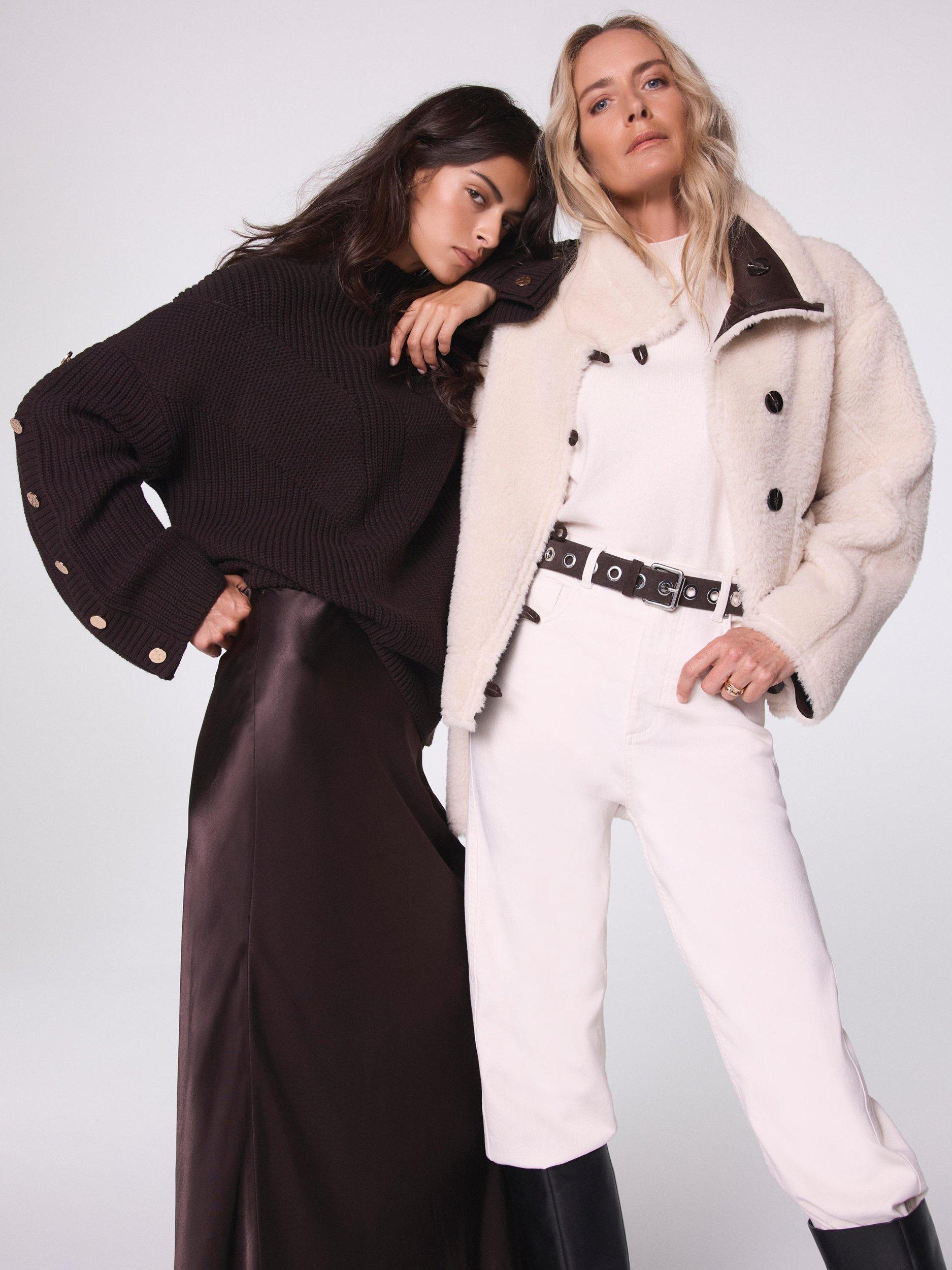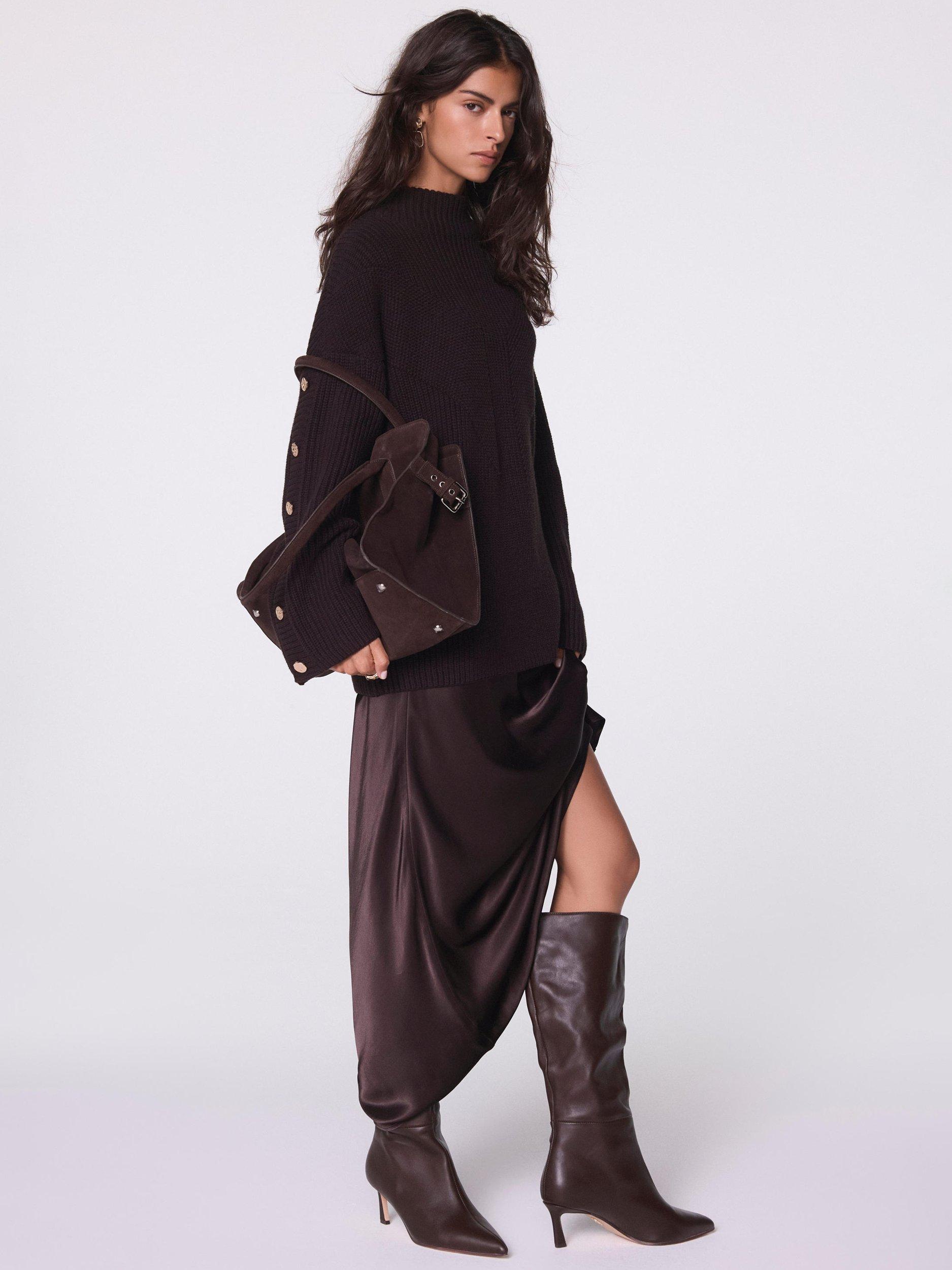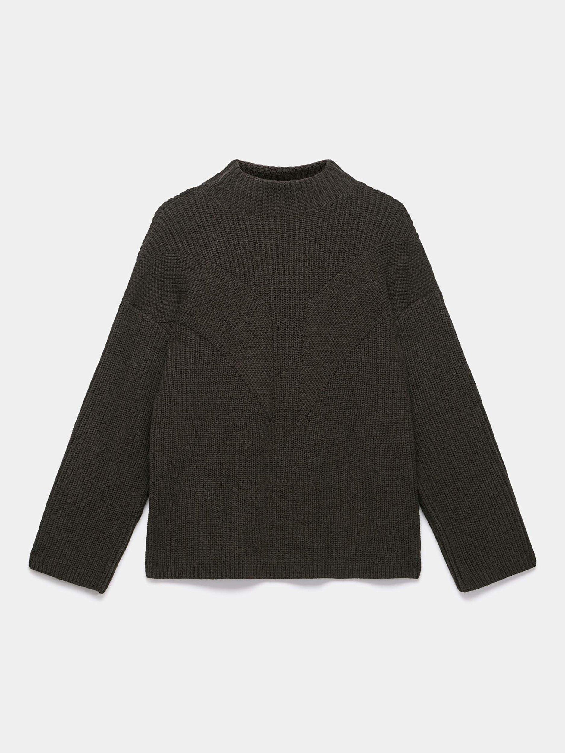 A knit jumper featuring a high neckline, stitch design, long sleeves and metallic-tone hammered button trim down the sleeves.