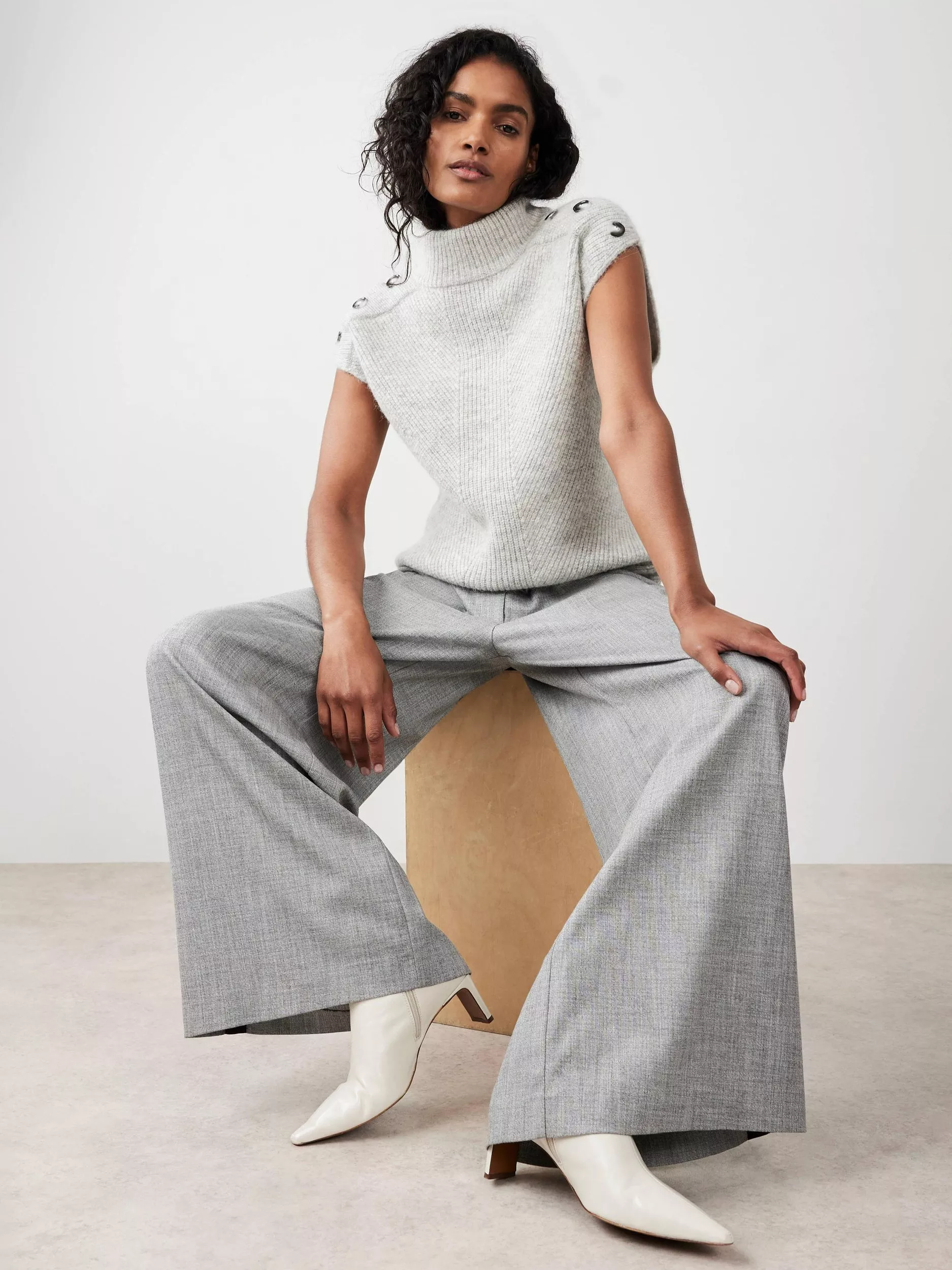 A knit sleeveless top featuring a high neckline and button detailing across the shoulders.