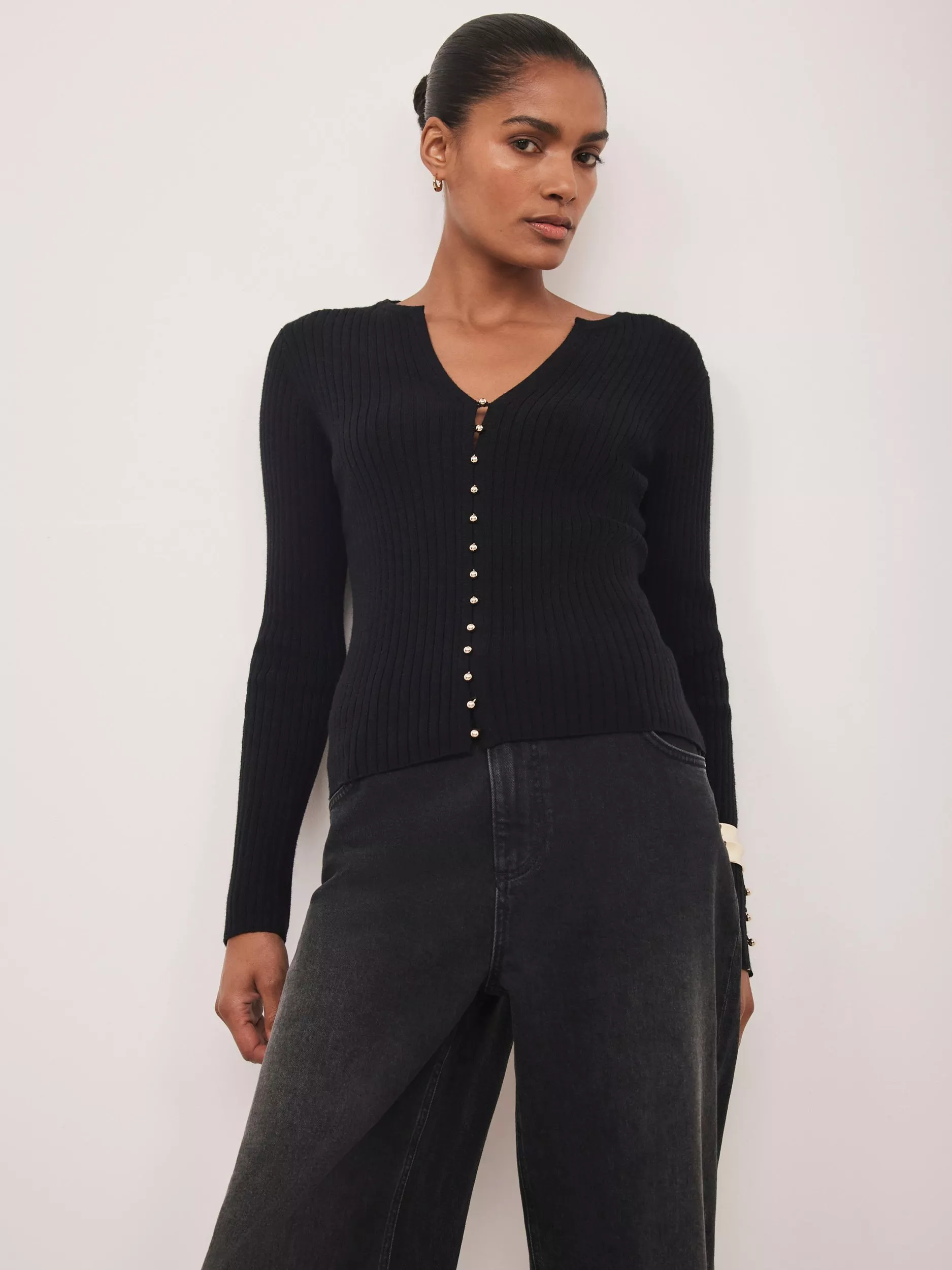 A ribbed top with a V-neckline, long sleeves with metallic-tone button fastenings through the front.