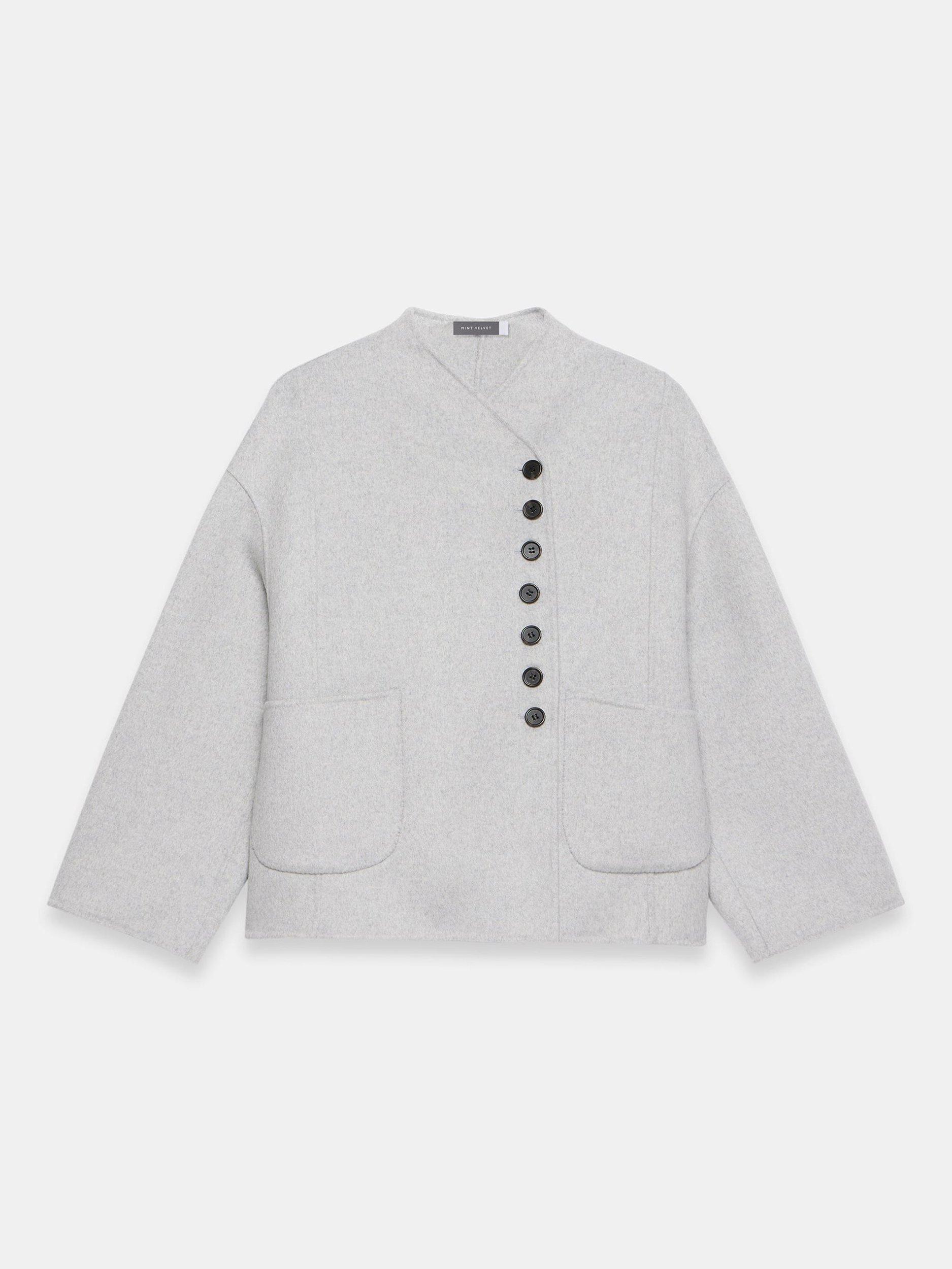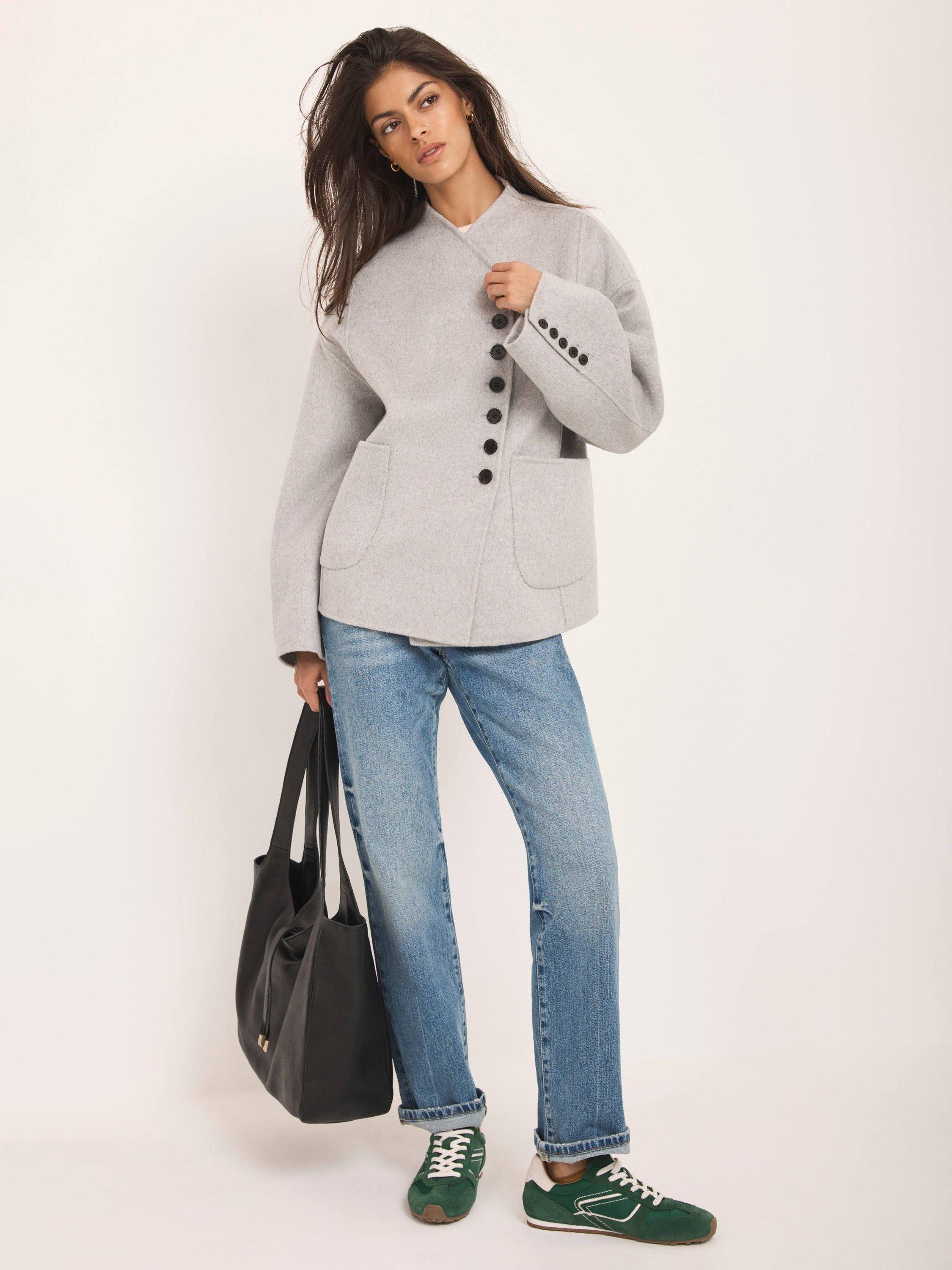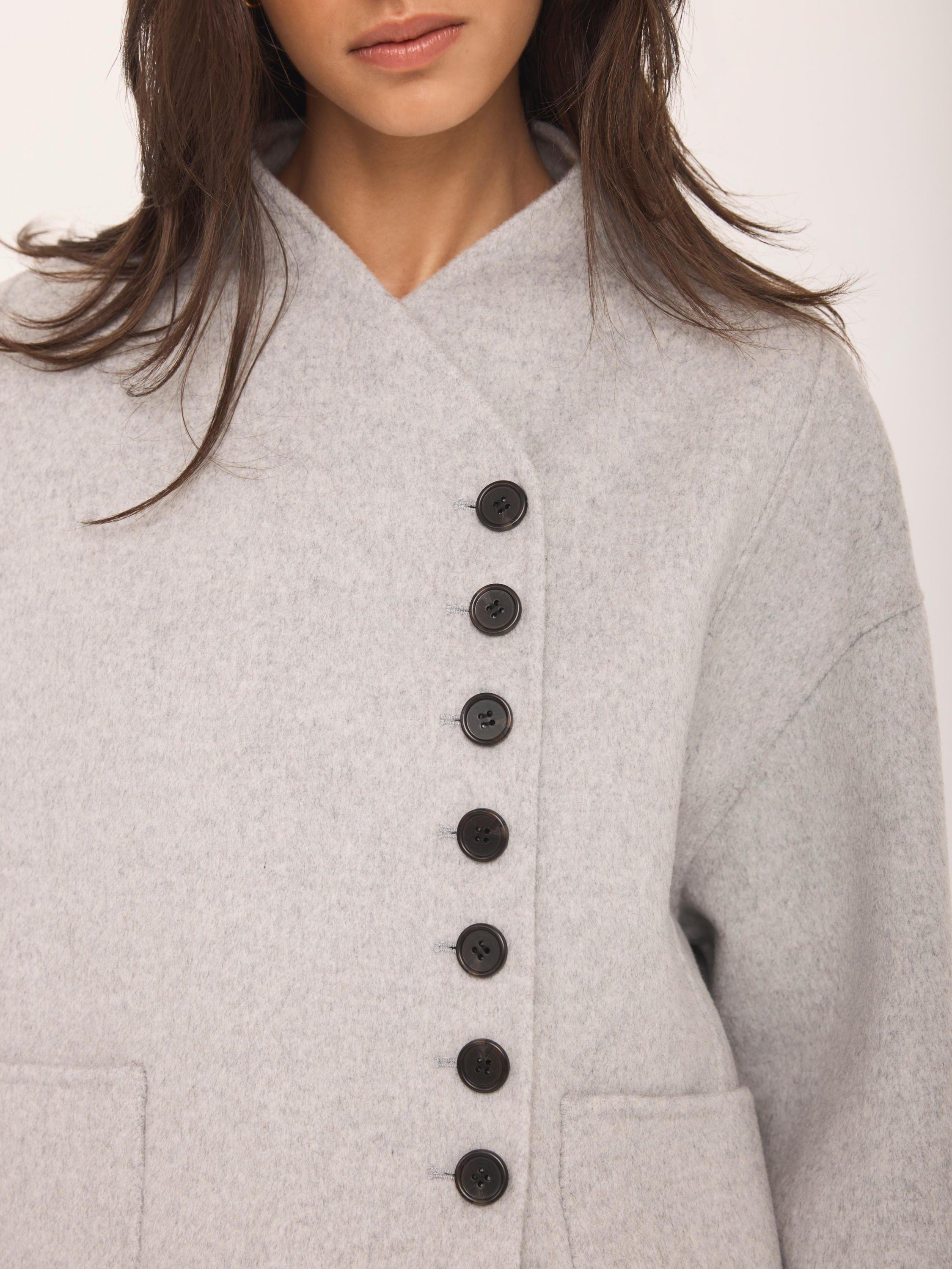 A wool-blend jacket in a double-breasted silhouette featuring a V-neckline, long wide sleeves, buttoned cuffs, side pockets and a button fastening through the front.