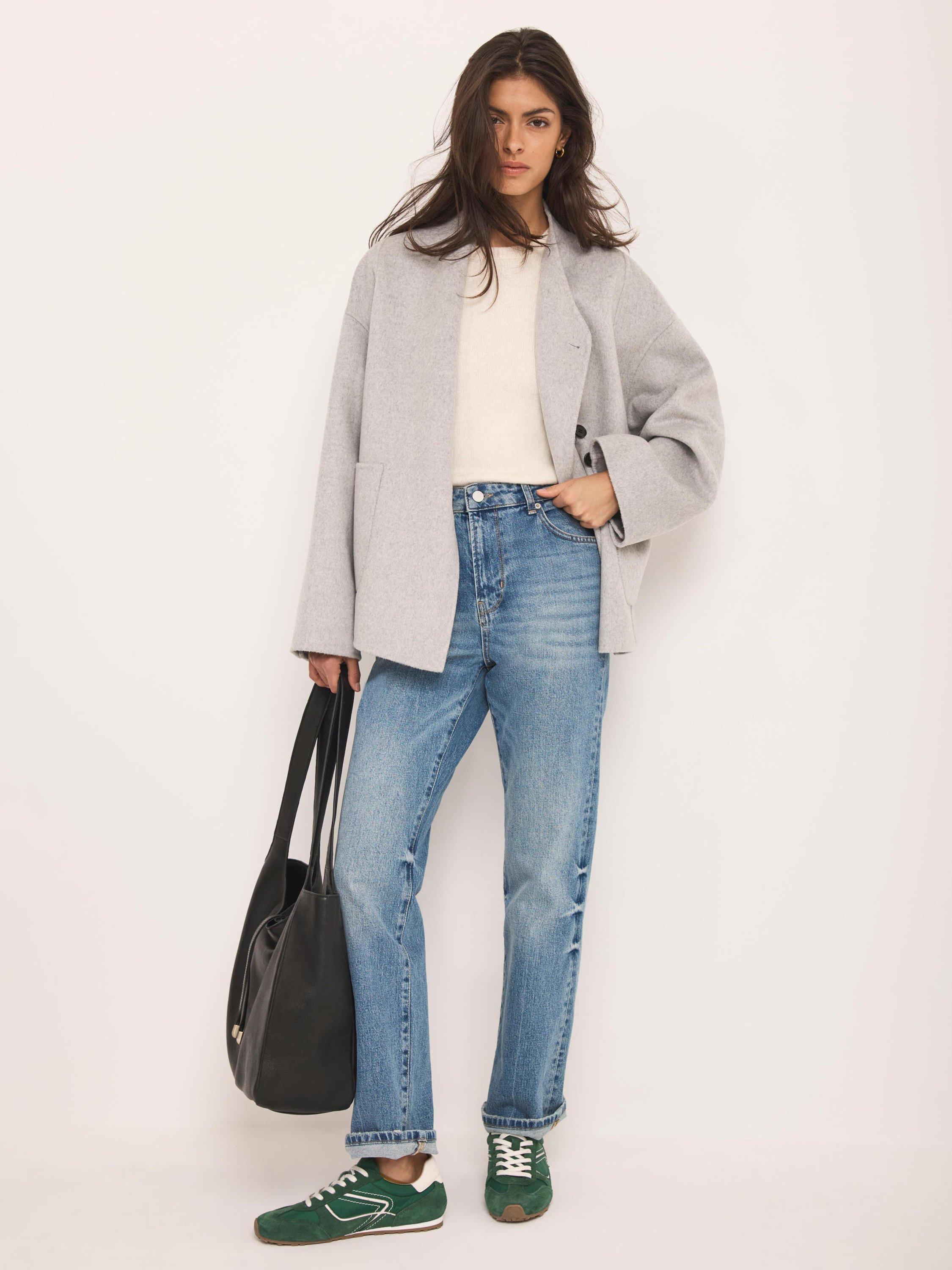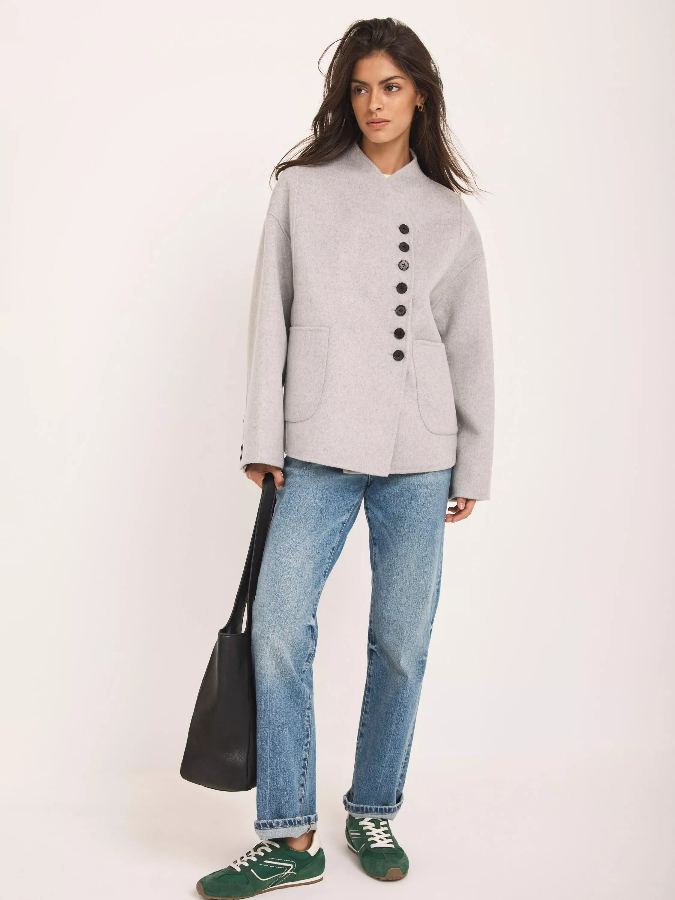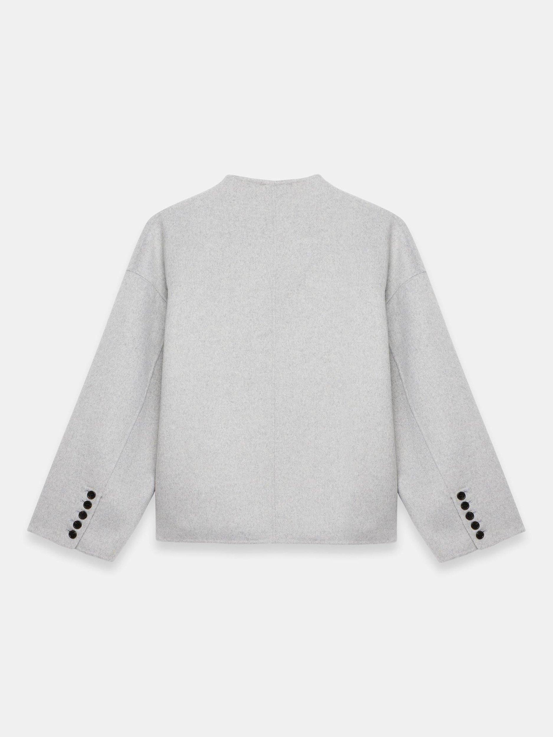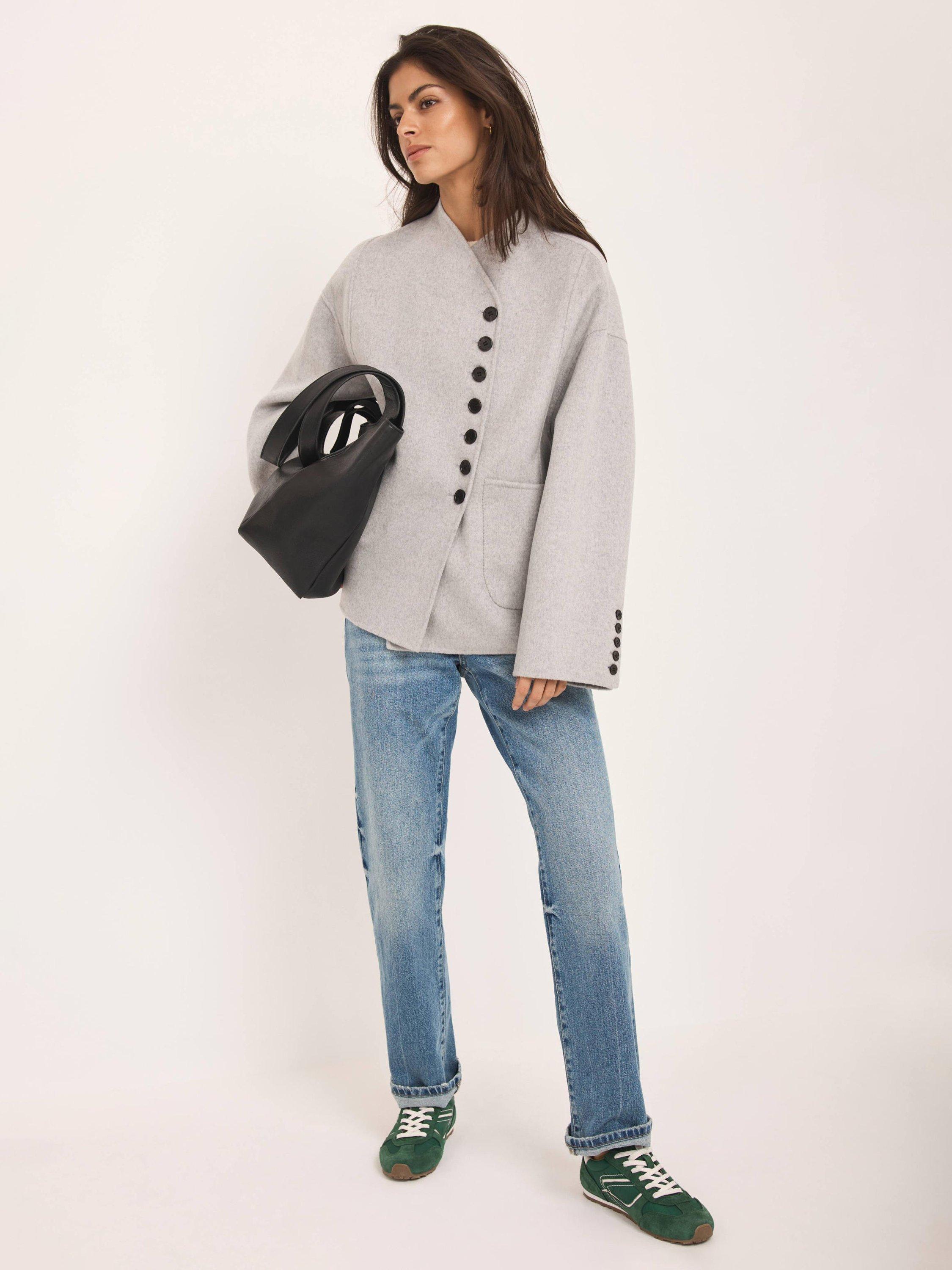 A wool-blend jacket in a double-breasted silhouette featuring a V-neckline, long wide sleeves, buttoned cuffs, side pockets and a button fastening through the front.