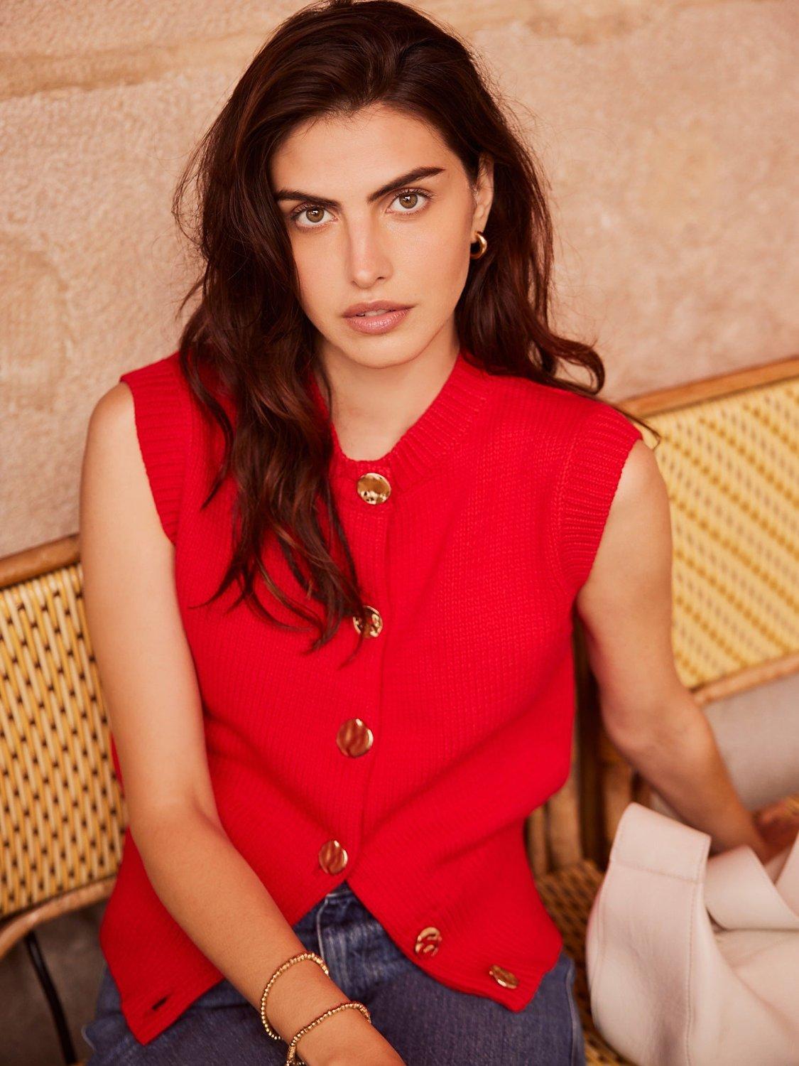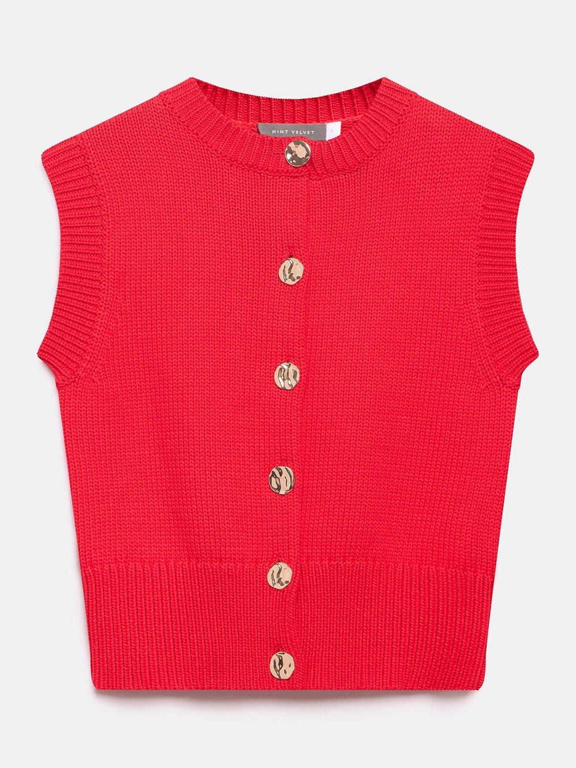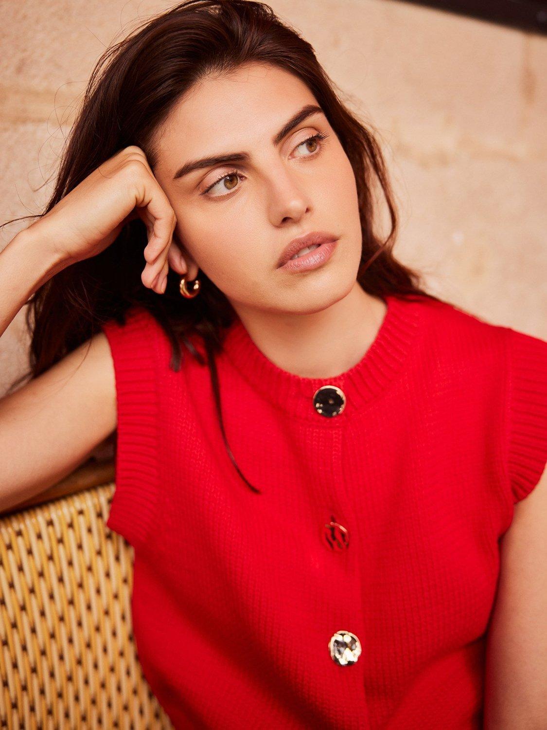 A sleeveless top featuring a crew neckline, ribbed trim with a gold-tone button fastening through the front.