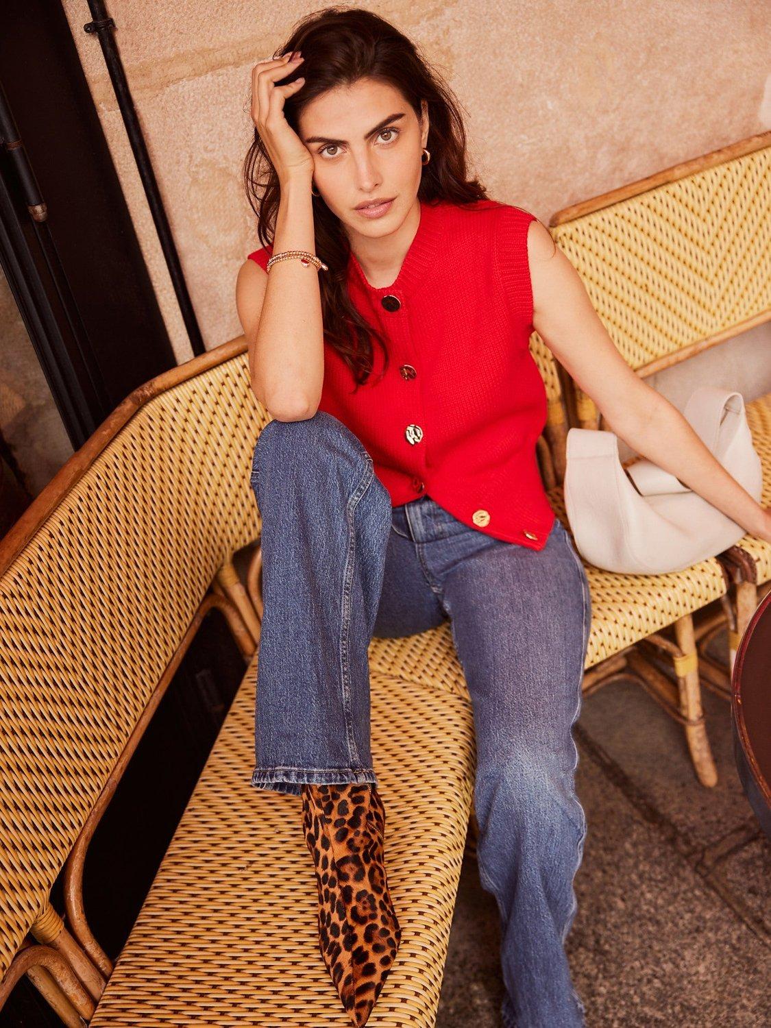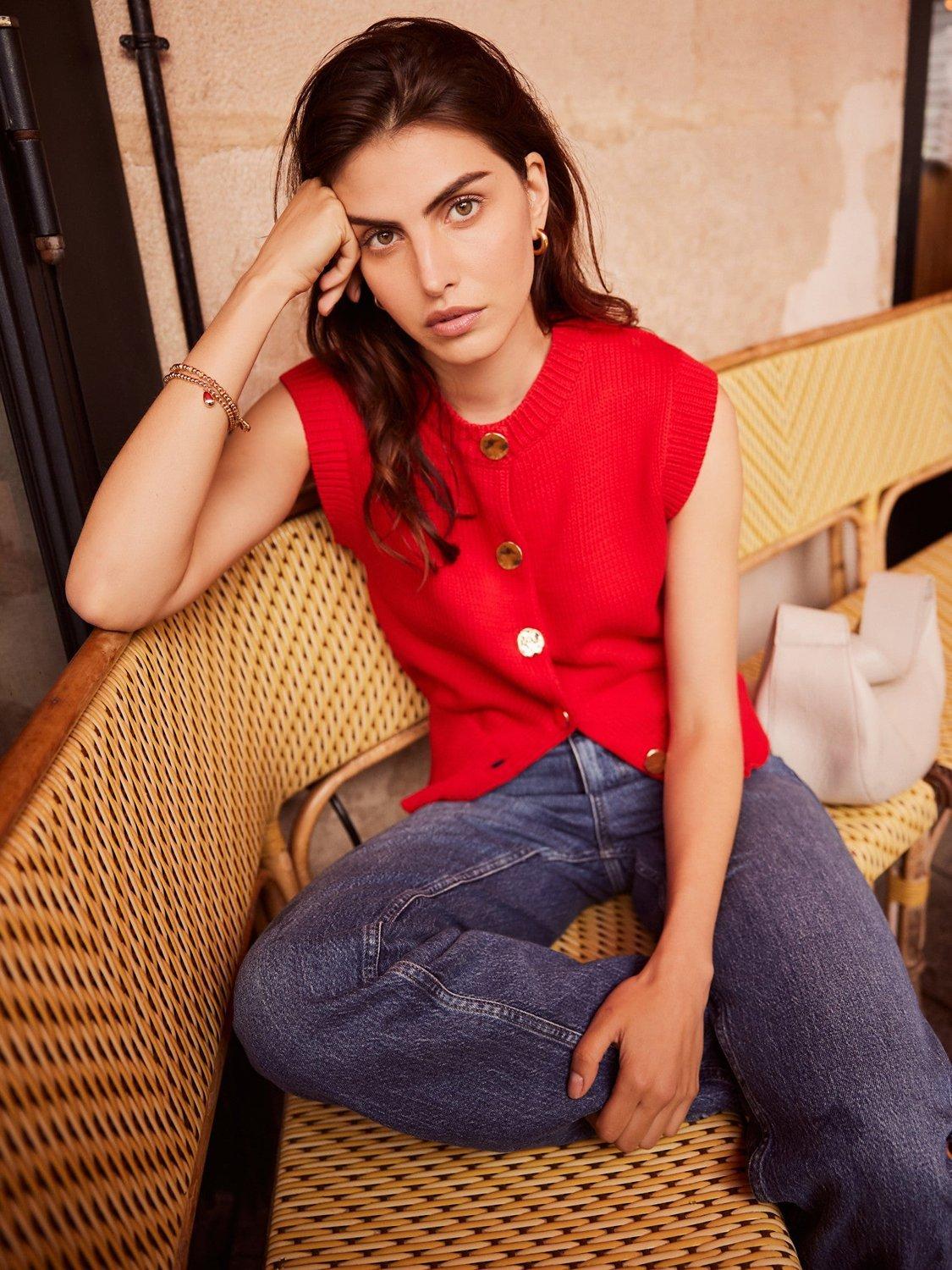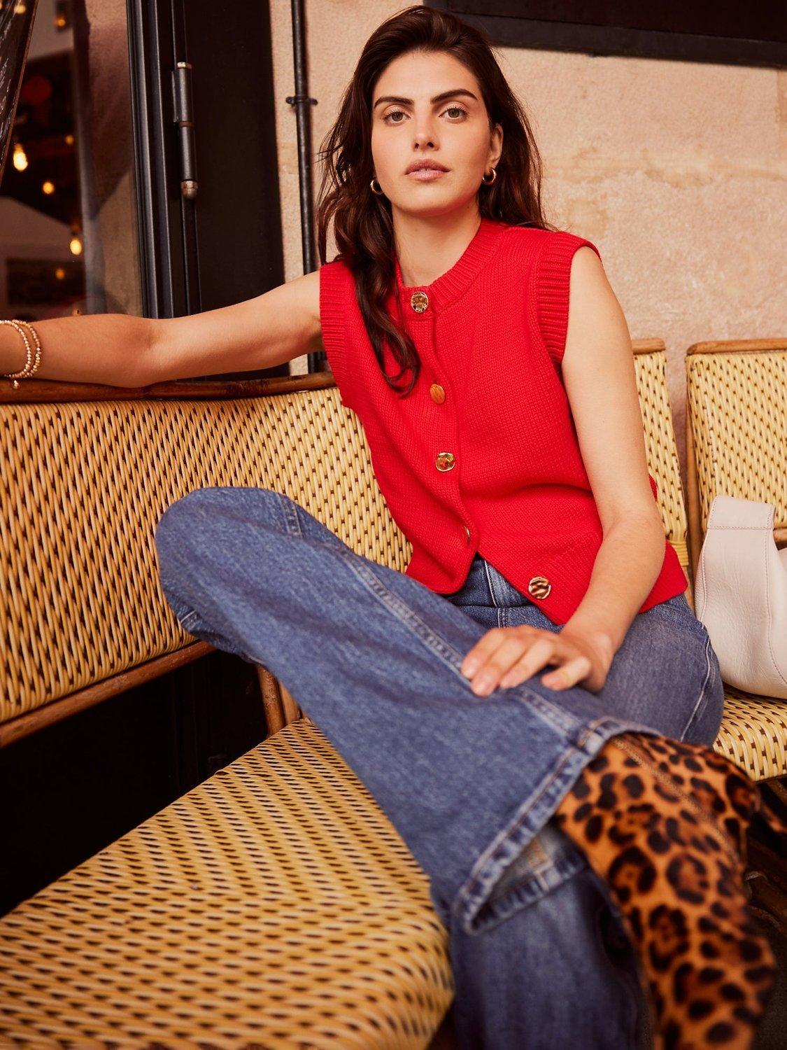 A sleeveless top featuring a crew neckline, ribbed trim with a gold-tone button fastening through the front.