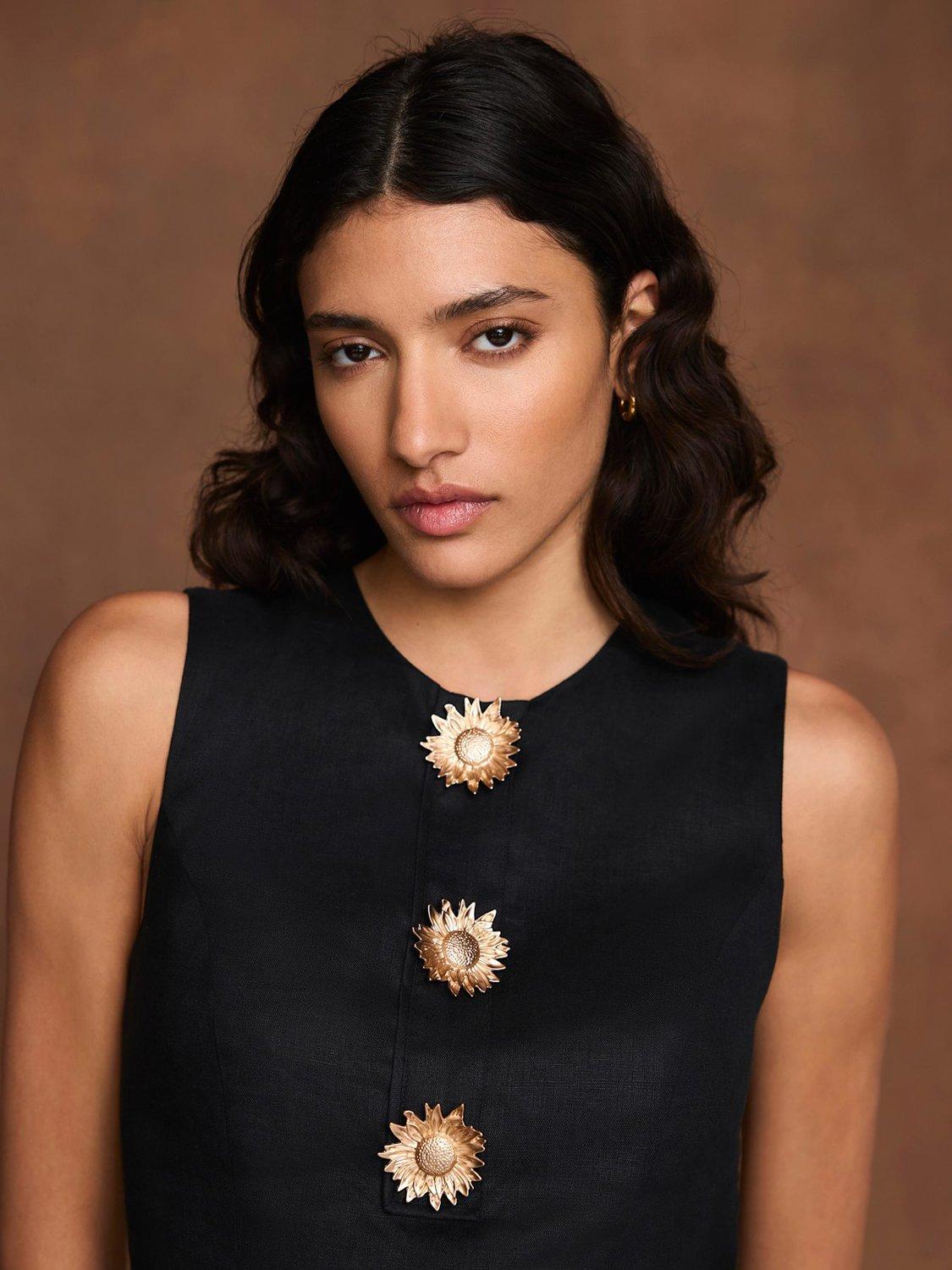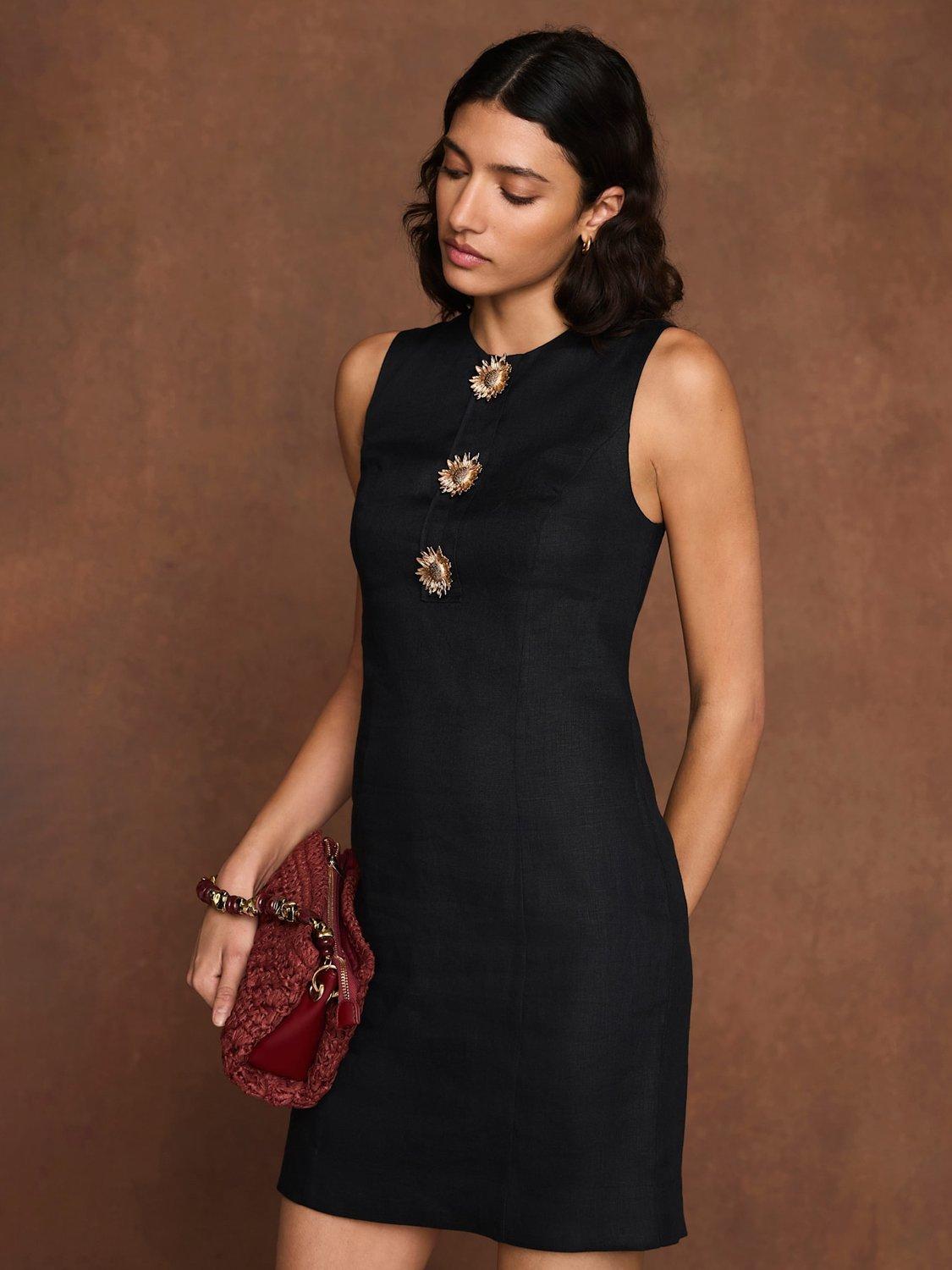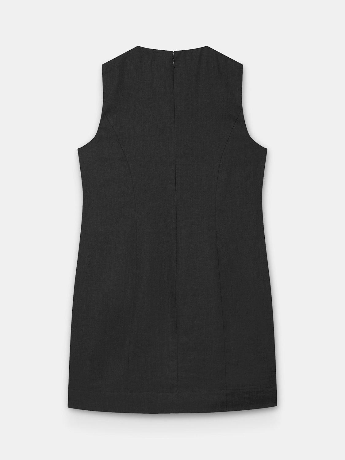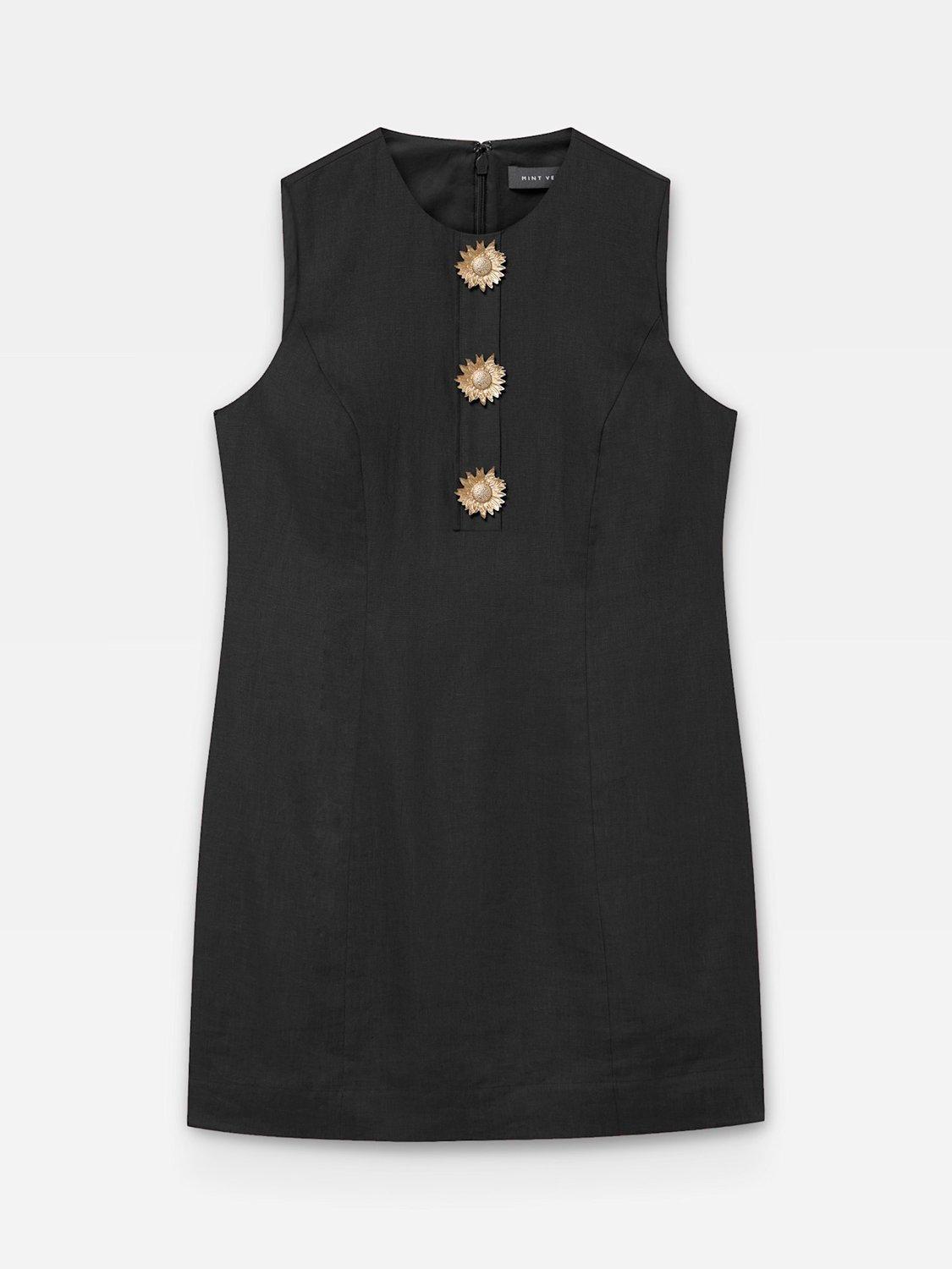 Black sleeveless dress in a mini silhouette, featuring a crew neckline, gold-tone statement buttons with a zip fastening through the back.