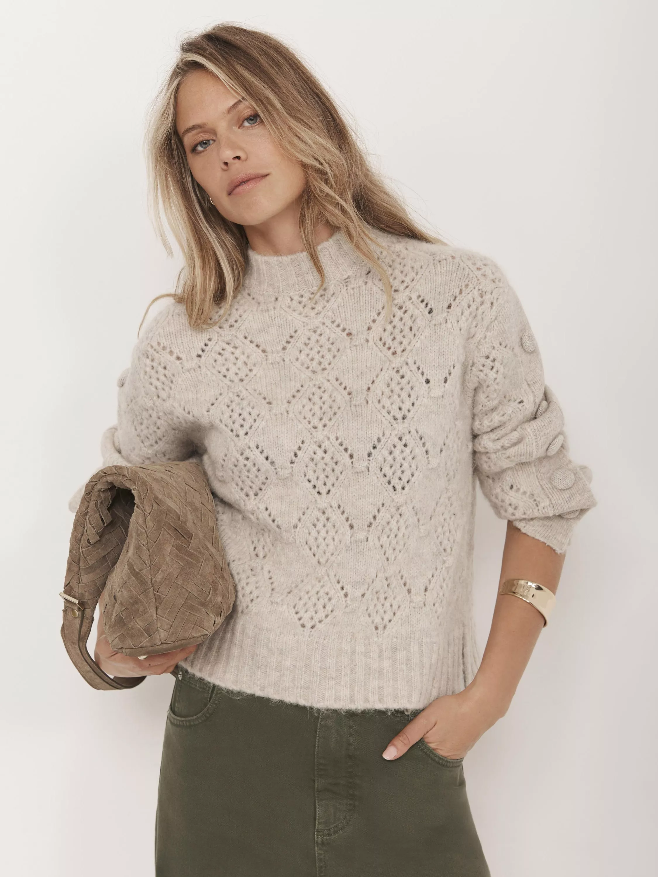 A cable knit jumper featuring a crew neckline, long sleeves with button trim.