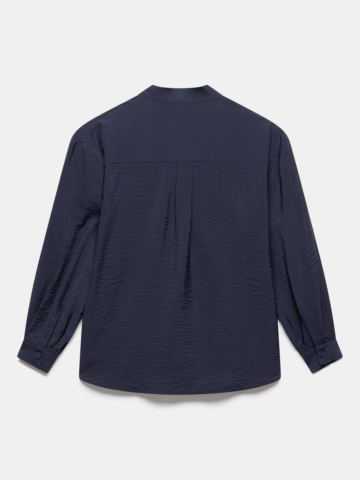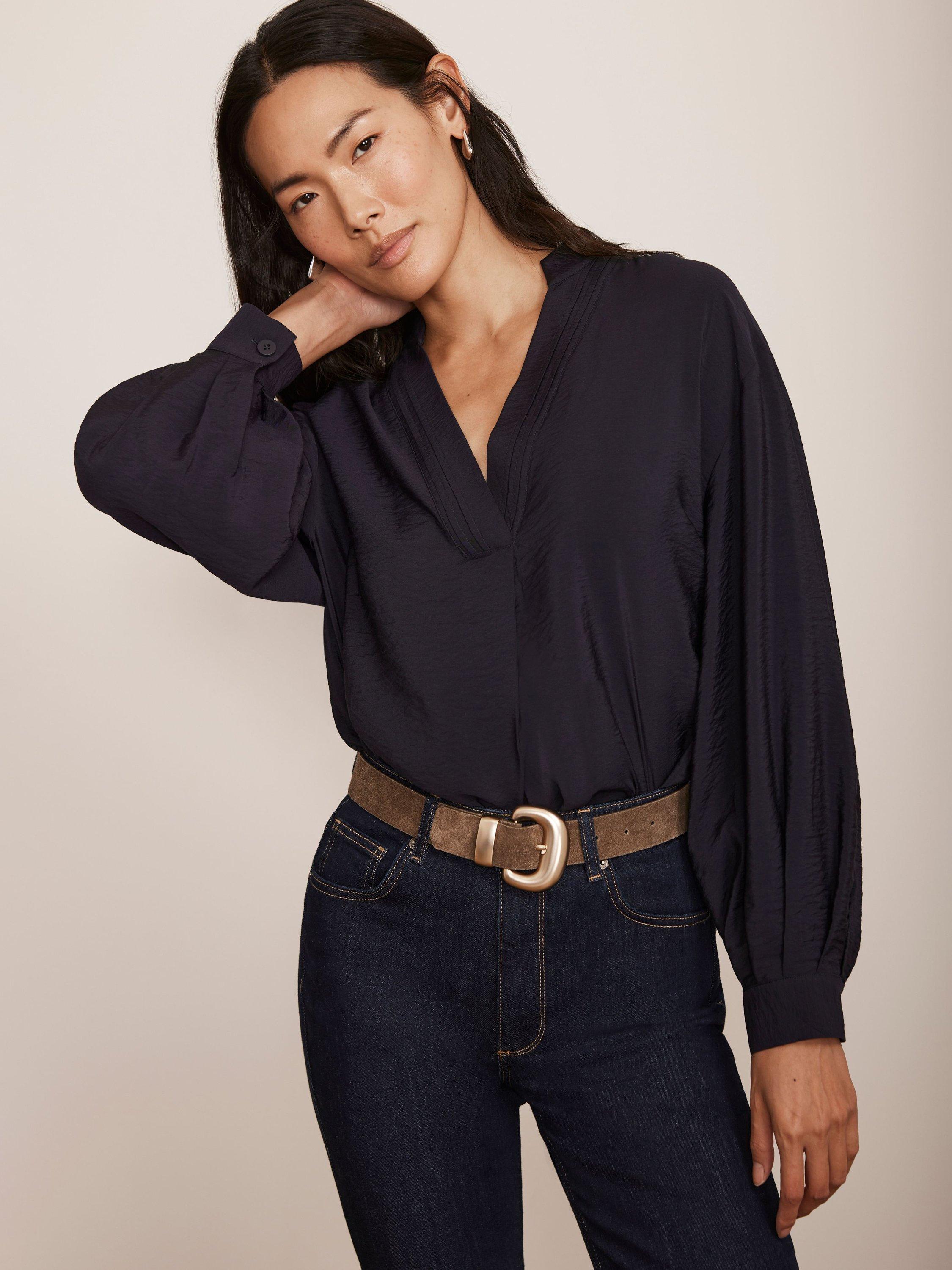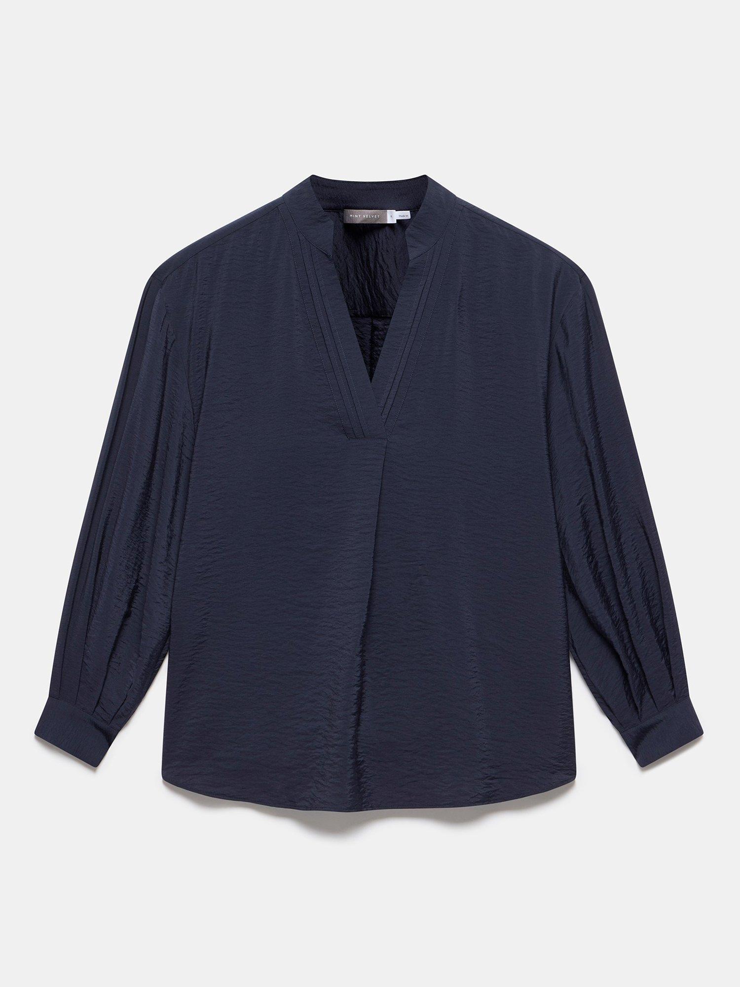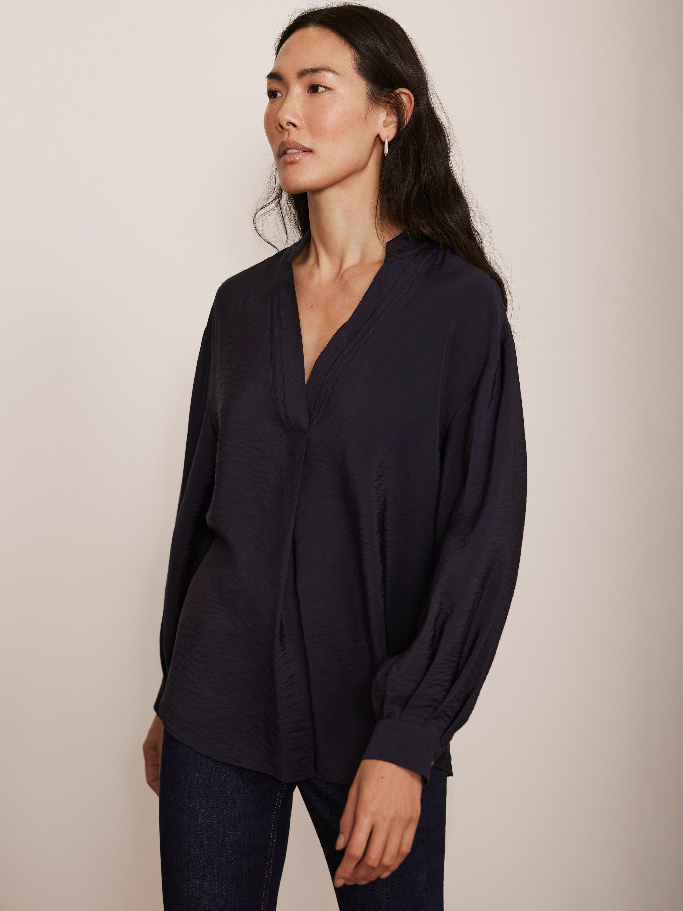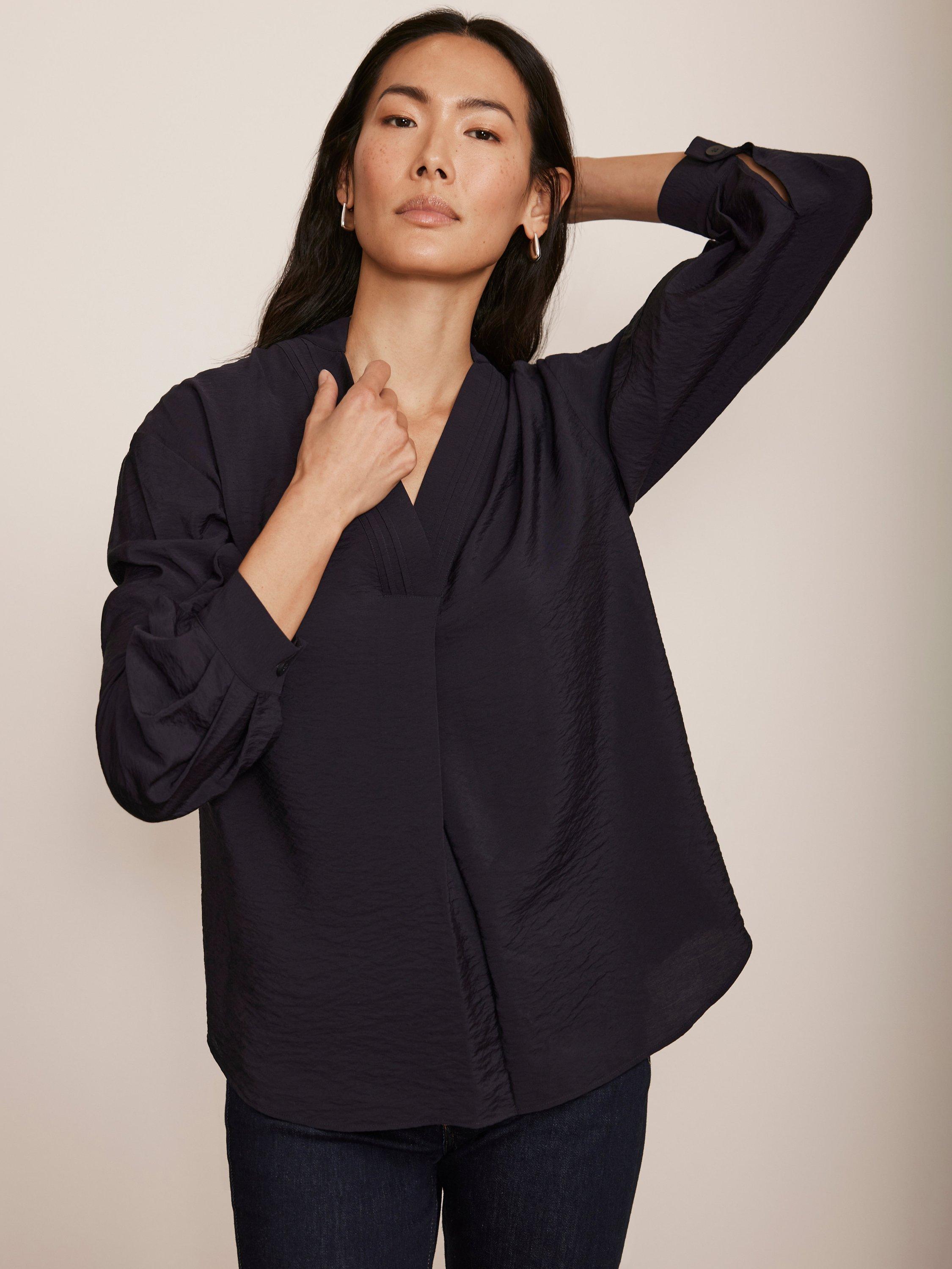 A blouse with a V-neckline, long sleeves, buttoned cuffs and pleat detailing.